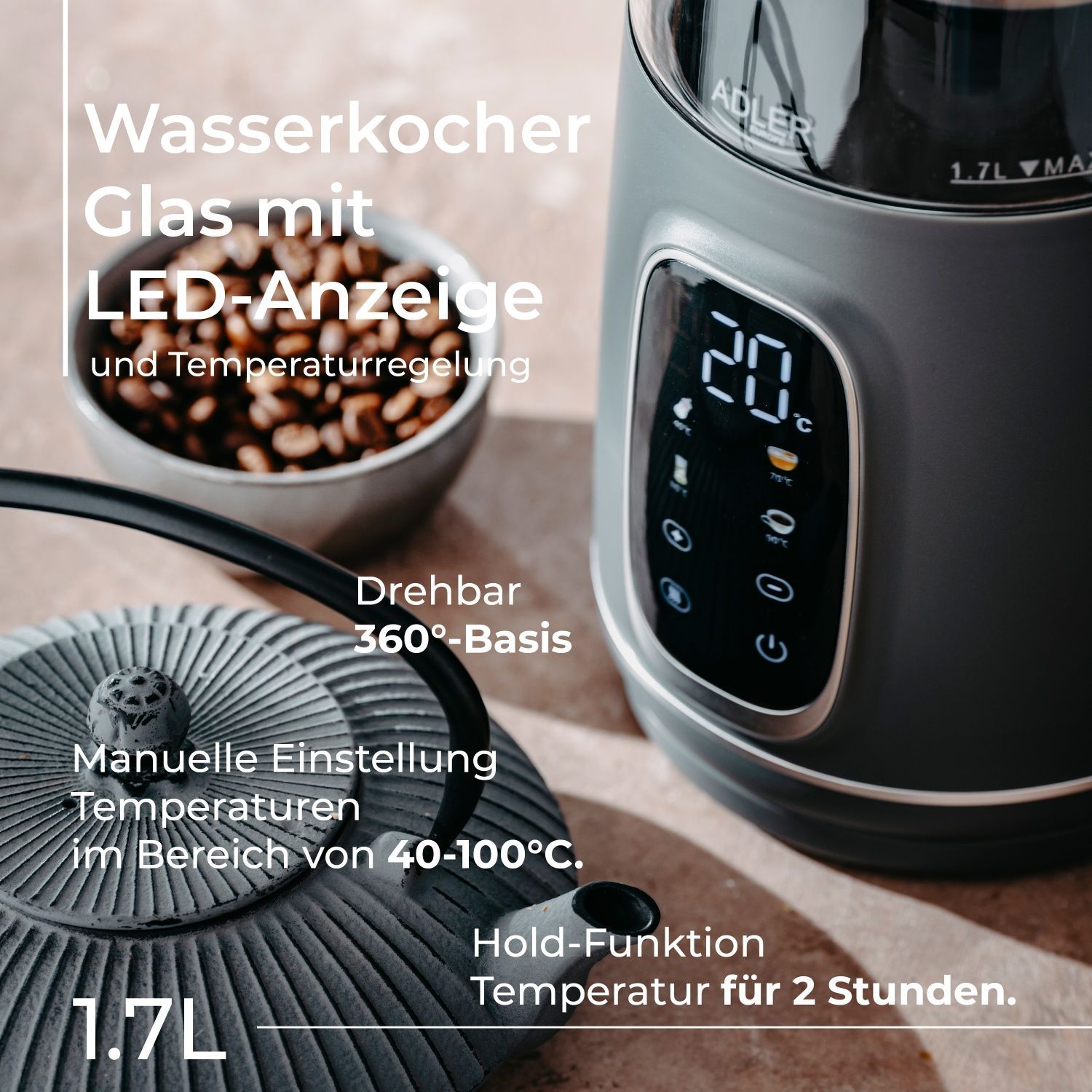 Adler Adler AD 1305 GS Wasserkocher 2200 W - 5 Temperatureinstellungen, 360°-Sockel