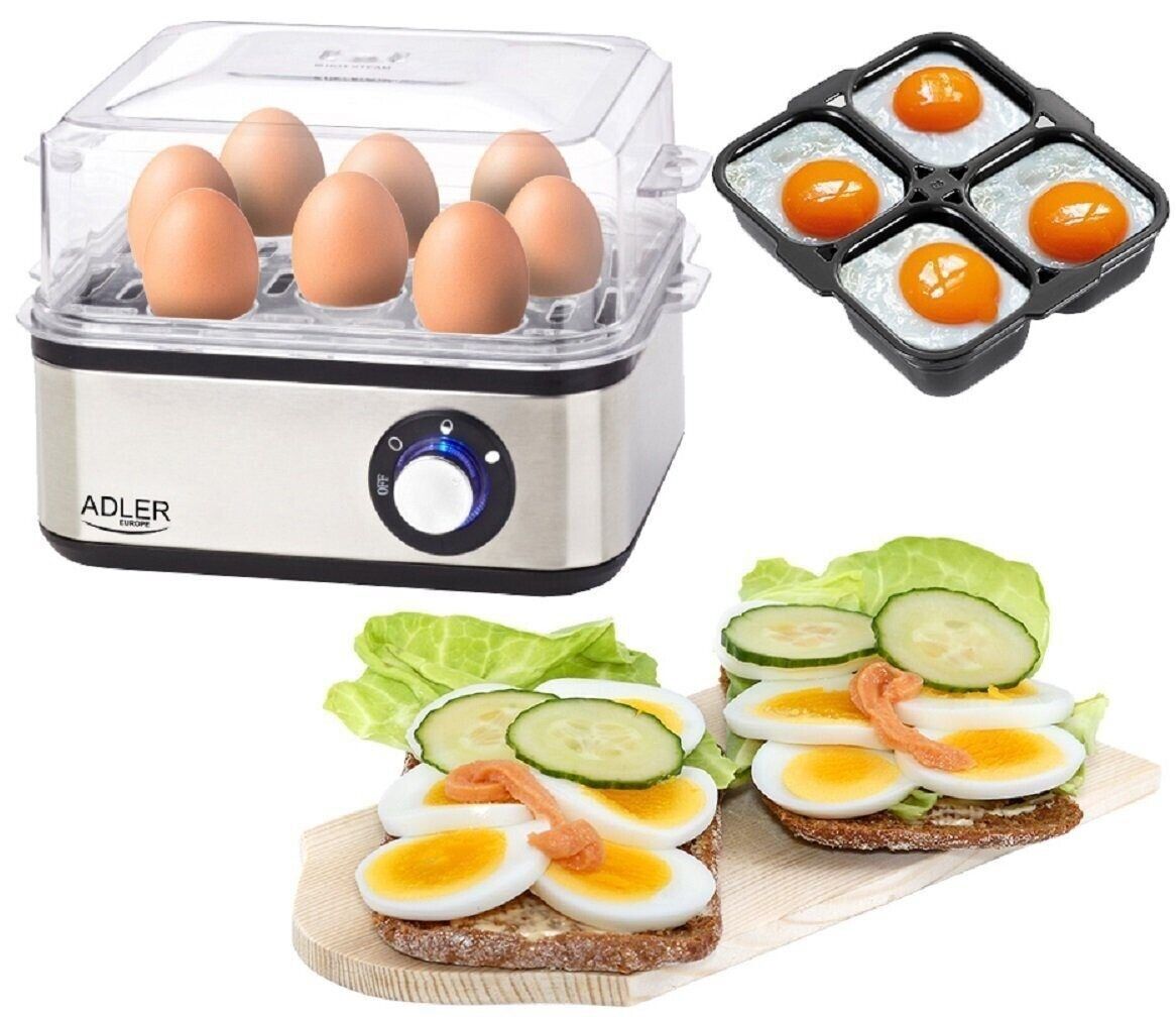 ADLER AD4486 Edelstahl Eierkocher, bis 8 Eier, 800W, ierstecher, Messbecher
