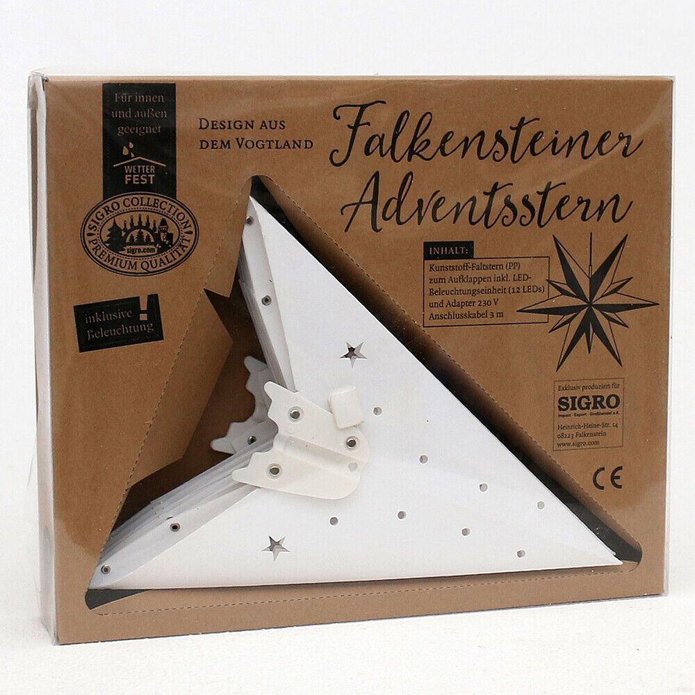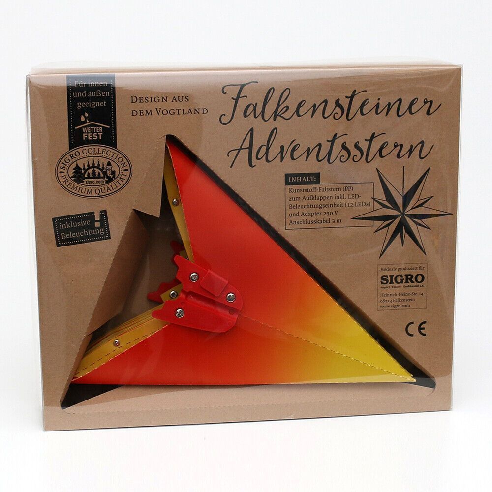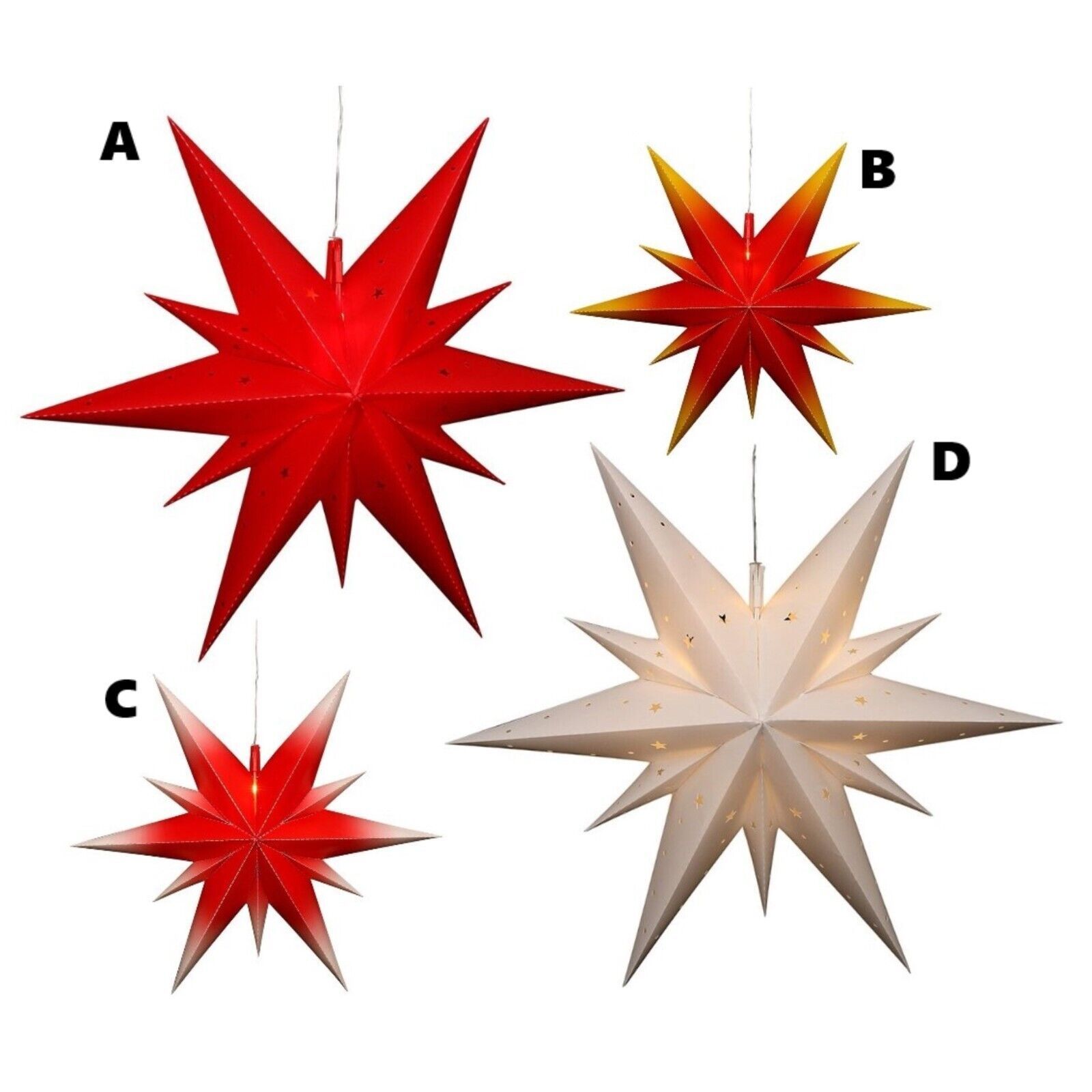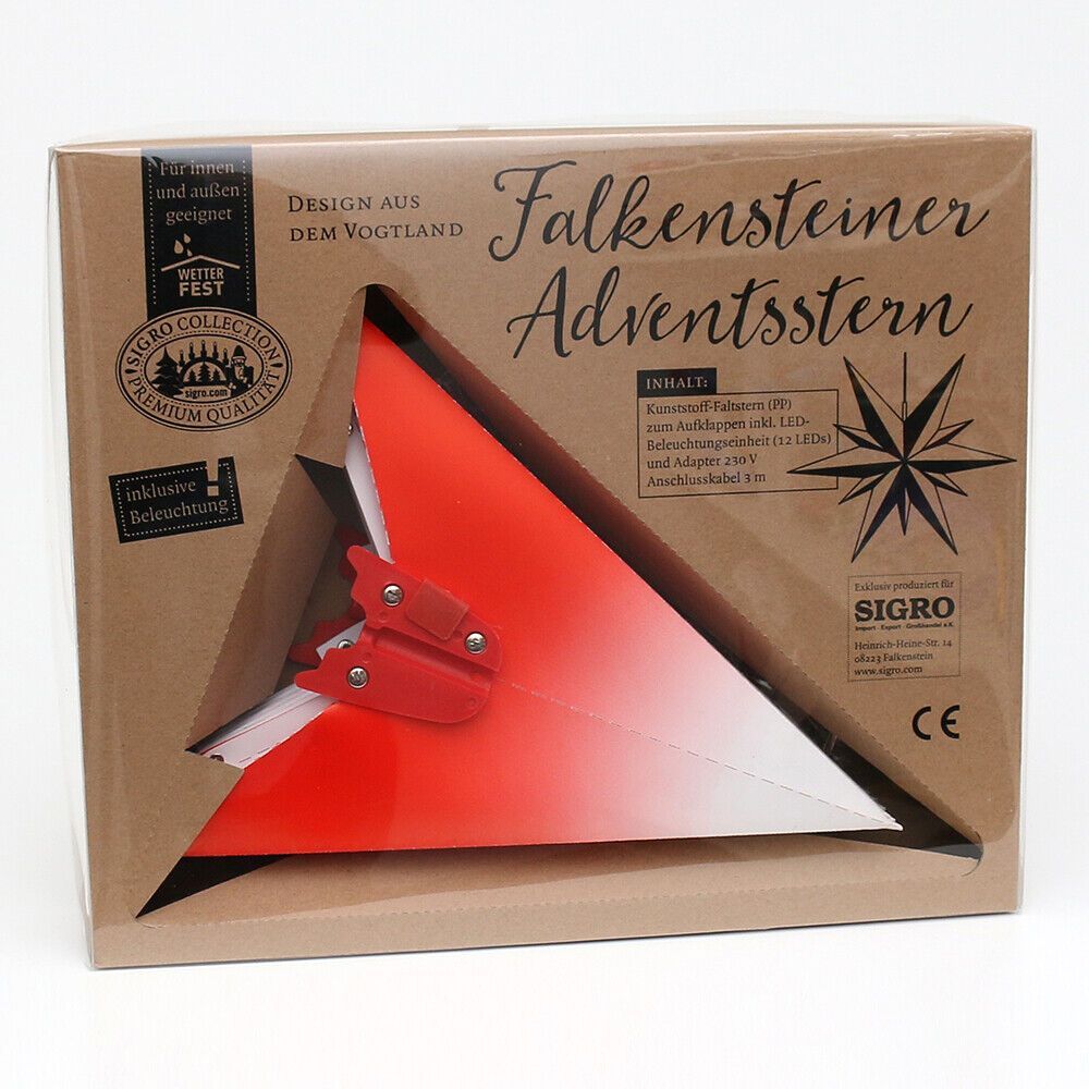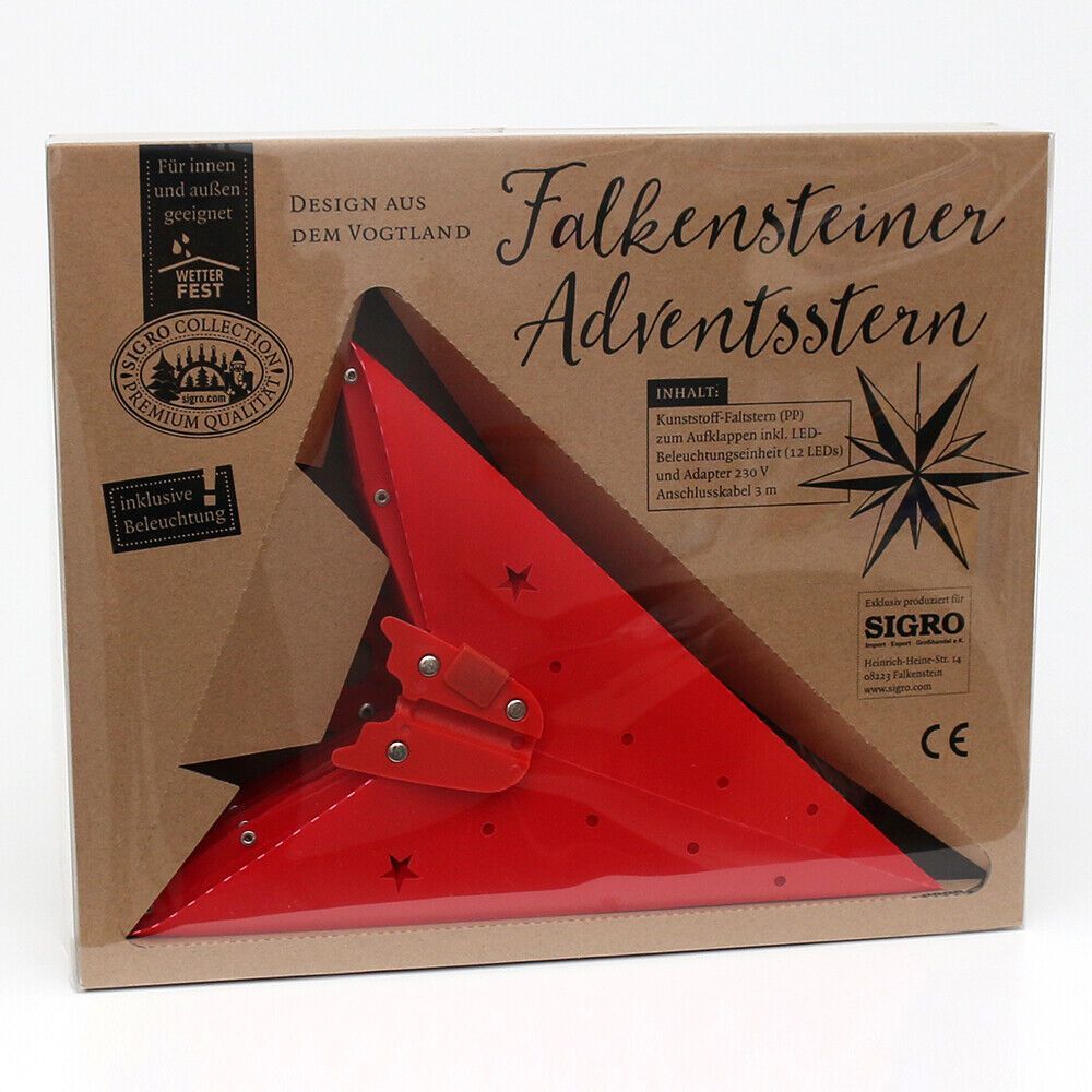 Perfekt für Ihre Winter- & Weihnachtsdekoration: - ADVENTSSTERN - FENSTERSTERN Kunststoff 11 Spitzen zum Aufklappen Maße: 60 x 19 x 60 cm inkl. Adapter (4,5 V) wetterfest - für außen geeignet Farben: A - rot B - rot-gelb C - rot-weiß D - weiß Bei Fragen kontaktieren Sie uns gern.