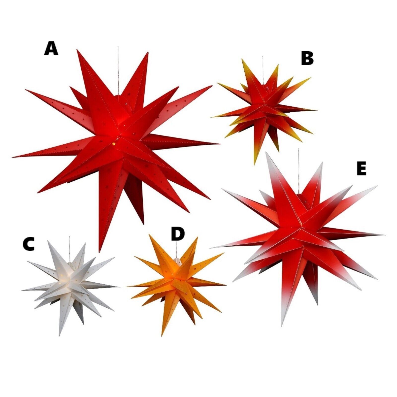 Perfekt für Ihre Winter- & Weihnachtsdekoration: - ADVENTSSTERN - FENSTERSTERN Kunststoff 18 Spitzen zum Aufklappen Maße: 80 x 80 x 80 cm inkl. Adapter (4,5 V) wetterfest - für außen geeignet Farben: A - rot B - rot-gelb C - weiß D - gelb E - rot-weiß Bei Fragen kontaktieren Sie uns gern.