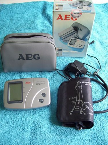 Sie schauen sich hier ein gebrauchtes aber gut erhaltenen und einwandfrei funktionierendes Blutdruckmessgerät an von AEG Model BMG4907 mit Originalverpackung und Aufbewahrungstasche (die Tasche ist am Zipper aber defekt) sowie Batterien 4x 1,5V und Netzteil. Es kann elektrisch betätigt werden - es h