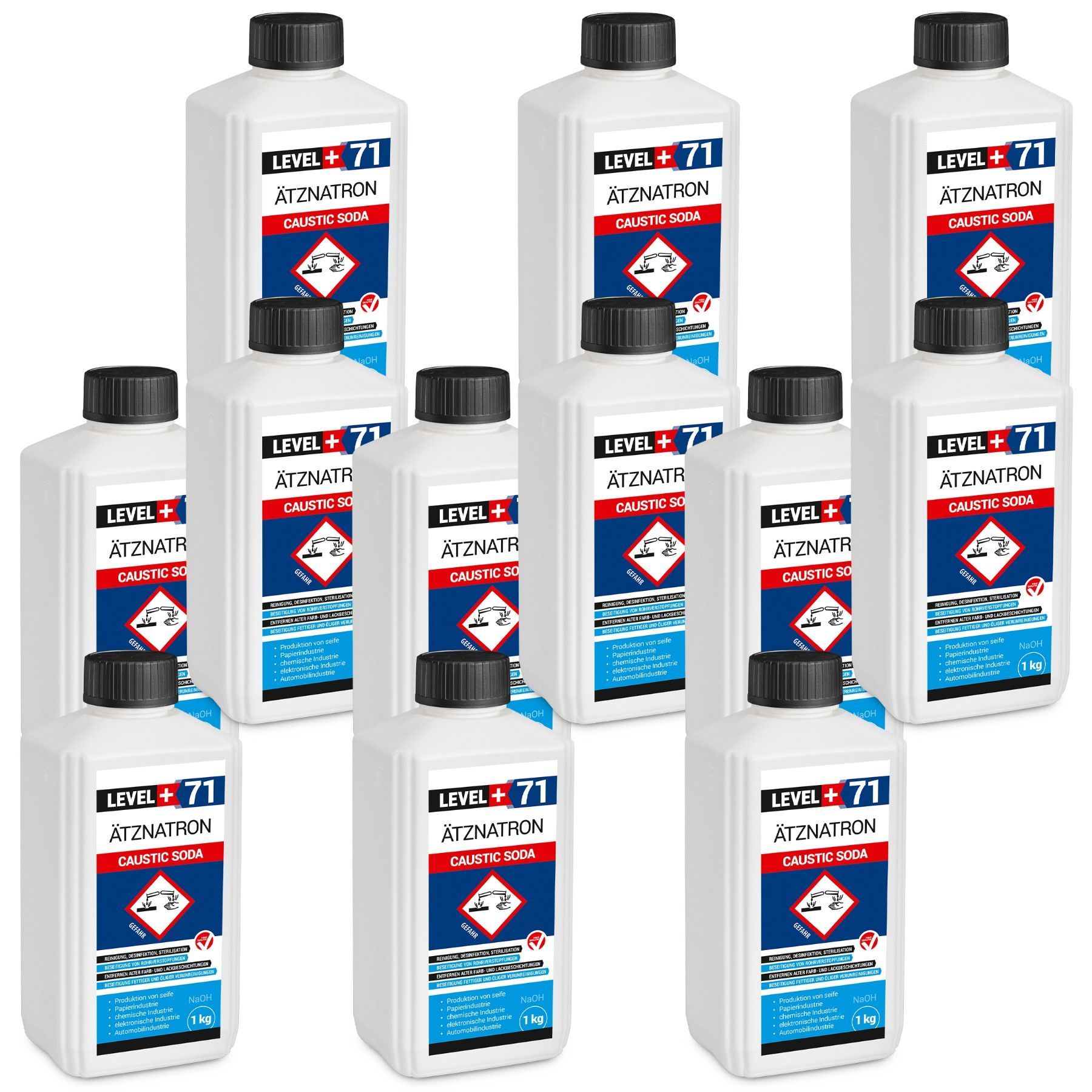 Ätznatron Flasche 12x1kg Natriumhydroxid Kaustisches Soda NaOH LEVEL PLUS L+71