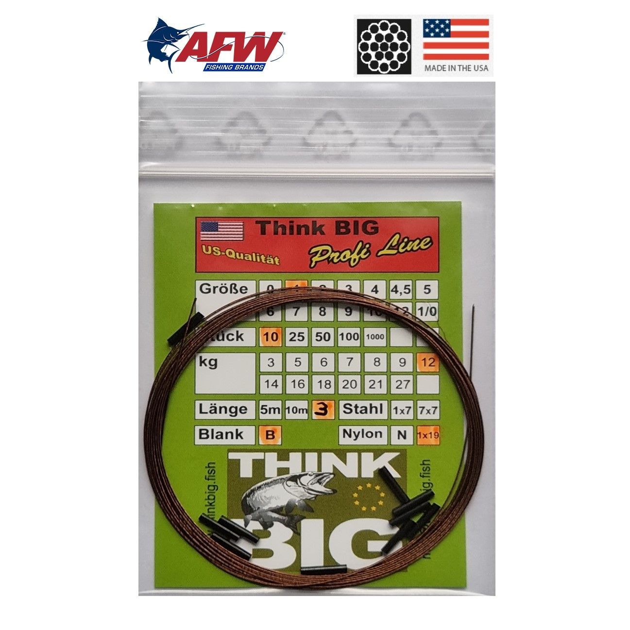 AFW Stahlvorfach zum Fertigen von Raubfischvorfächern ? 1x19 Surfstrand Micro Ultra ? 12 kg Tragkraft ? 3 Meter Ring ? Camo braun und Blank ? mit 10 Quetschhülsen Gr. 1