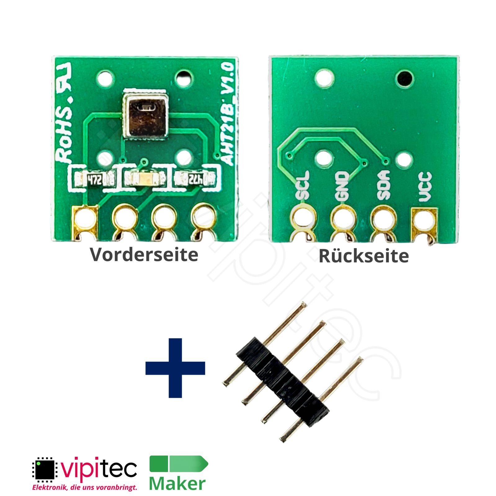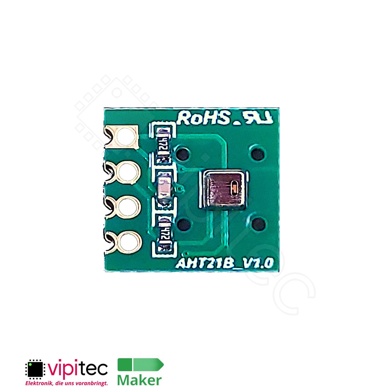 Warenkorb vipitec Shop Aktuelle Angebote Kontakt Komponenten > Sensoren AHT21B - I2C-Sensor für Temperatur und Luftfeuchtigkeit Spezifikation: AHT21B, 2,2..5,5 V, I2C In unserem Shop finden Sie weitere Sensoren . Dieses Produkt ist ein elektronischer Sensor, der in der Lage ist, die Temperatur so