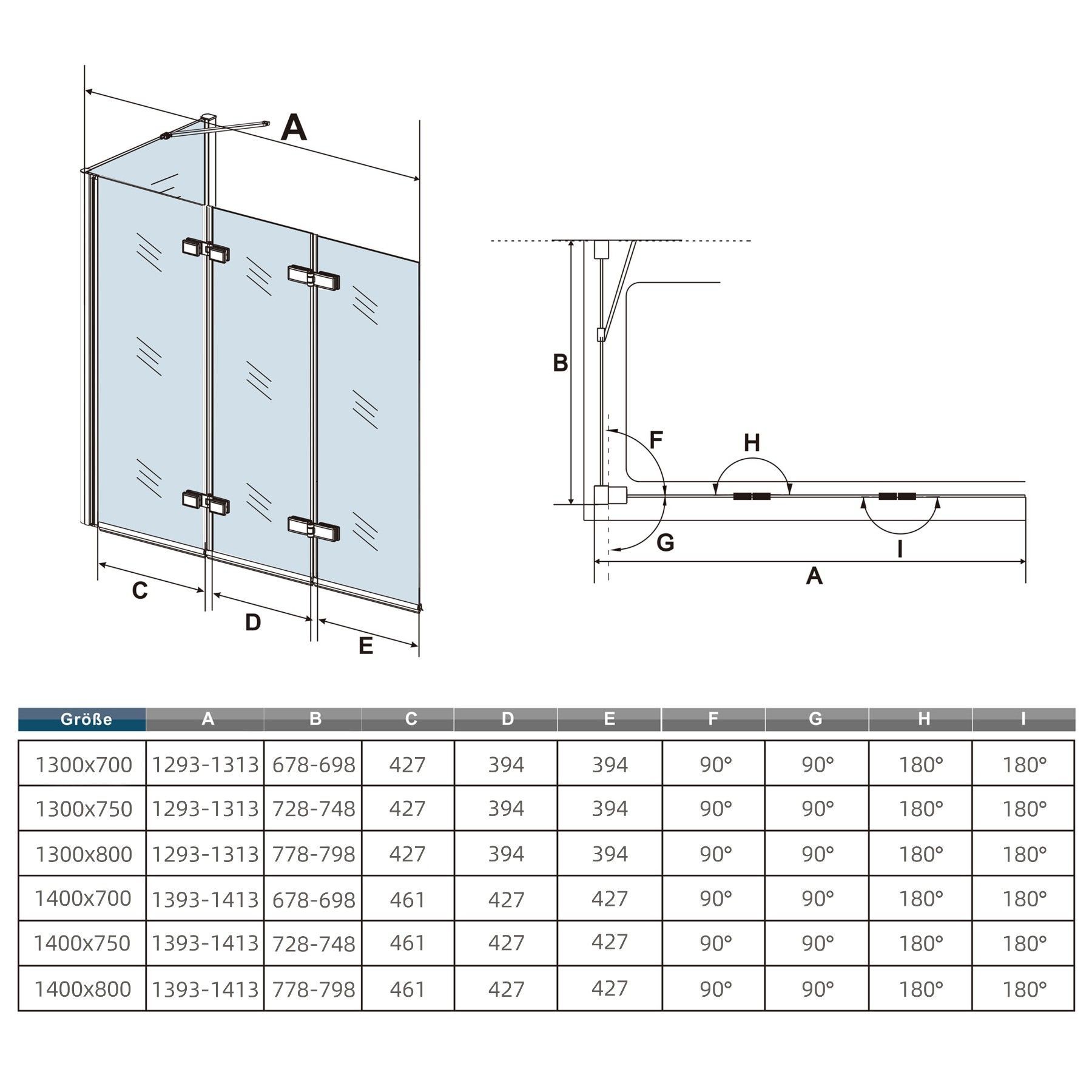 AICA Badewanneaufsatz 130cm 3 teilig Faltwand mit 70cm Seitewand für Badewanne