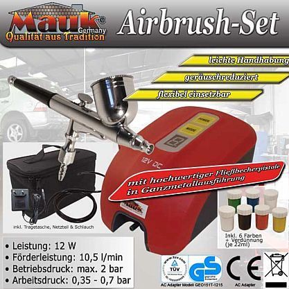 Mobiles Mauk Airbrush Set mit allem, was man für den sofortigen Einstieg benötigt wird. Anschliessen, Farbe einfüllen, Motiv ausdenken und loslegen. ideal für den Einstieg hochwertige Fliesbecherpistole in Ganzmetallausführung wartungsfreier Kompressor 5 verschiedene Leistungsstufen leichte Handhabu