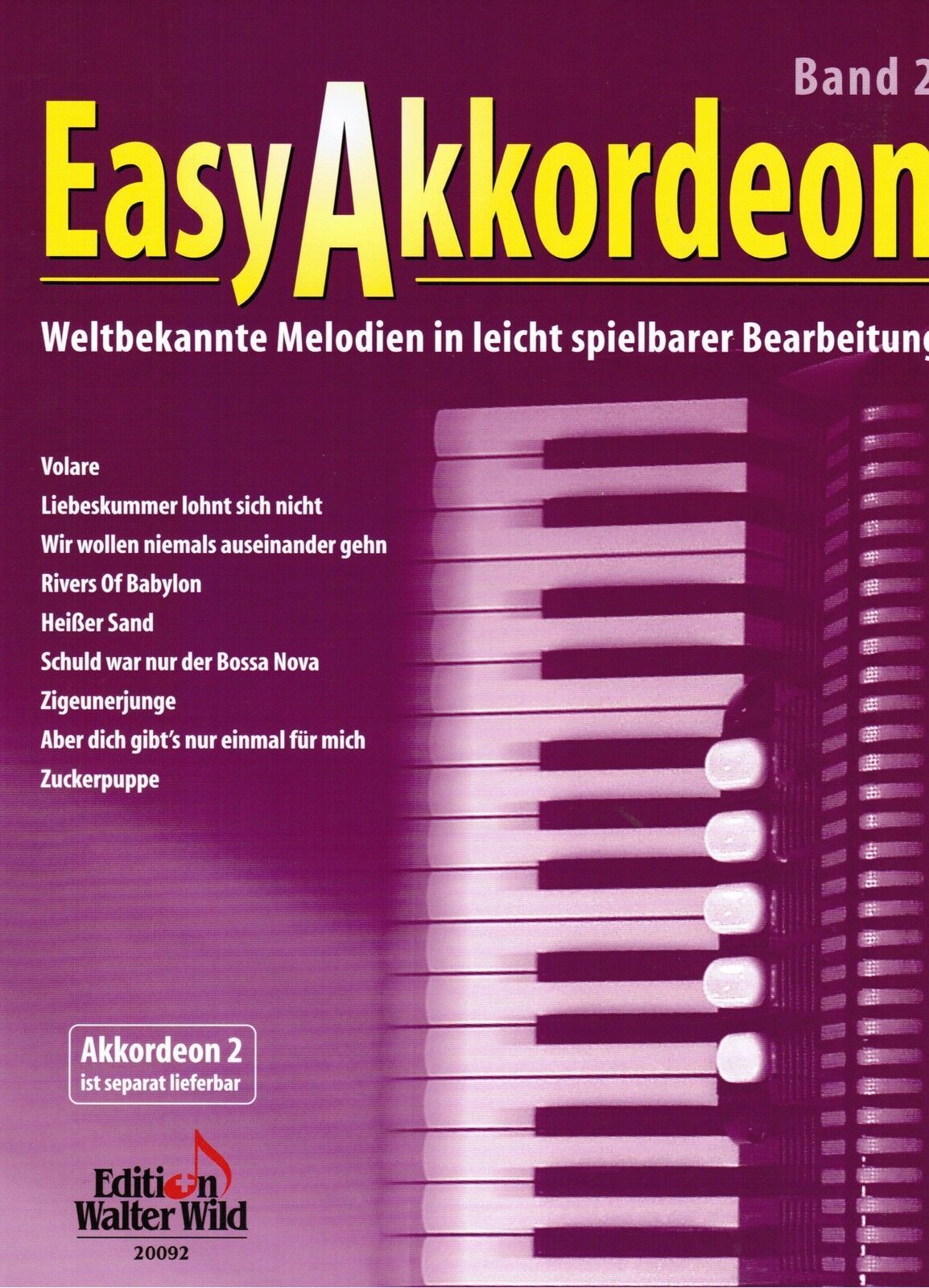 Easy Akkordeon Band 2 Weltbekannte Melodien Ausgabe für Akkordeon Bekannte Melodien in leicht spielbarer Bearbeitung Verlag : Edition Wild 20092 Seitenanzahl: 23 Zustand: NEUWARE Schwierigkeitsgrad : leichte Mittelstufe (meine pers. Einschätzung) Inhalt: Texte stehen mit dabei Volare Liebeskummer lo