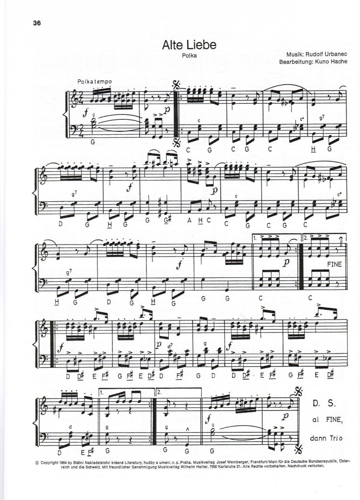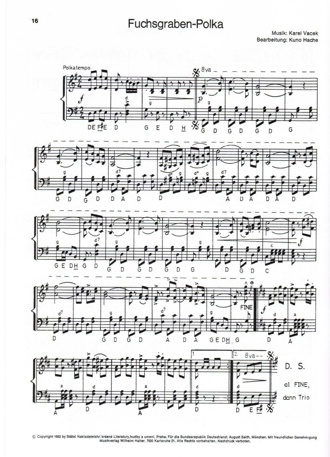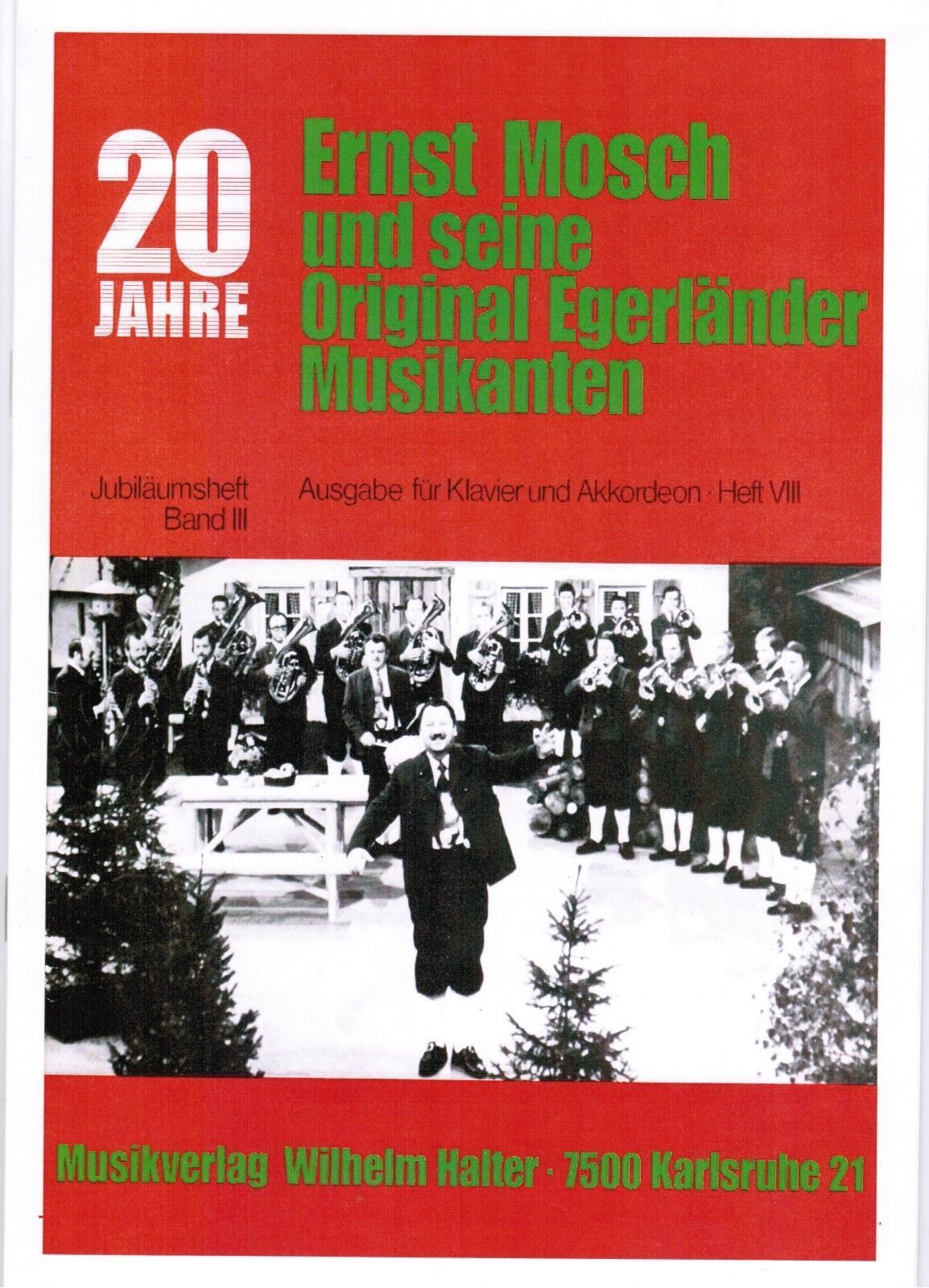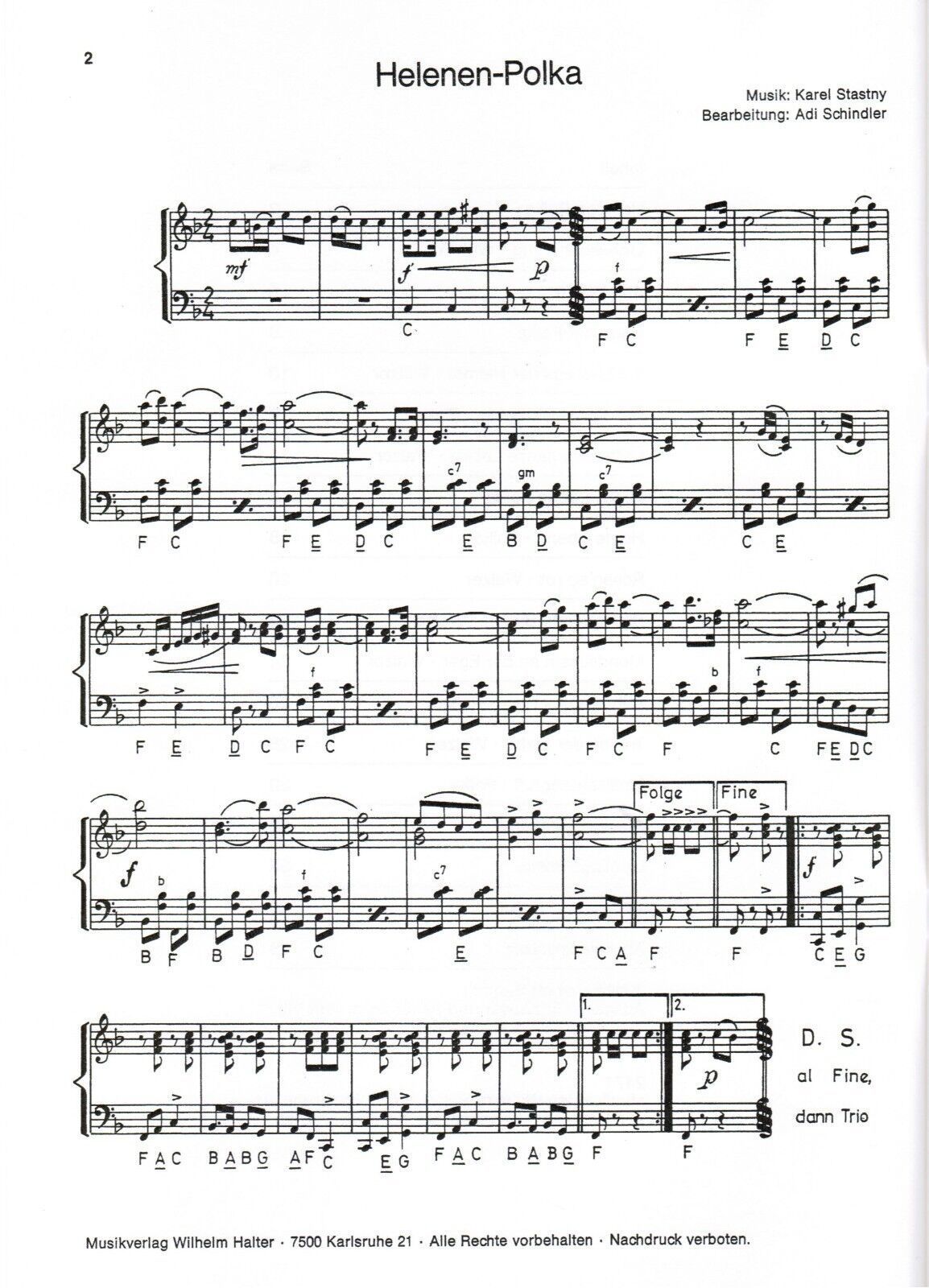 20 Jahre Ernst Mosch und seine Original Egerländer Musikanten Jubiläumsheft Band 3 (= Ausgabe für Klavier und Akkordeon Heft VIII) Ausgabe für Akkordeon Klavier Verlag : Halter Verlag Seitenanzahl: 39 Zustand: NEUWARE Schwierigkeitsgrad : Mittelschwer (meine pers. Einschätzung) Inhalt: Helenen-Polka