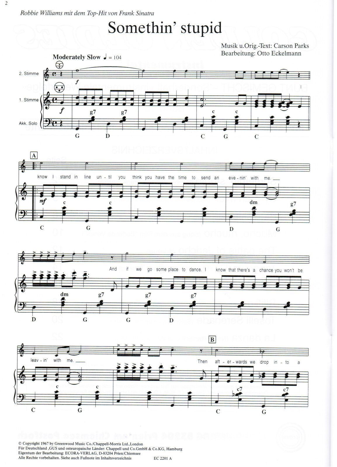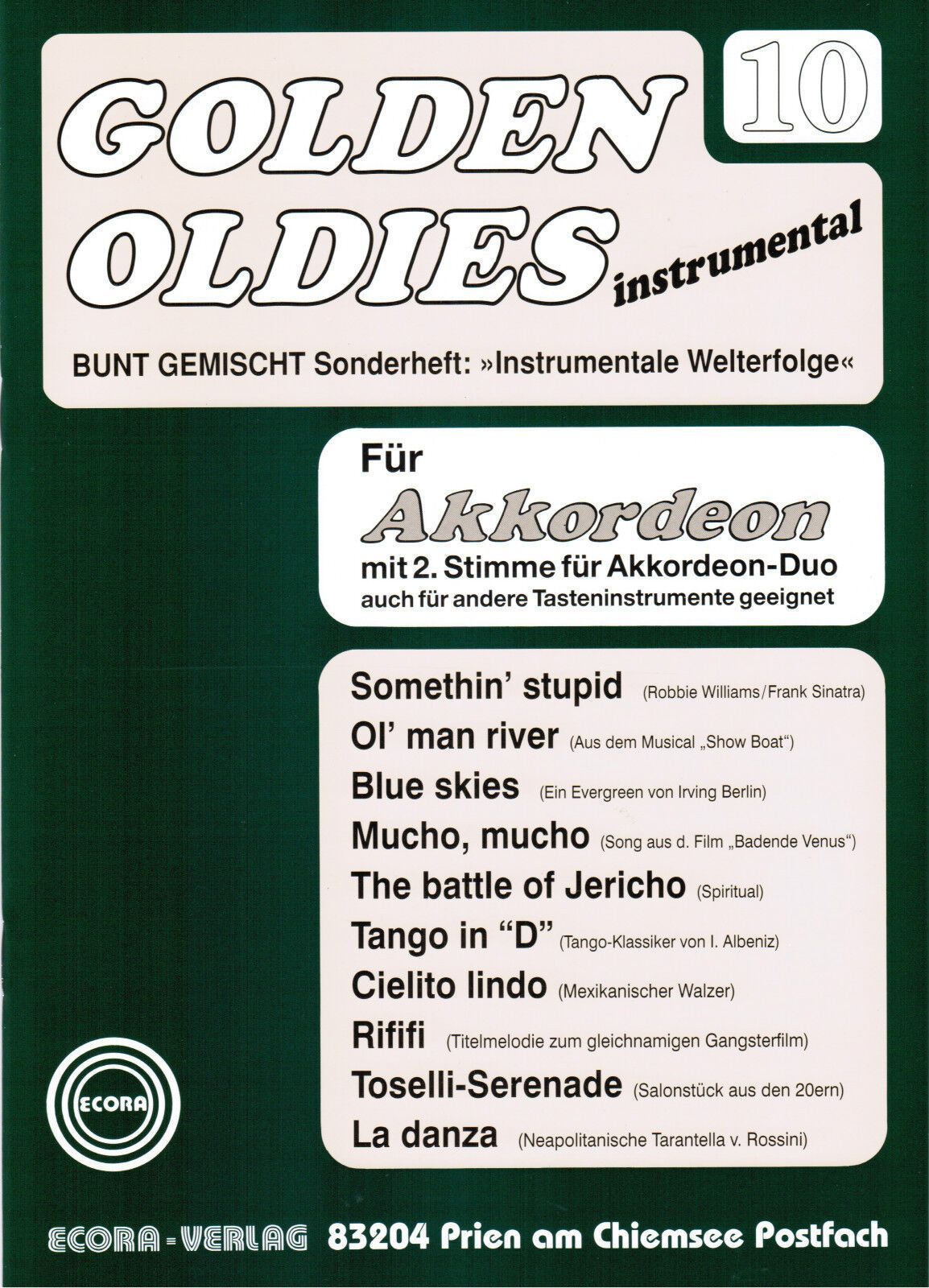 Golden Oldies Heft 10 Ausgabe für Akkordeon mit 2. Stimme für Akkordeon-Duo (auch für andere Tasteninstrumente geeignet) Verlag : Ecora Verlag Seitenanzahl: 24 Zustand: NEUWARE Schwierigkeitsgrad : mittelschwer (meine pers. Einschätzung) Inhalt: Somethin' Stupid Ol' man river Blue Skies Mucho, mucho