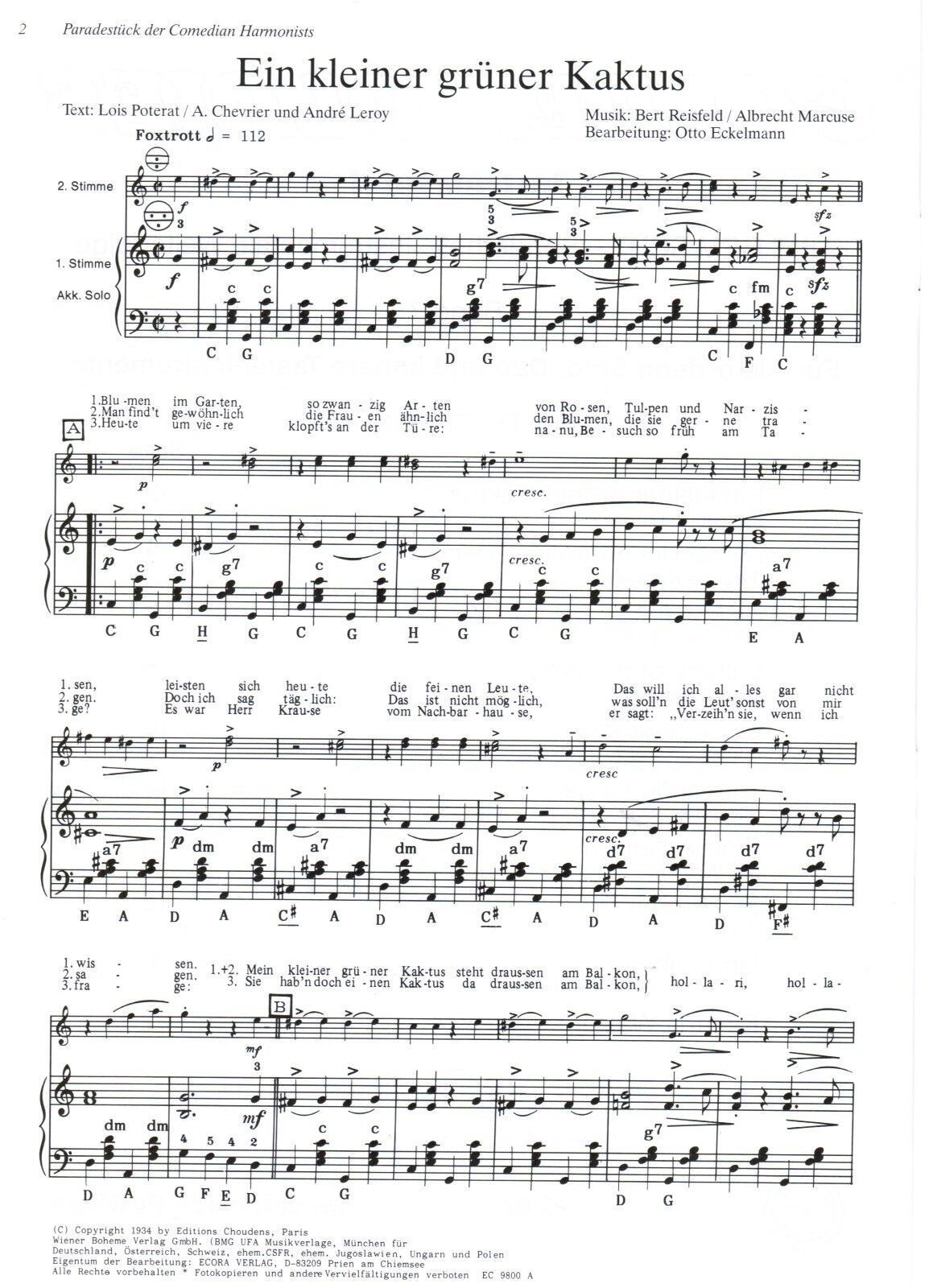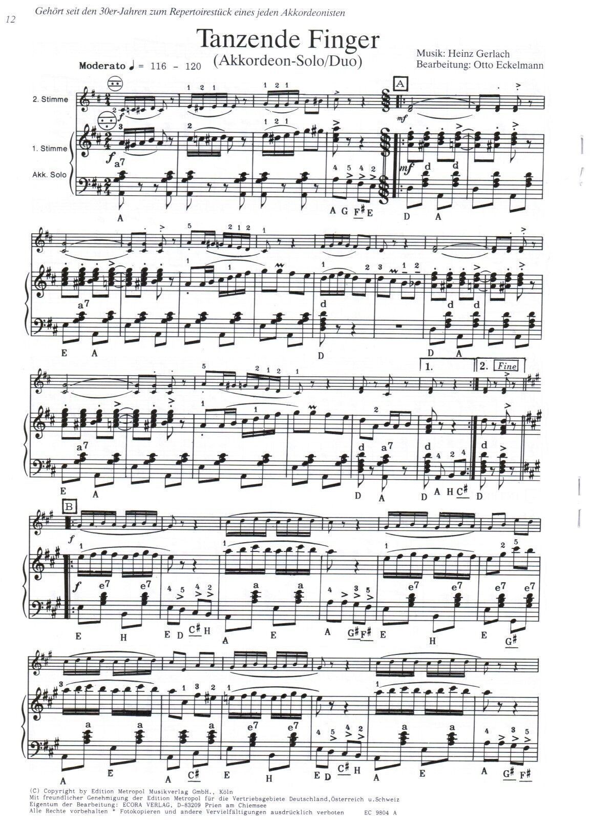 Golden Oldies Heft 7 Ausgabe für Akkordeon mit 2. Stimme für Akkordeon-Duo ( ad. lib.) - (auch für andere Tasteninstrumente geeignet) Verlag : Ecora Verlag Seitenanzahl: 24 Zustand: NEUWARE Schwierigkeitsgrad : mittelschwer (meine pers. Einschätzung) Inhalt: Ein kleiner grüner Kaktus Alexander's Rag