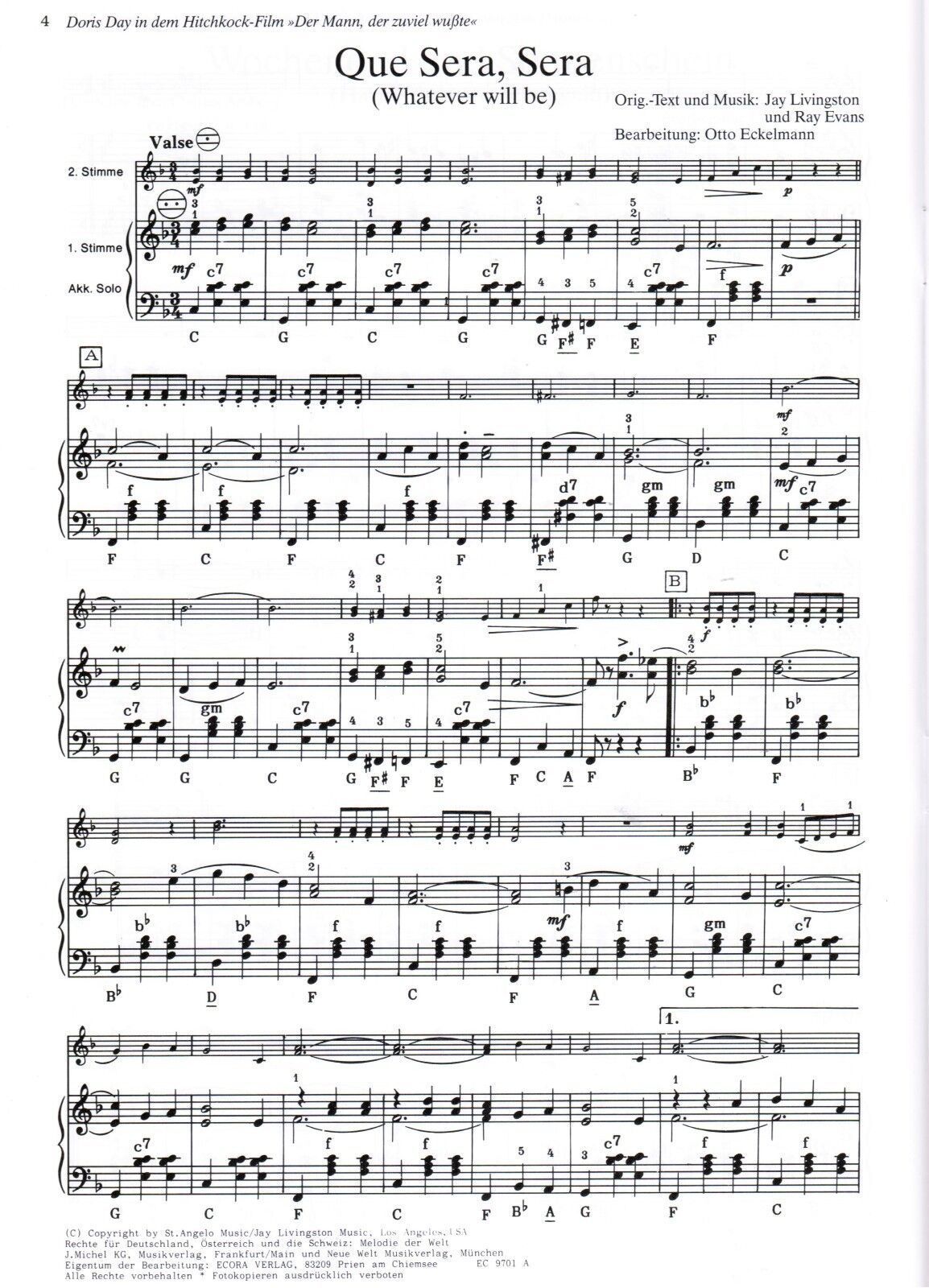 Golden Oldies Heft 6 Ausgabe für Akkordeon mit 2. Stimme für Akkordeon-Duo (auch für andere Tasteninstrumente geeignet) V erlag : Ecora Verlag Seitenanzahl: 24 Zustand: NEUWARE Schwierigkeitsgrad : mittelschwer (meine pers. Einschätzung) Inhalt: Wochenend und Sonnenschein Que Sera, Sera (Aus dem Hit
