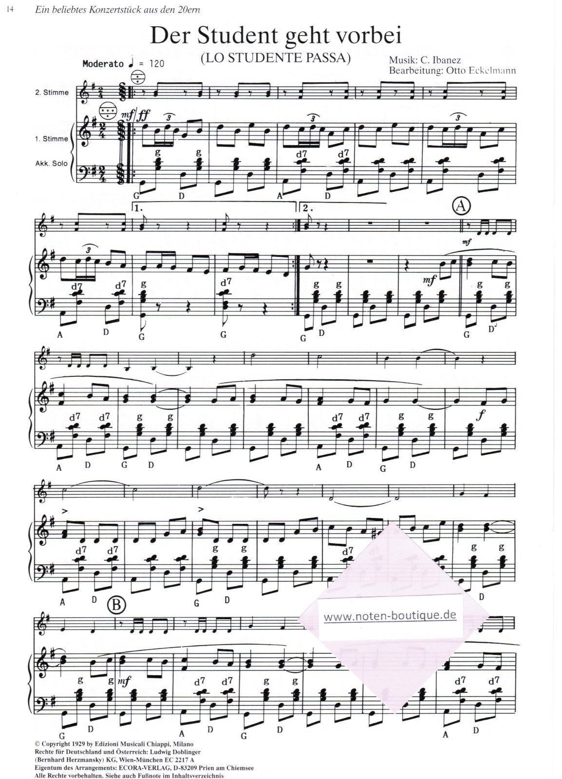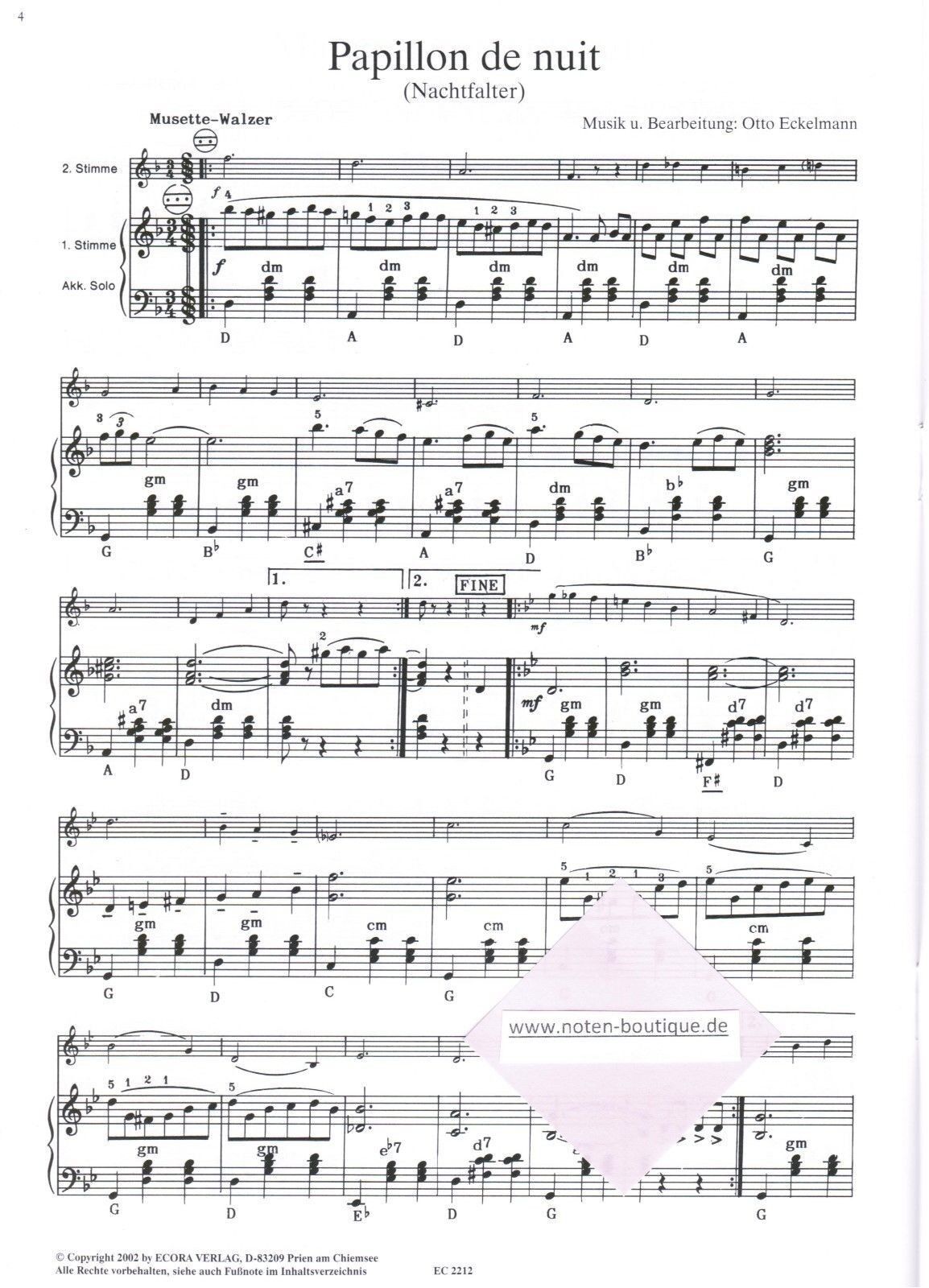 Musette Festival Heft 3 Eine Auslese weltbekannter Originale und neuer Kompositionen Ausgabe für Akkordeon mit überlegter 2. Stimme für Akkordeon-Duo (ad.lib.) Verlag : Ecora Verlag Seitenanzahl: 16 Zustand: NEUWARE Schwierigkeitsgrad : mittelschwer (meine pers. Einschätzung) Inhalt: Mademoiselle de