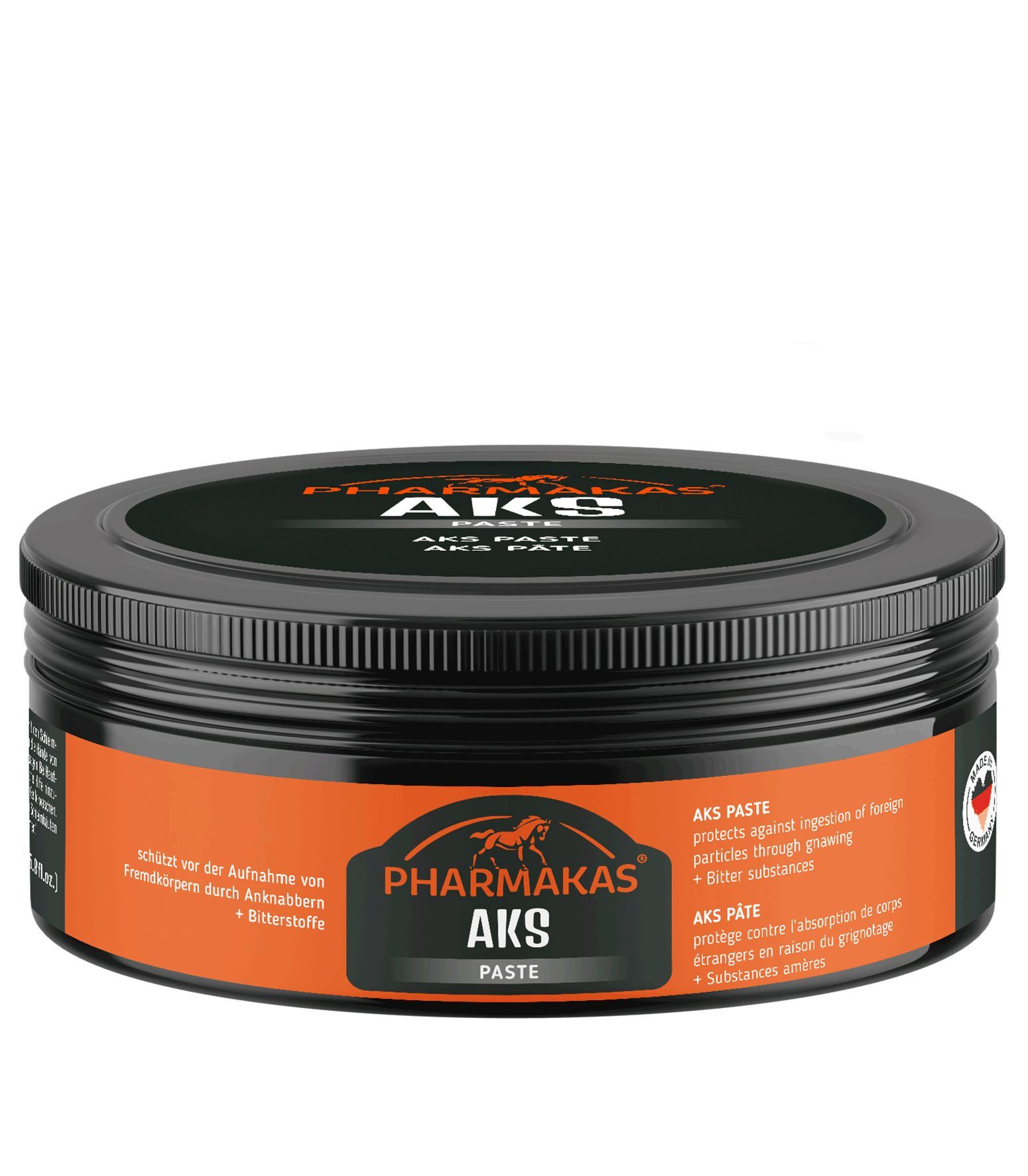 Pharmakas® AKS Paste enthält Bitterstoffe und schützt die Pferde somit effektiv vor der Aufnahme von Fremdkörpern und verhindert somit ernsthafte Verletzungen oder Erkrankungen (z. B. Koliken). Zudem wirkt AKS unterstützend gegen das Krippensetzen (Koppen). Der eingesetzte Bitterstoff ist für Me