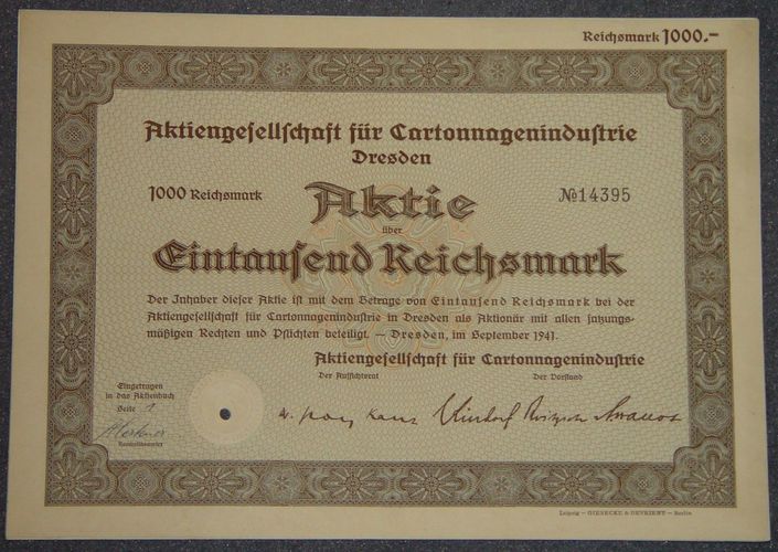Aktiengesellschaft für Cartonnagenindustrie Dresden 1941 1000 RM
