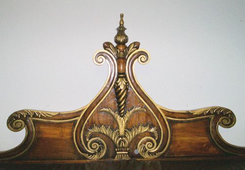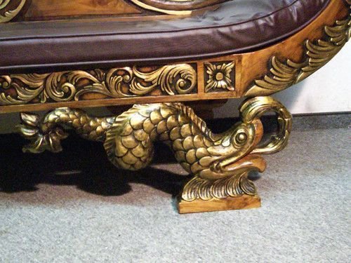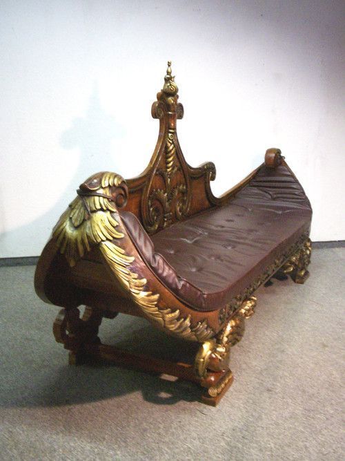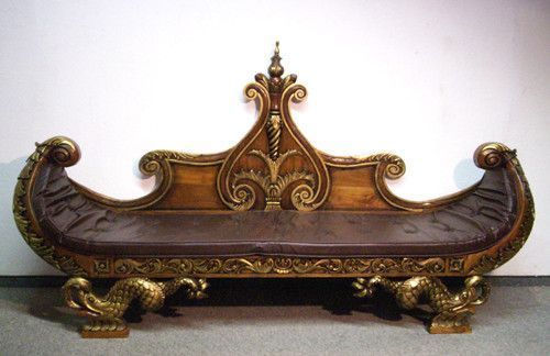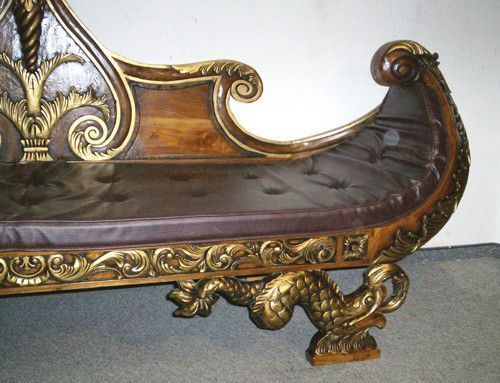 Ausgefallen und sehr wirkungsvoll ist diese prunkvolle Sitzbank Sofa. In einer aussergewöhnlichen, gondelförmige Formgestaltung und mit wunderschönen Verzierungen, die sich goldfarben vom Nussbaumgrundton hervorheben, präsentiert sich dieses beeindruckende Möbel. Sie wurde aus Mahagoni - Holz herges