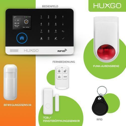 HUXGO Alarm System mit Funk Alarmsirene HXA003 2G, 5x Bewegungssensor, Smart Home Security