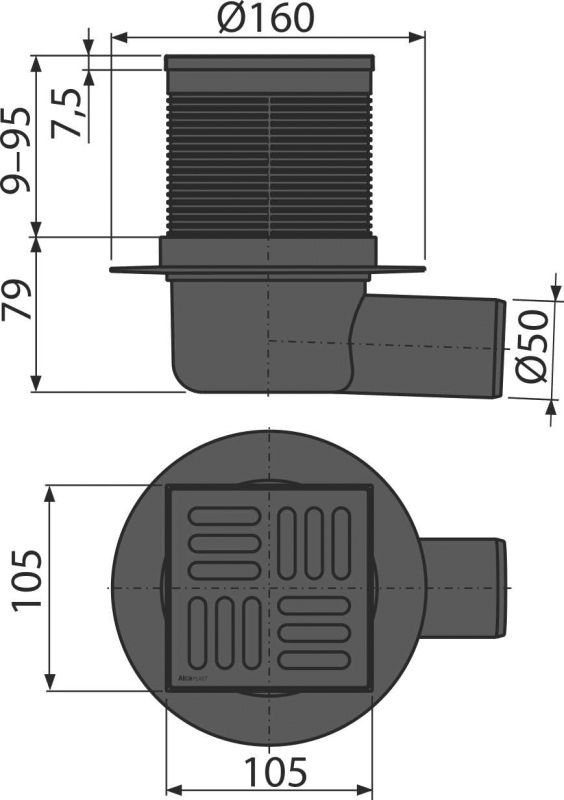 AlcaDrain Bodenablauf 105×105/50 mm mit einem waagrechten Abgang, Edelstahl Rost Schw