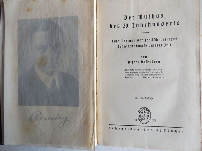 Buch von Alfred Rosenberg: Der Mythus des 20. Jahrhunderts - Eine Wertung der seelisch-geistigen Gestaltenkämpfe unserer Zeit KEINE nähere Inhaltsangabe möglich, da wir das Buch NICHT gelesen haben ! Gebunden, dunkelblaues Leinen Hoheneichen-Verlag München Von 1935 (83. - 86. Auflage, Gesamtauflage