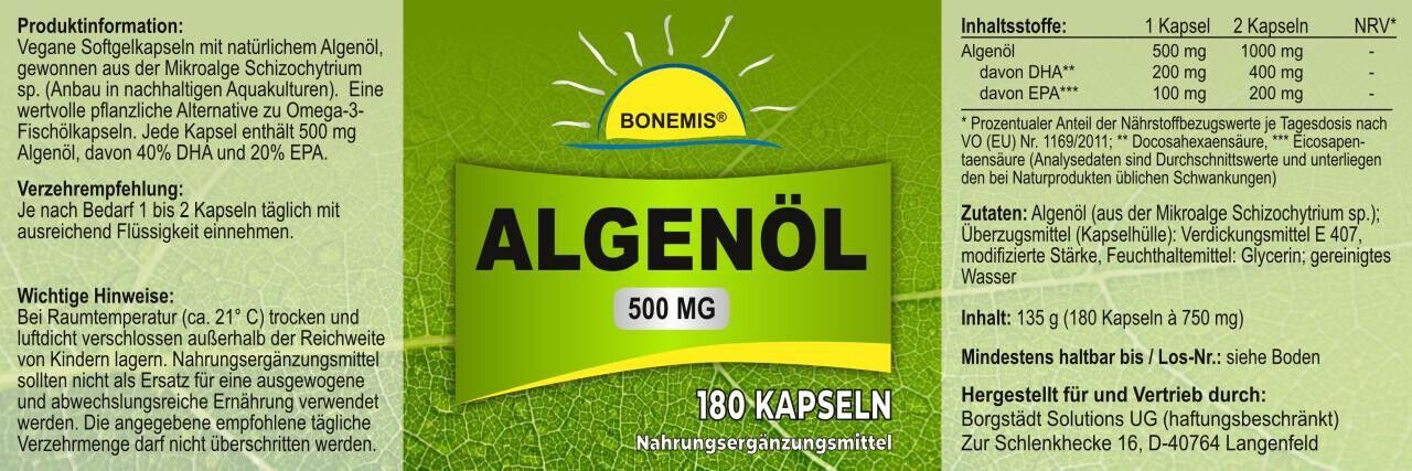 Algenöl (veganes Omega 3), 180 Softgelkapseln à 500 mg Algenöl im Glas, Bonemis®