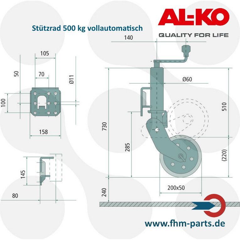 AL-KO Stützrad 500 kg halb- oder vollautomatisch Vollgummirad mit Stahlfelge Kurbel mit Drucklager halb- oder vollautomatisch klappbare Ausführung (wahlweise) mit variabler Anschraubplatte feuerverzinkt Spindelhub: 240 + 220 (halbautomatisch), 245 + 230 mm vollautomatisch Radgröße. 200 x 50 mm Stütz