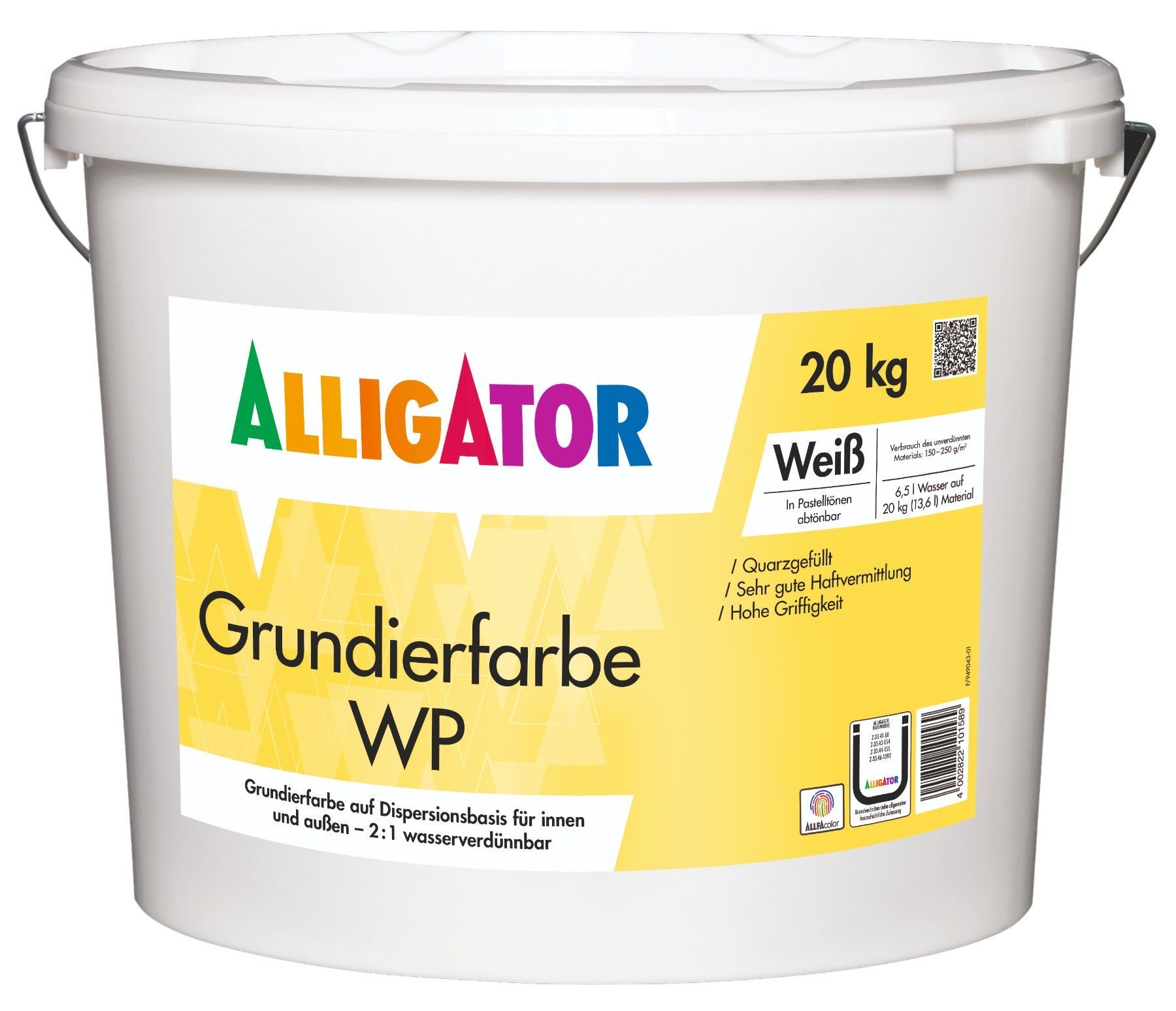 Alligator Grundierfarbe WP 20 kg weiß Details für Grundierfarbe WP 20 kg weiß: Pigmentierte Grundierfarbe auf Dispersionsbasis, 2 : 1 mit Wasser zu verdünnen. Ideal zur Untergrundverfestigung und zur Haftvermittlung nachfolgender Dispersionsfarbenanstriche und Kunstharzputze. Eigenschaften: - Weiß p