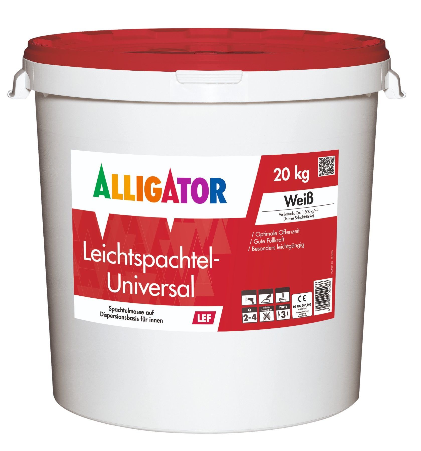 Alligator Leichtspachtel-Universal LEF 20 kg weiß Details für Leichtspachtel-Universal LEF 20 kg weiß: Leichtspachtelmasse auf Dispersionsbasis für Wand- und Deckenflächen im Innenbereich. Für die Verarbeitung mit der Kelle, dem Spritzgerät oder der Rolle. Eigenschaften: - Optimale Offenzeit - Sehr