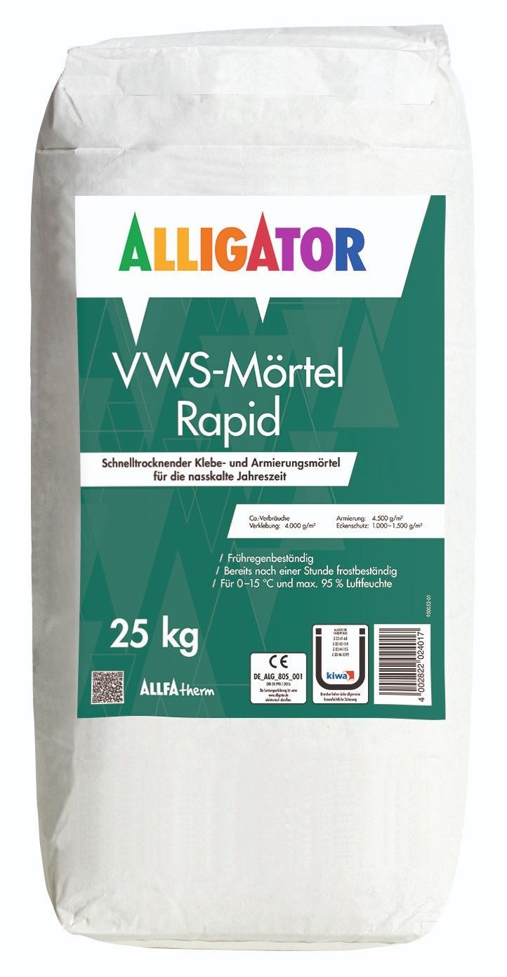 Alligator VWS-Mörtel Rapid 25 kg lichtgrau Details für VWS-Mörtel Rapid 25 kg lichtgrau: Hoch hydrophobierte, mineralische Klebe- und Spachtelmasse zum Verkleben von Mineralwolle- und Polystyrol-Dämmplatten in den ALLFAtherm-Dämmsystemen sowie zum Einbetten von Gittermatten und Eckwinkeln, speziell