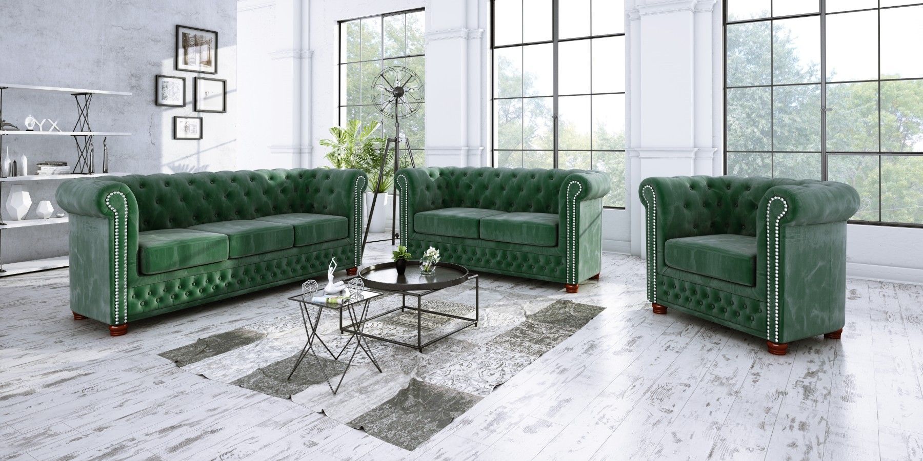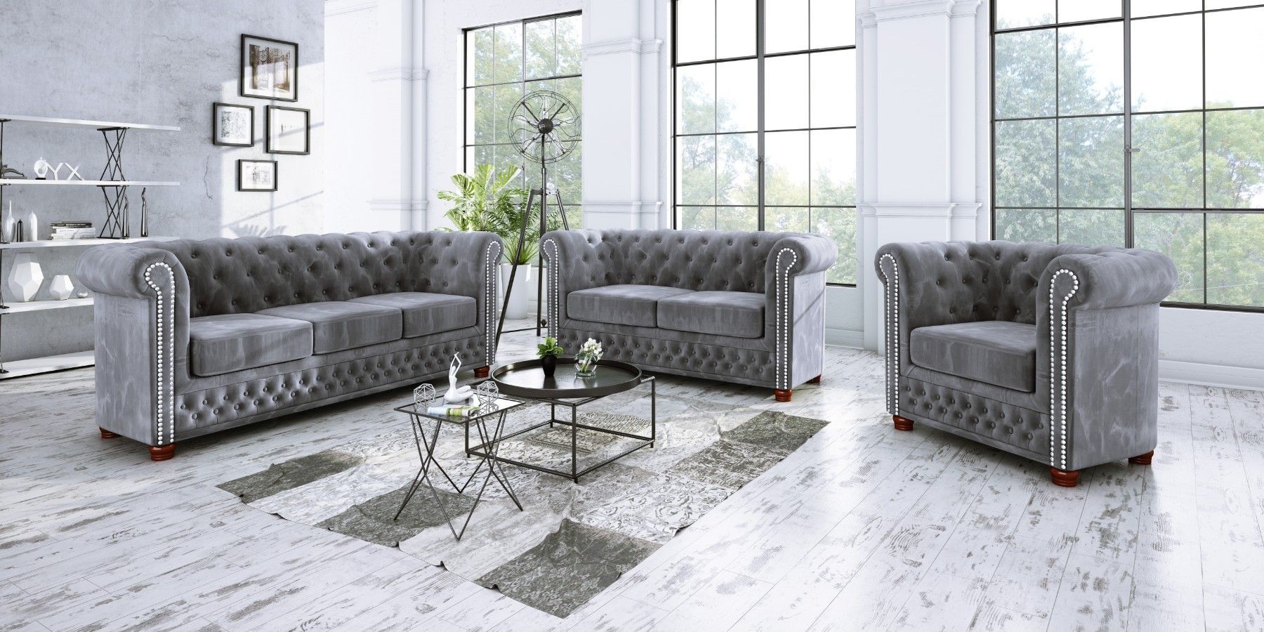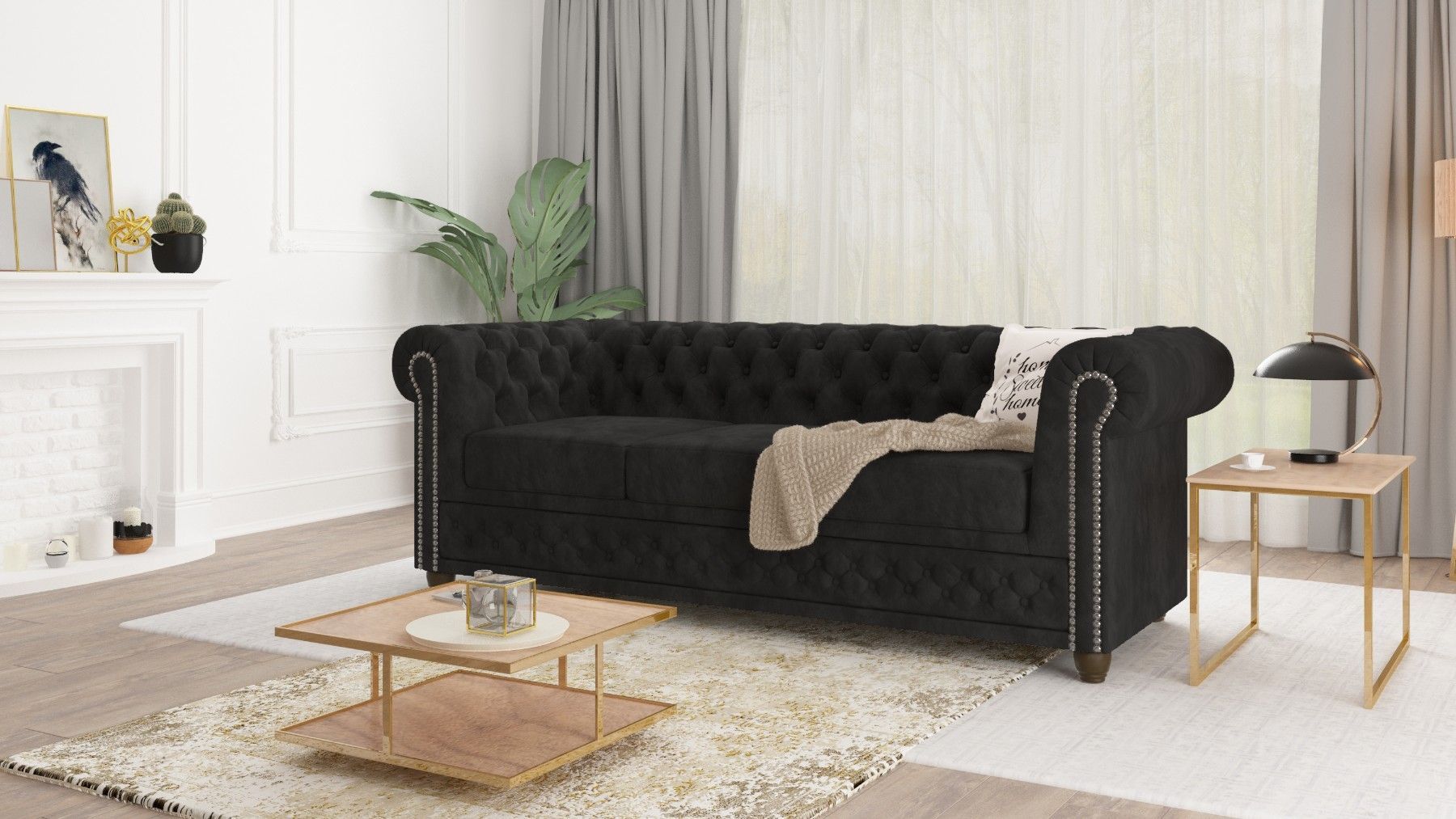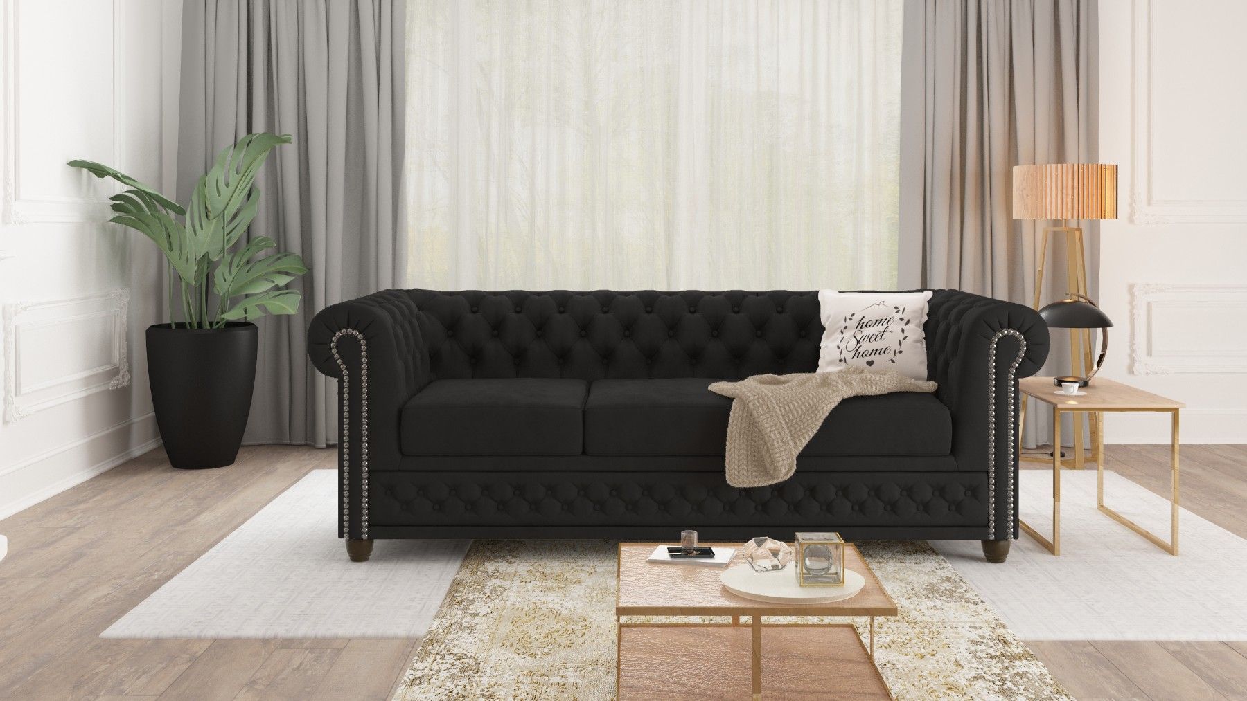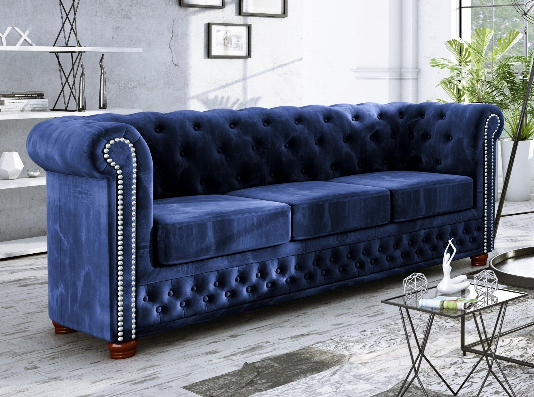 Alnem - Chesterfield Sofa 3-Sitzer aus Samt-Stoff mit Holzfüßen