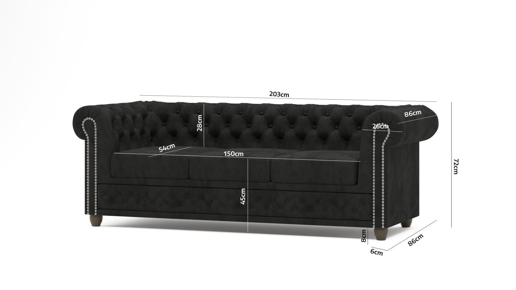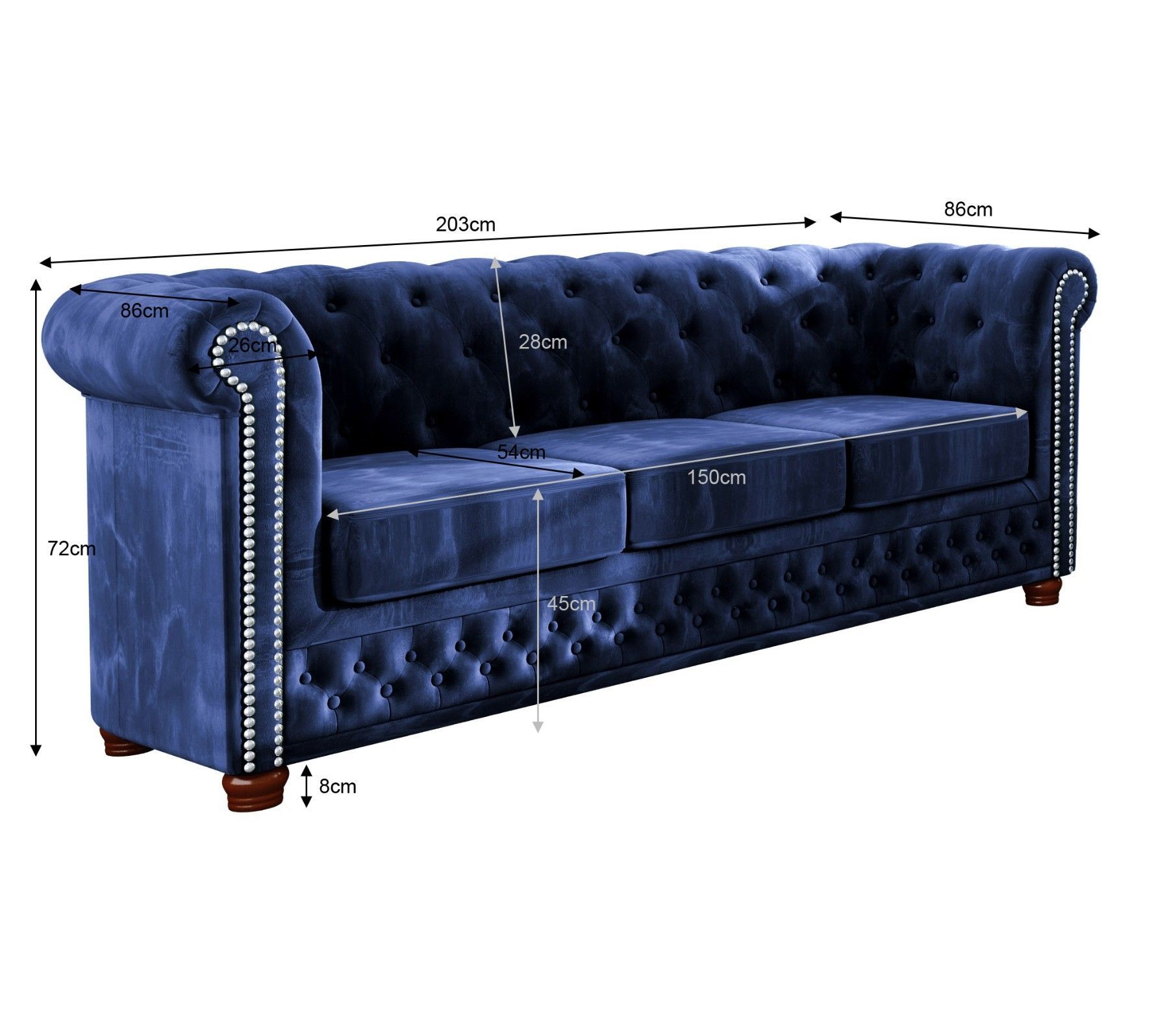 B 203 cm x T 86 cm x H 72 cm