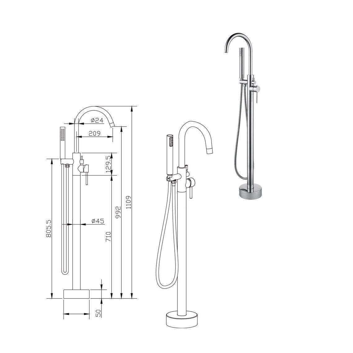 Aloni Standarmatur für freistehende Badewannen Chrom Badewannenarmatur