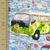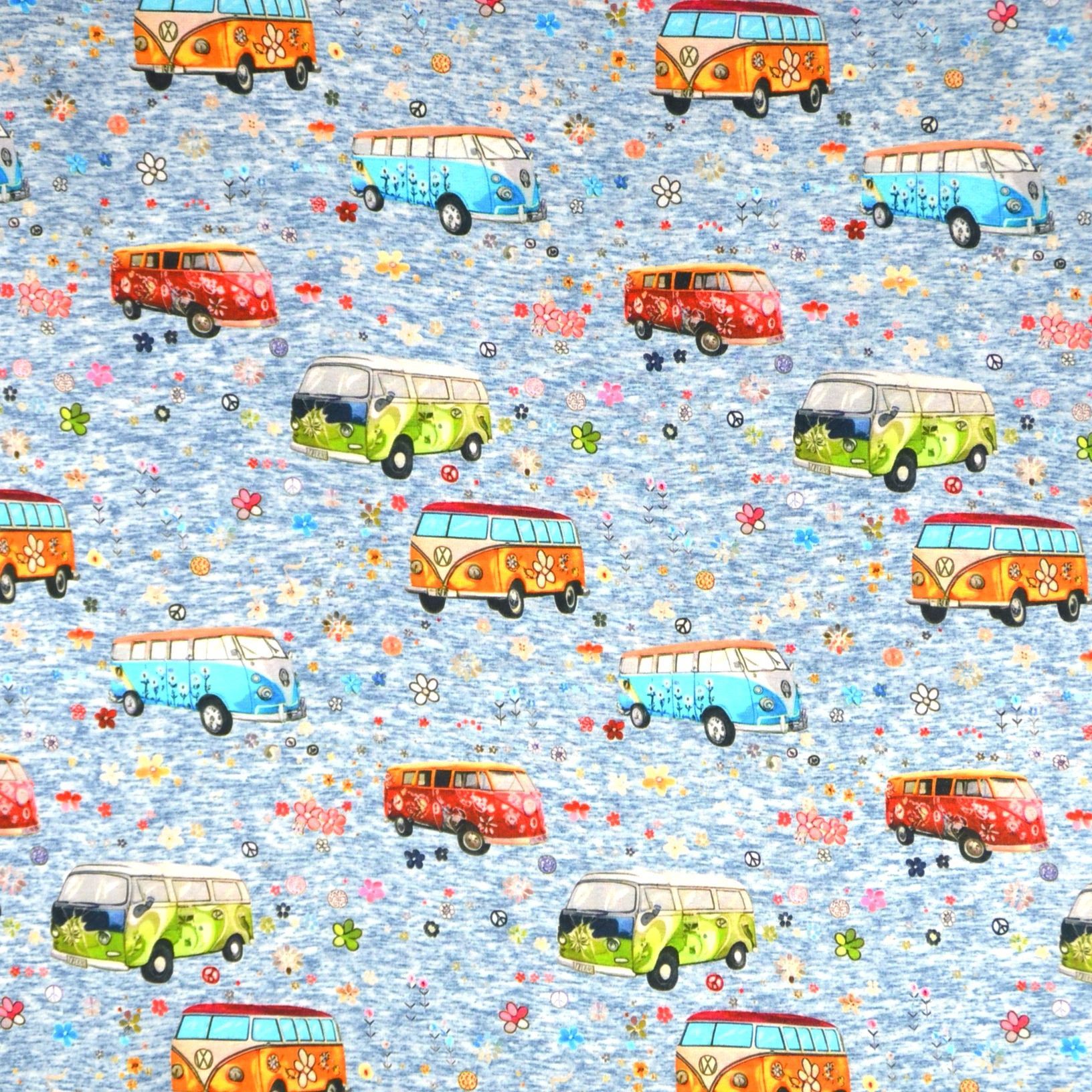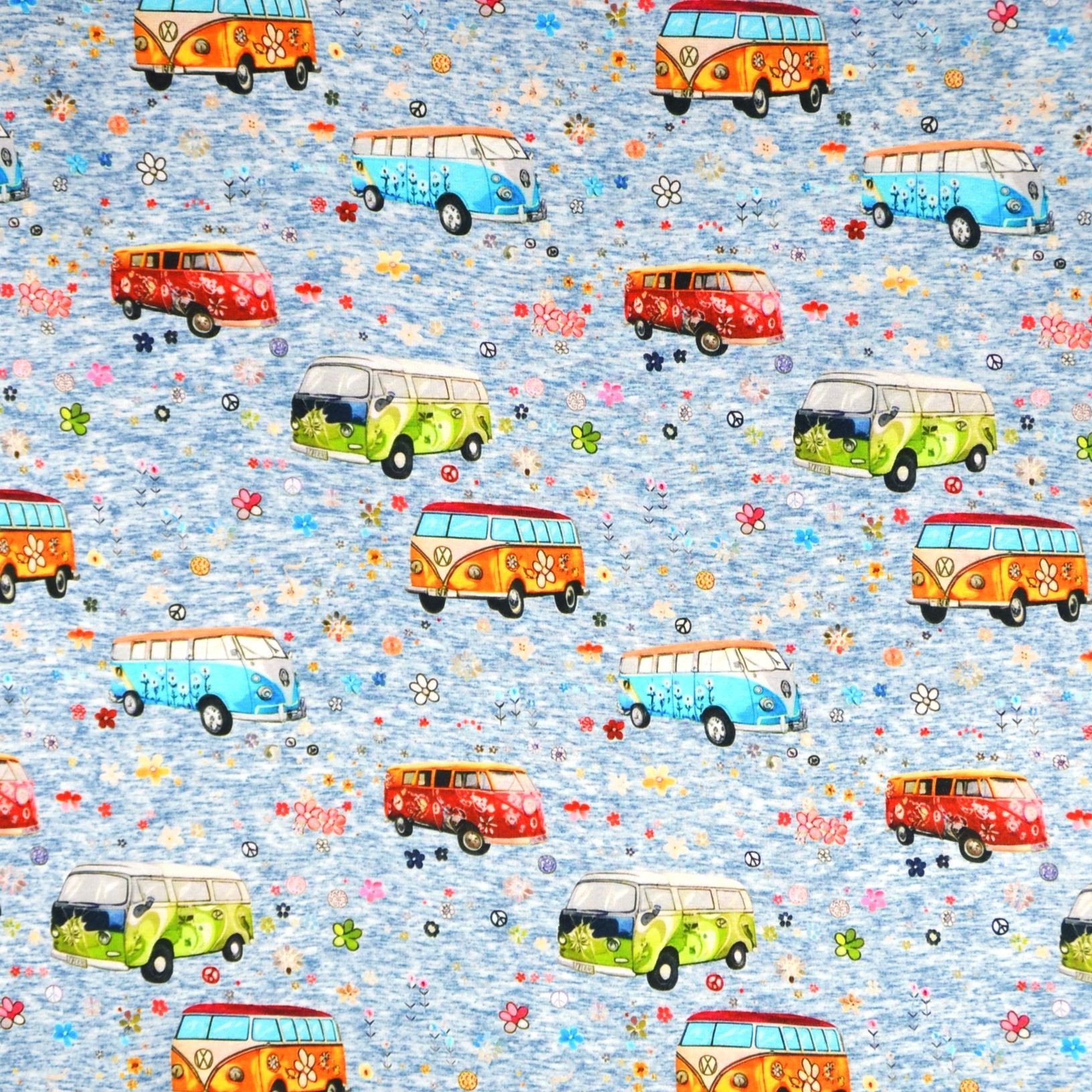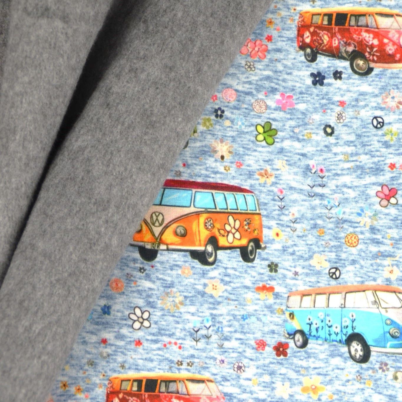 Alpenfleece Stoff mit bunten Bullis VW-Bus blau-melange 50 x 150 cm Kuschelsweat