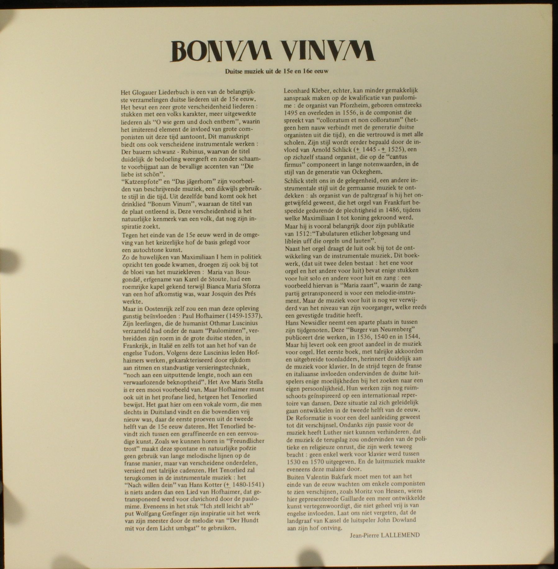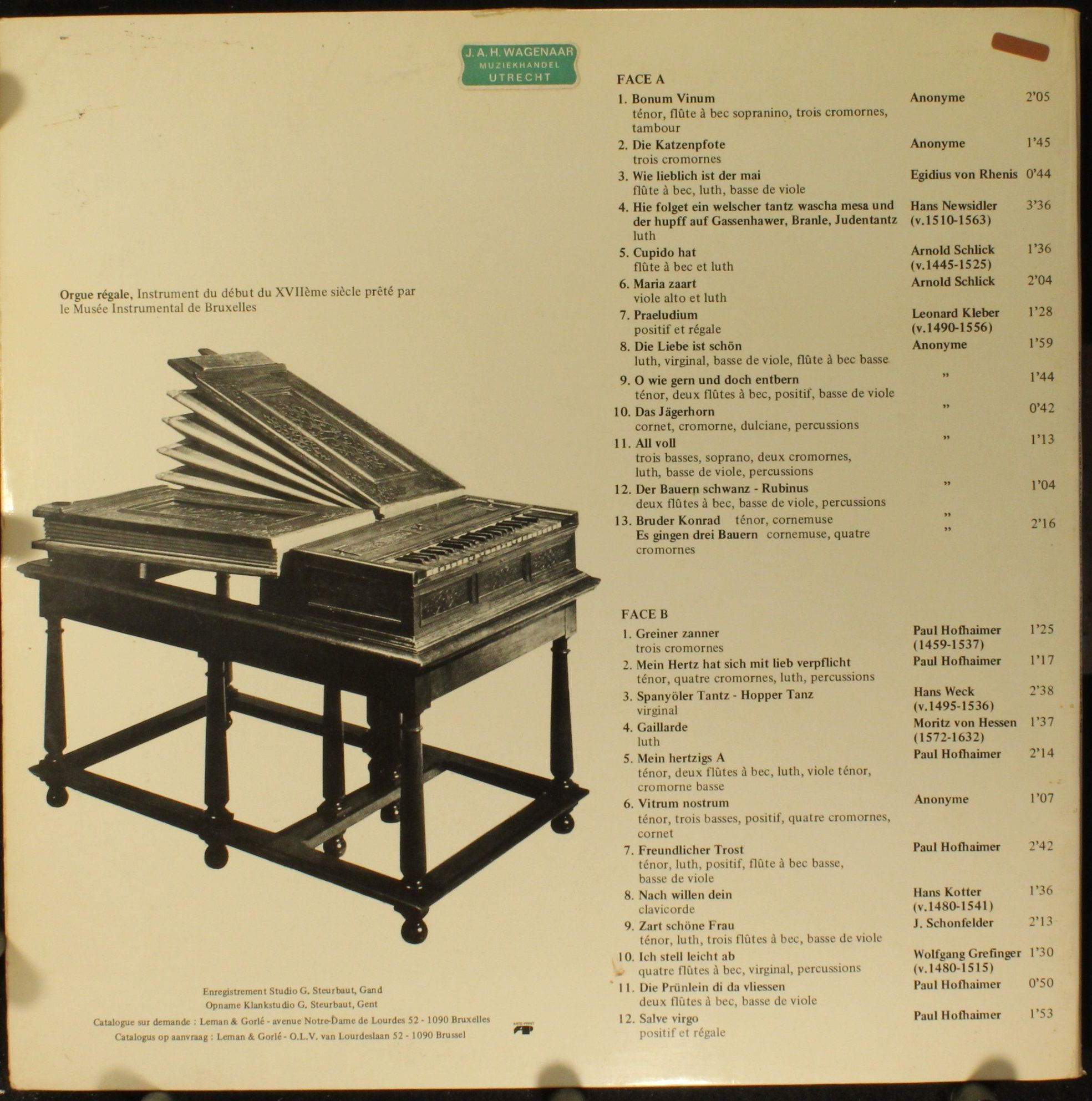 Condition Vinyl Very Good Plus (VG+) Condition Sleeve Very Good Plus (VG+) Tracks included: I 1. Bonum Vinum 2. Die Katzenpfote 3. Wie Lieblich Ist Der Mai 4. Hie Folget Ein Welscher Tantz Wascha Mesa Und Der Hupff Auf Gassenhawer, Branle, Judentantz 5. Cupido hat 6. Maria Zaart 7. Praeludium 8. Die