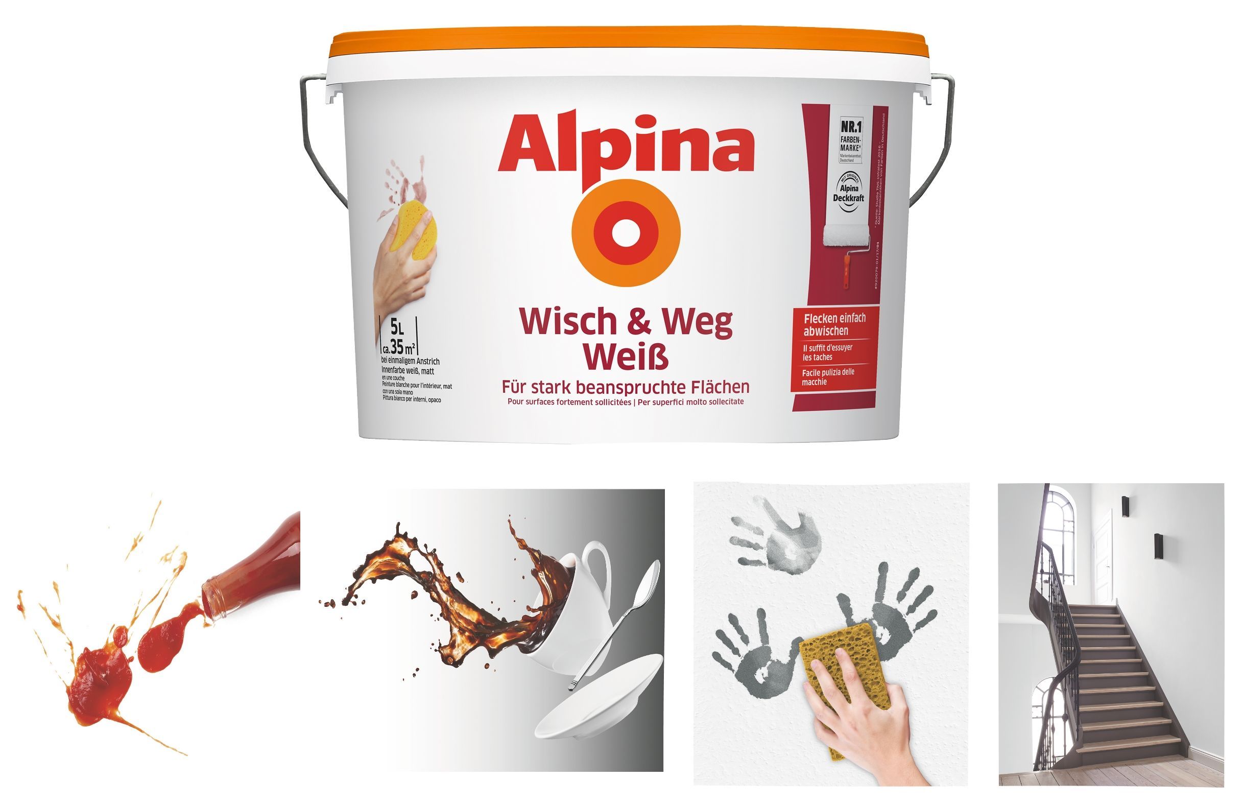 Alpina Wisch & Weg 5 Liter Wandfarbe, Weiss Matt, Flecken einfach abwischen