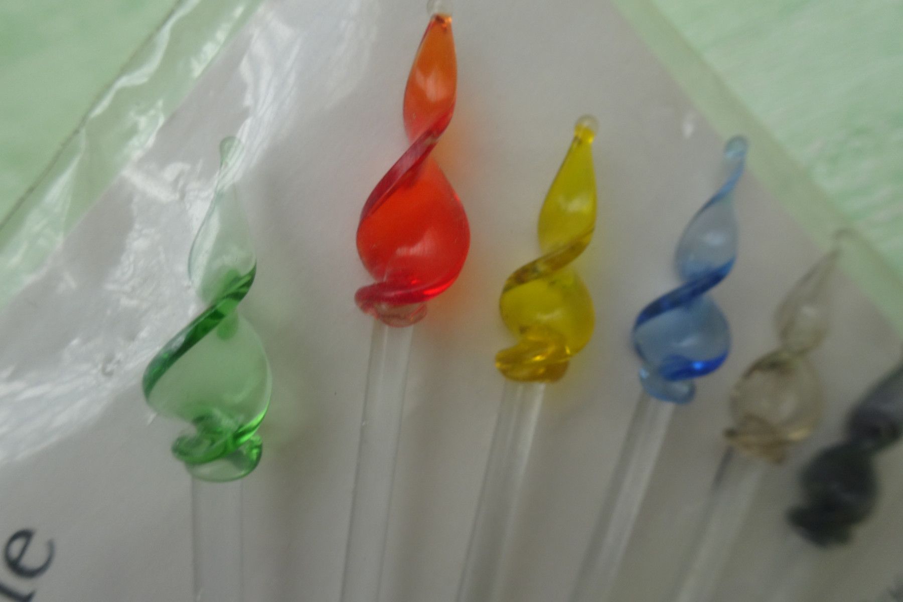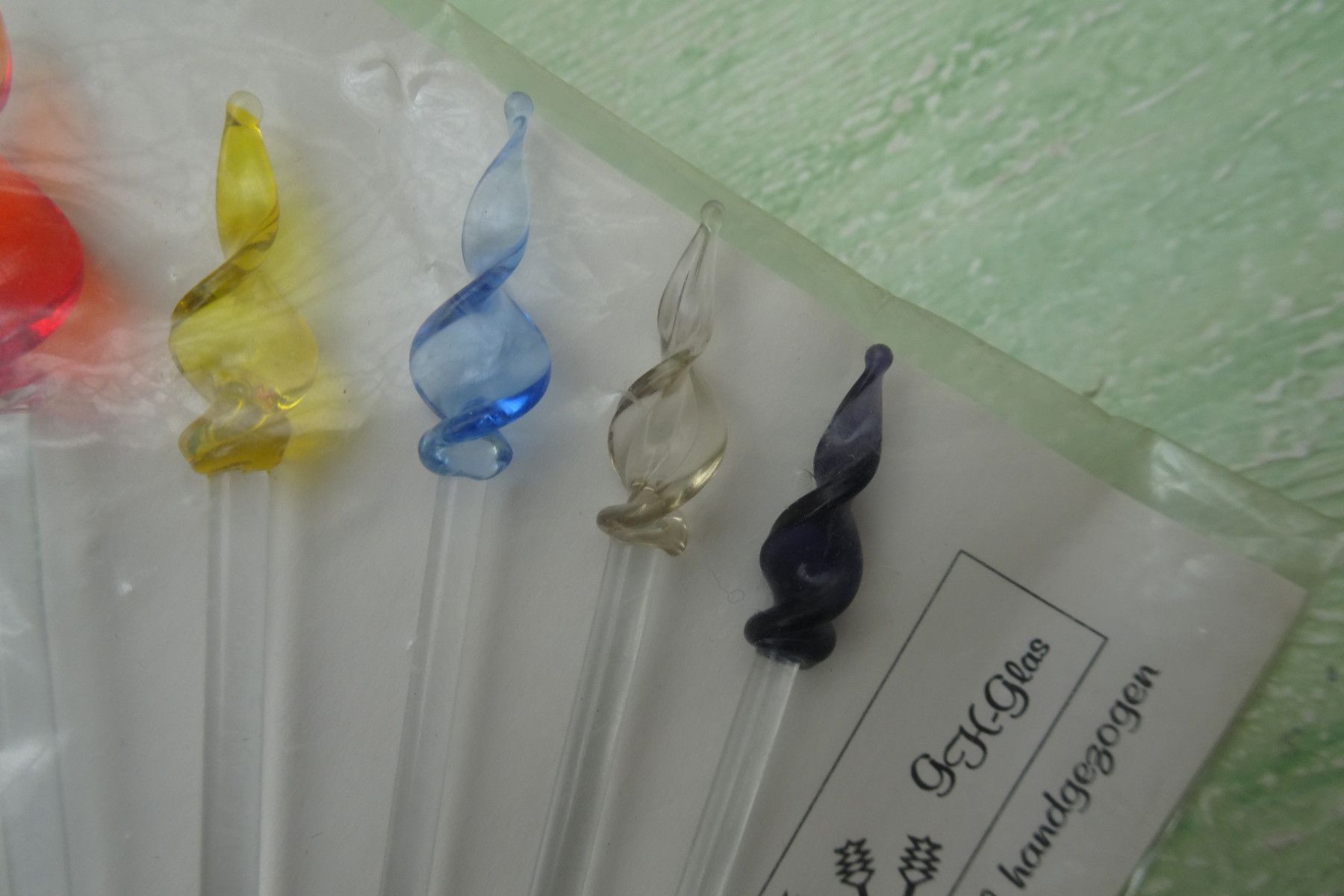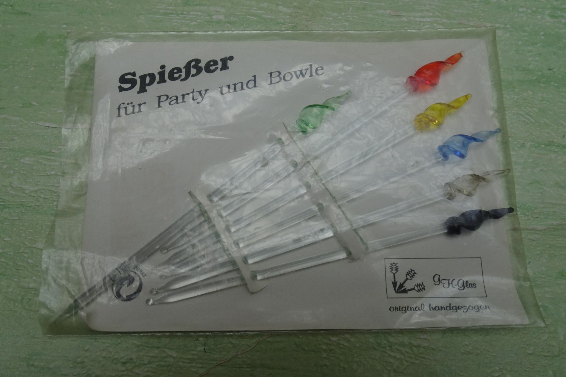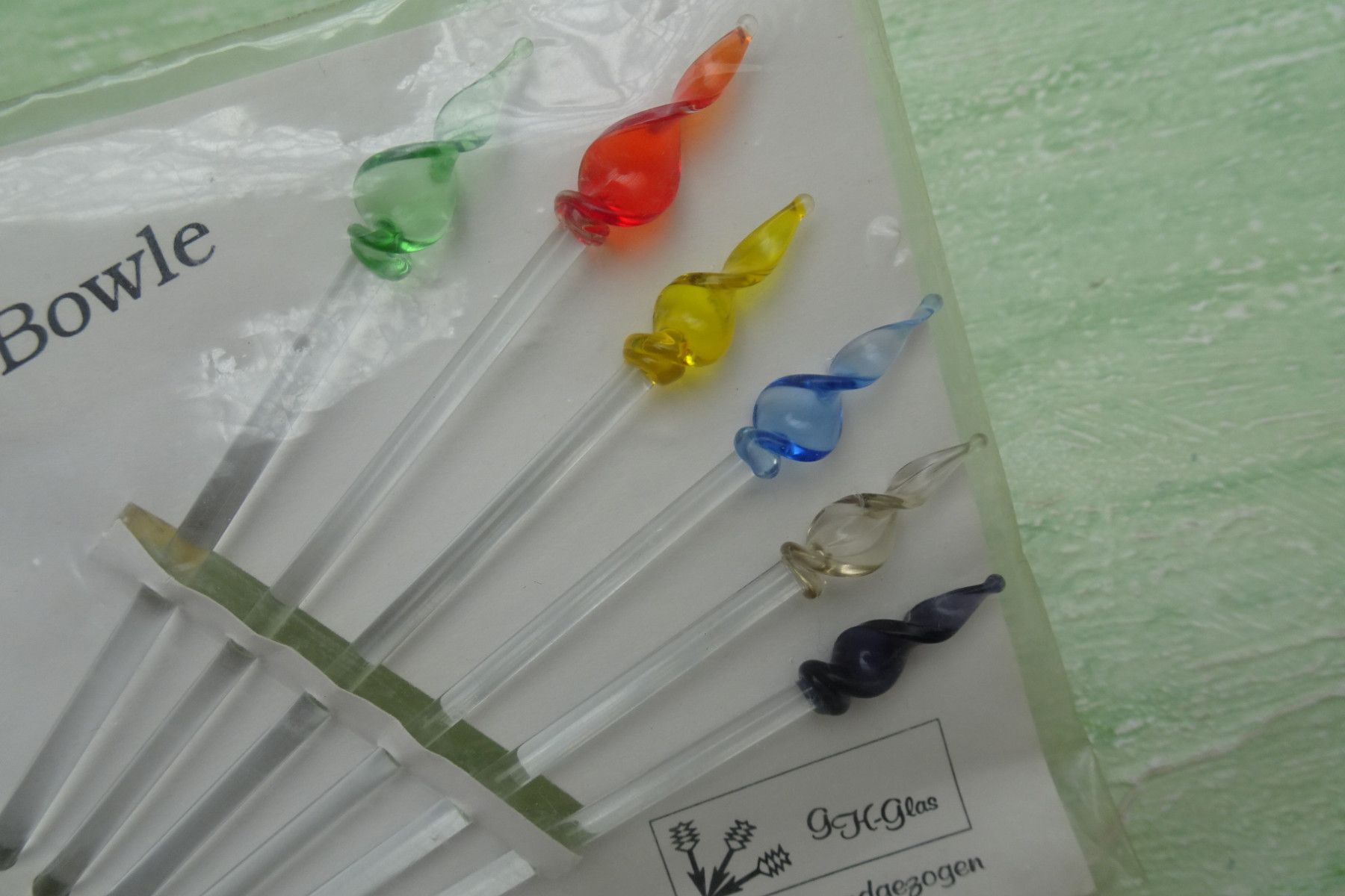 ALT Bowle Cocktail Spieße Picker 6x GH Glas handgezogen bunt verschnörkelt OVP