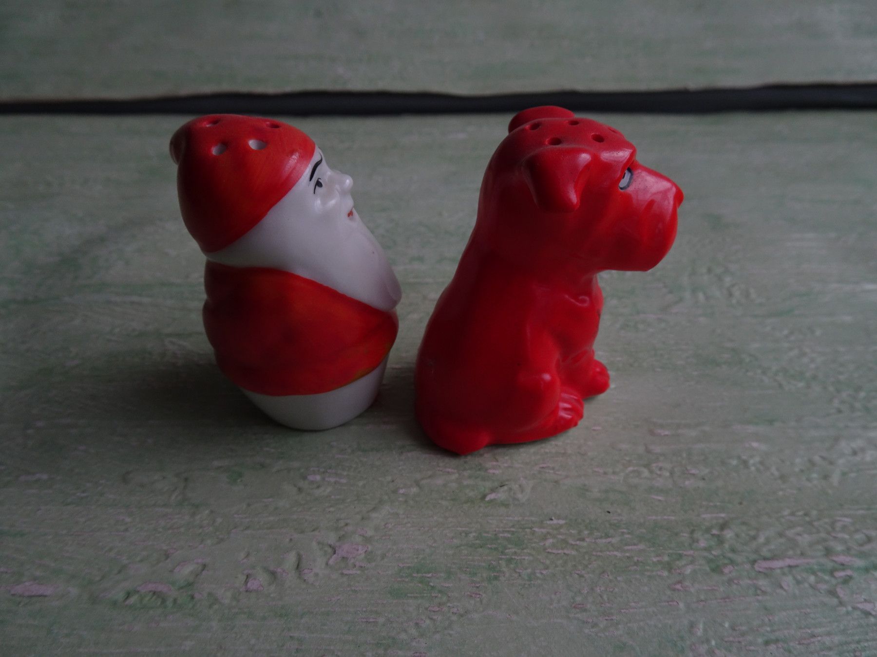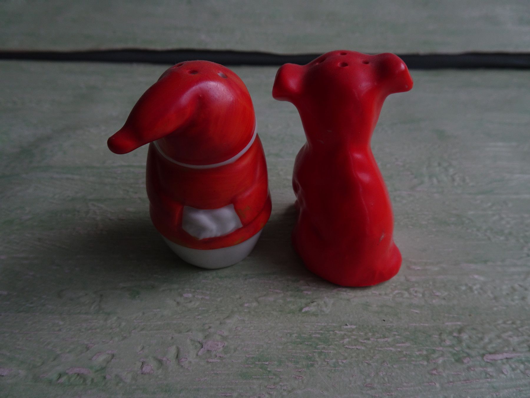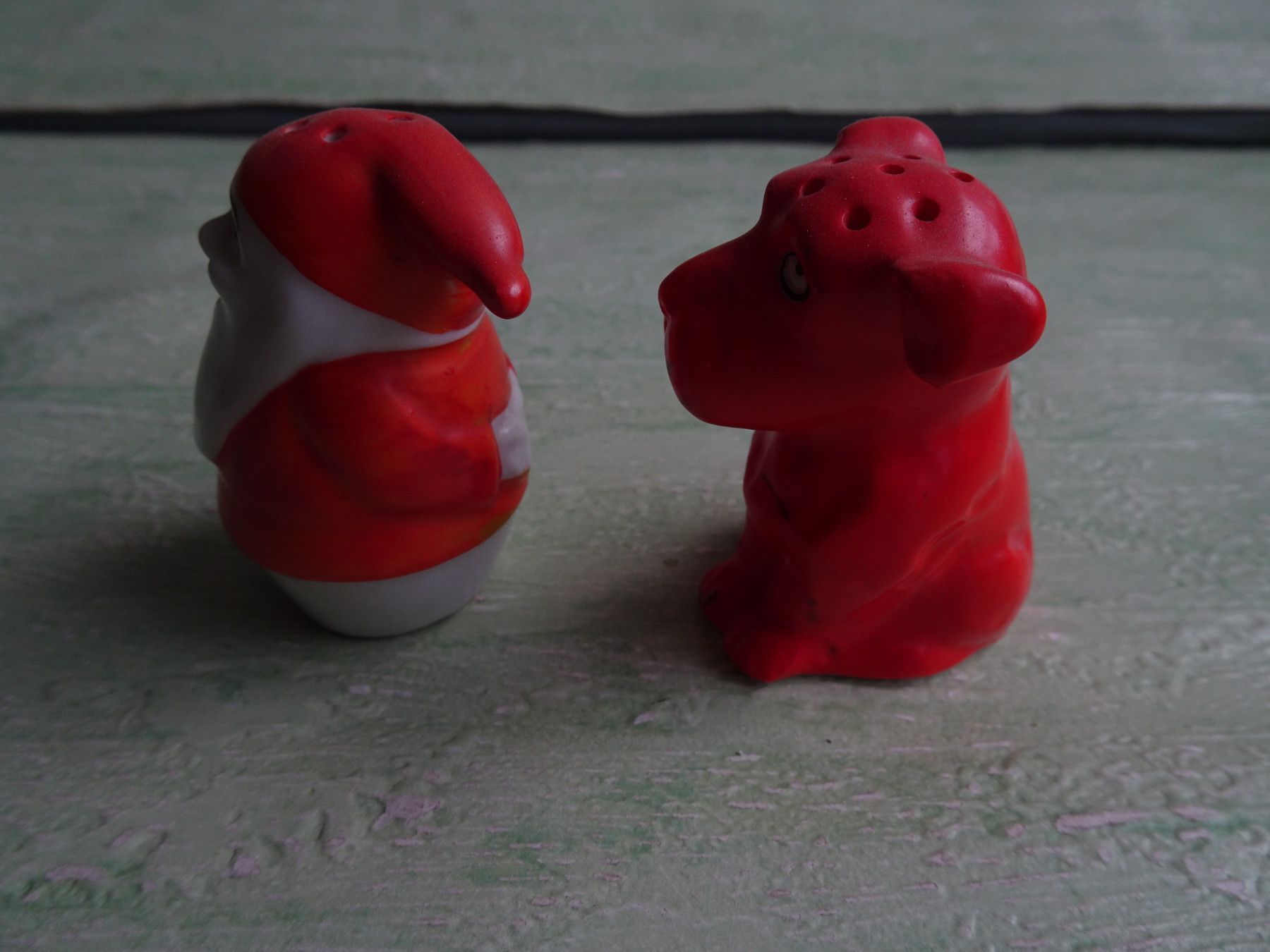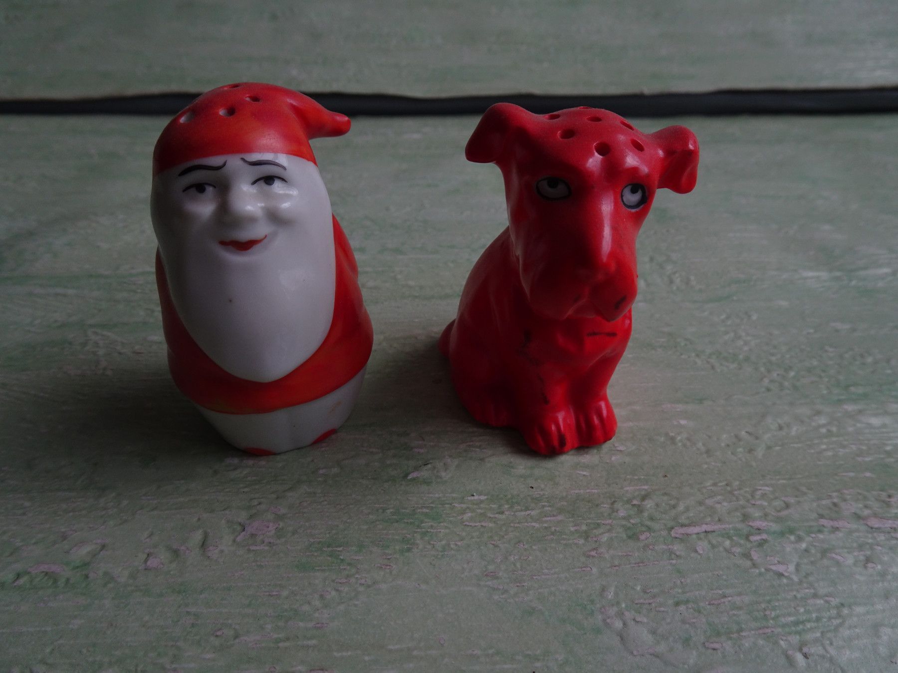 ALT : Weihnachtsmann & Hund Keramikporzellan Korkenverschluss Salz & Pfeffer Streuer