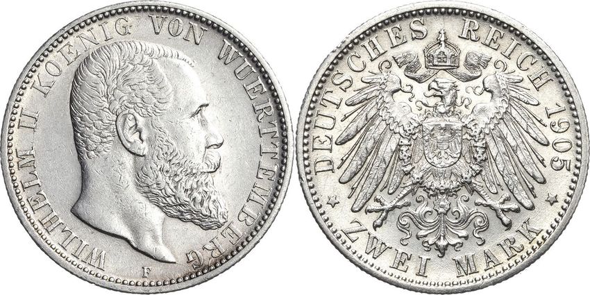 Altdeutschland Kaiserreich Silber Württemberg 2 Mark 1905 F Wilhelm II. (1891-1918)
