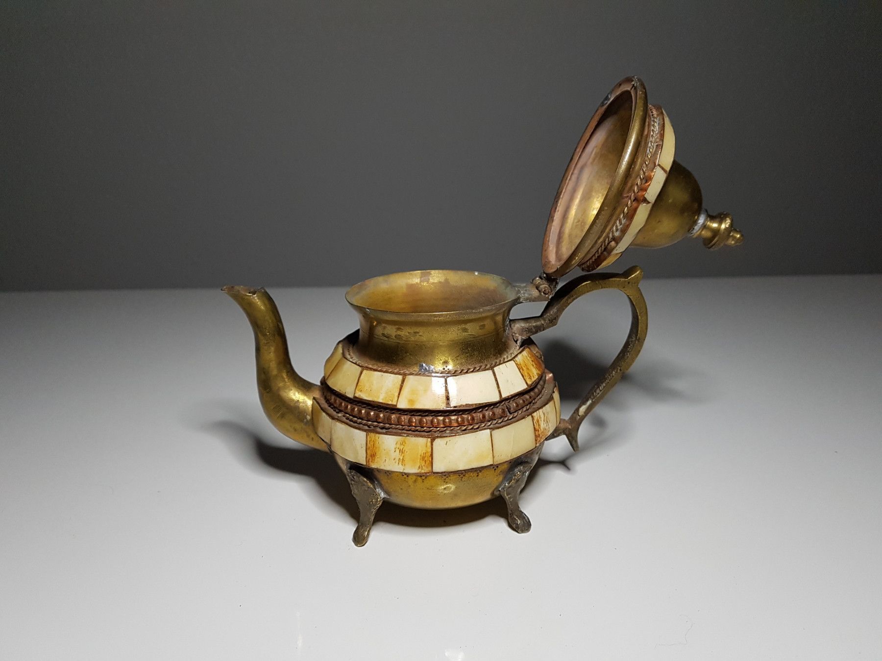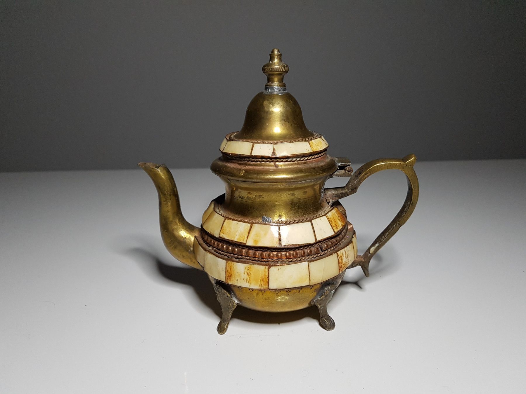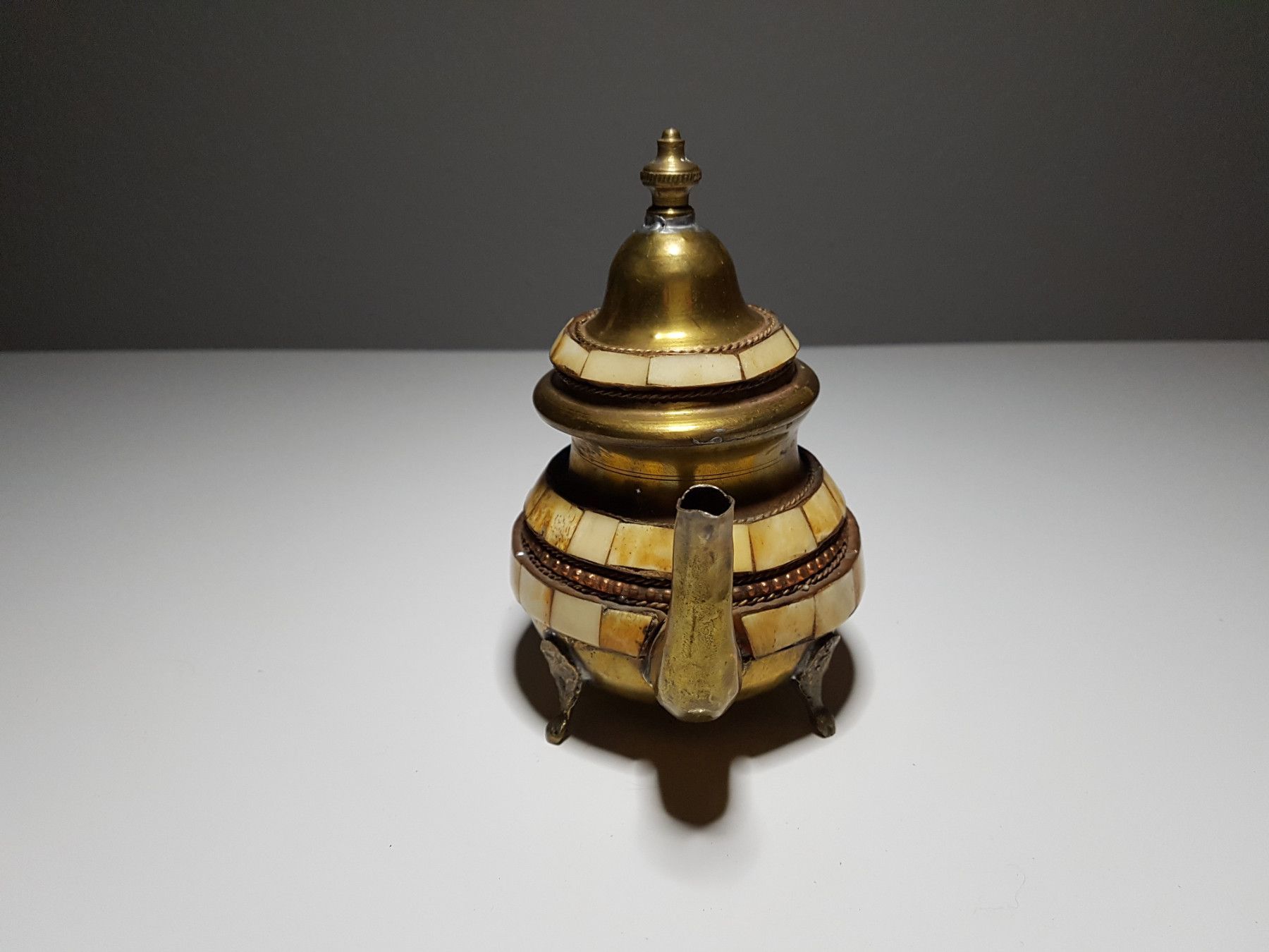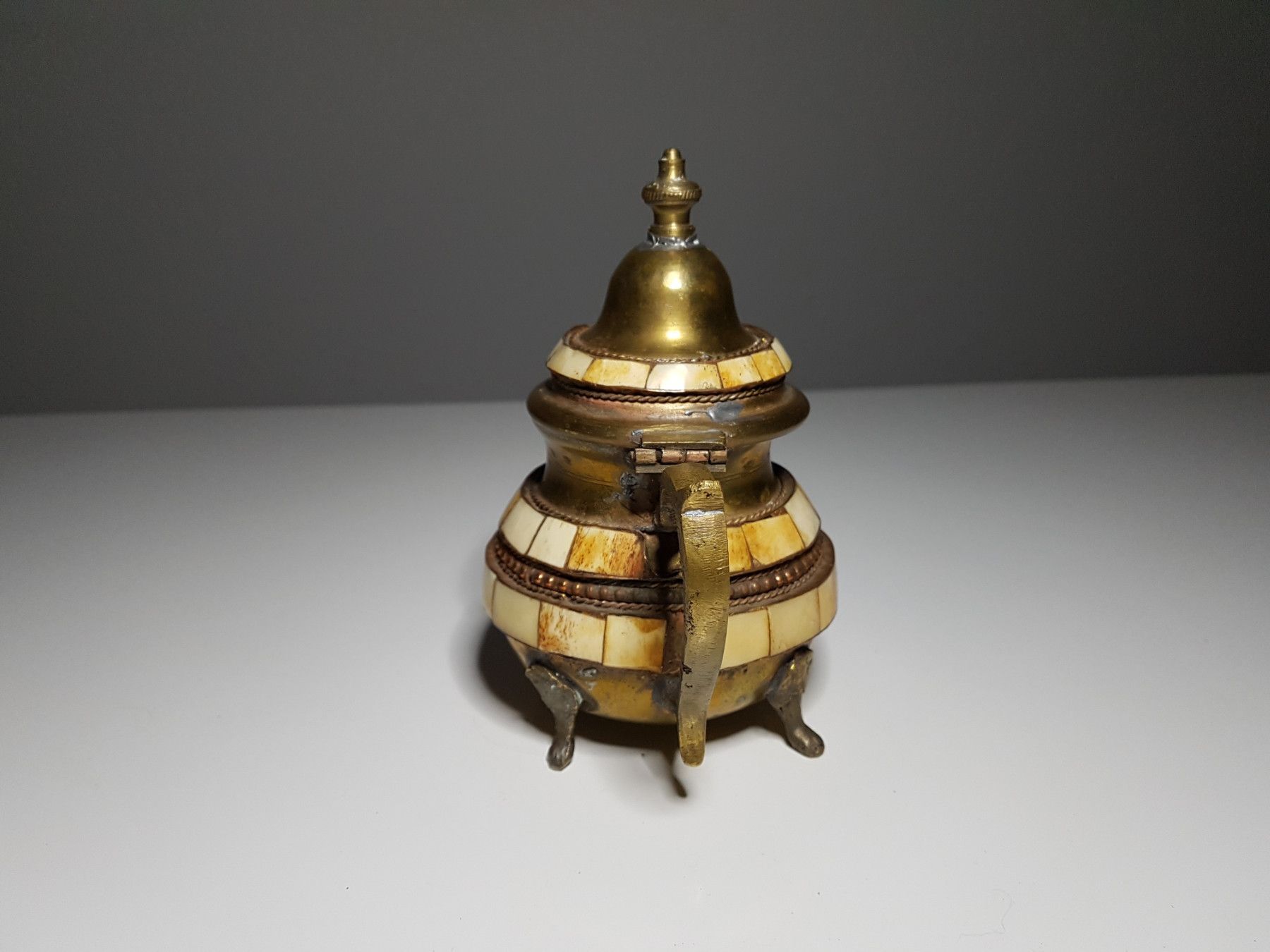 Kanne ist aus Messing und bestückt mit kleinen Teilen aus Kamelknochen