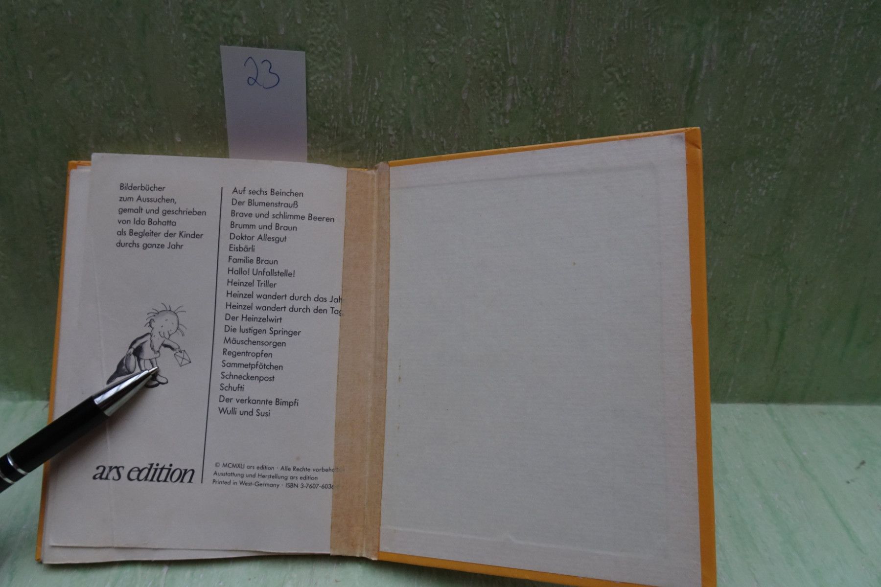 Bilderbücher - Kinderbücher ... Erinnerungen ..... . ars edition Kleines mini Buch Bilderbücher zum Vorlesen und Selbstlesen . Ida Bohatta . 23 : Katz und Mausi (C) MCMXLI 1941, West Germany ISBN 3-7607-6036-6 Fadenbindung deutliche Gebrauchsspuren, geklebt , Seiten gut . 23a : Katz und Mausi (C) MC... Mehr