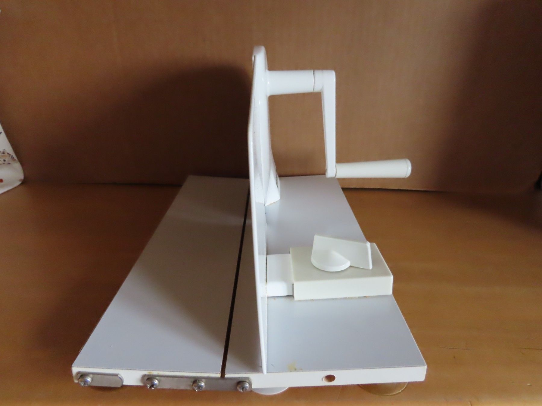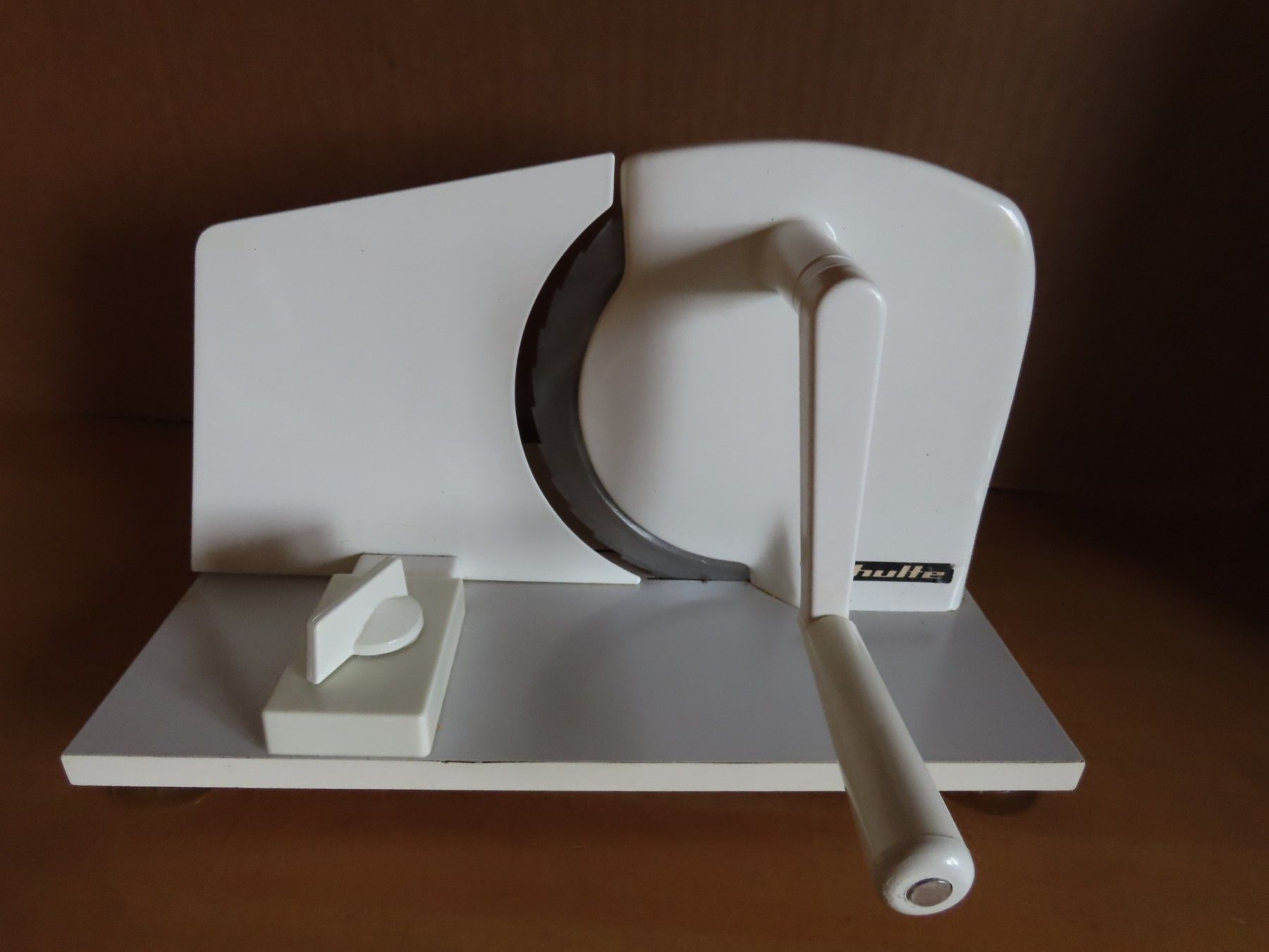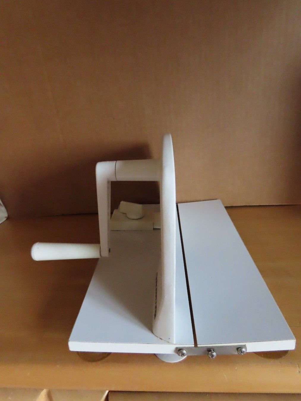alte Kurbel-Brotmschine Brotschneidemaschine klappbar weiß Schulte