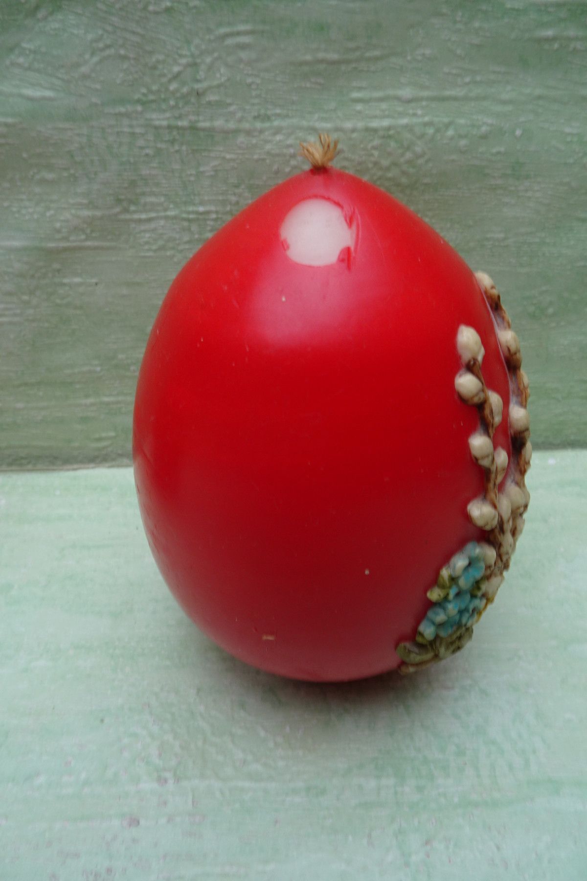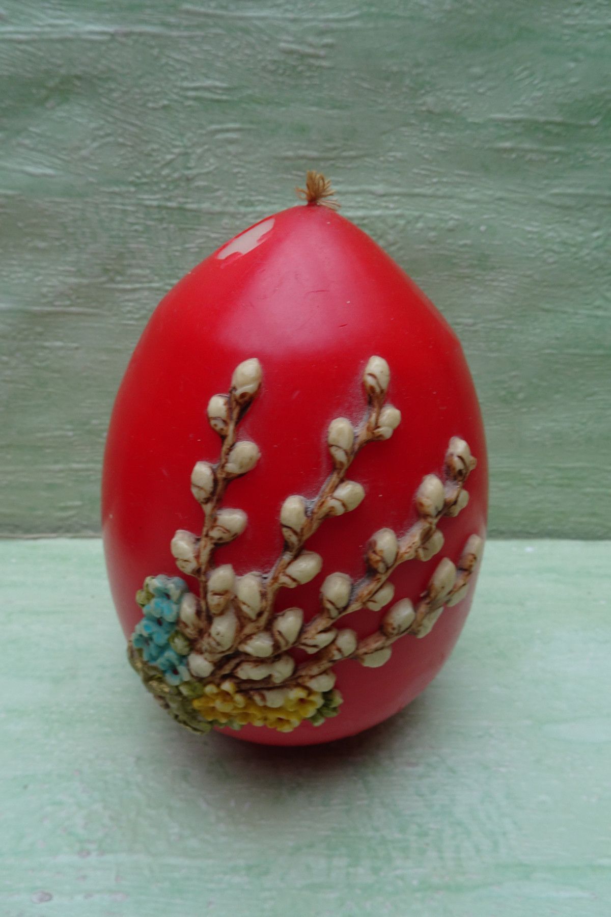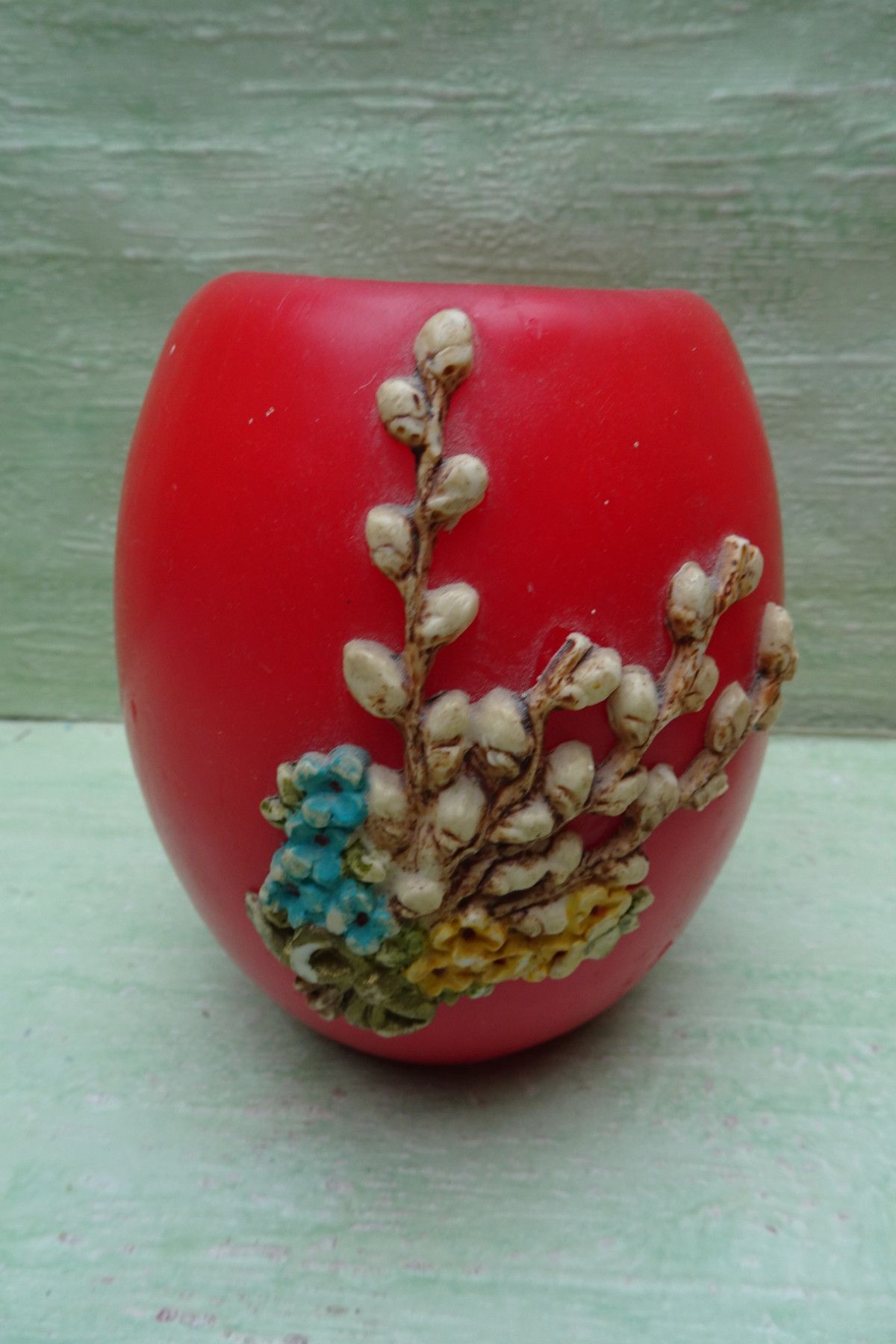 alte Osterei Kerze rot mit Wachsmotiv Weidenkätzchen