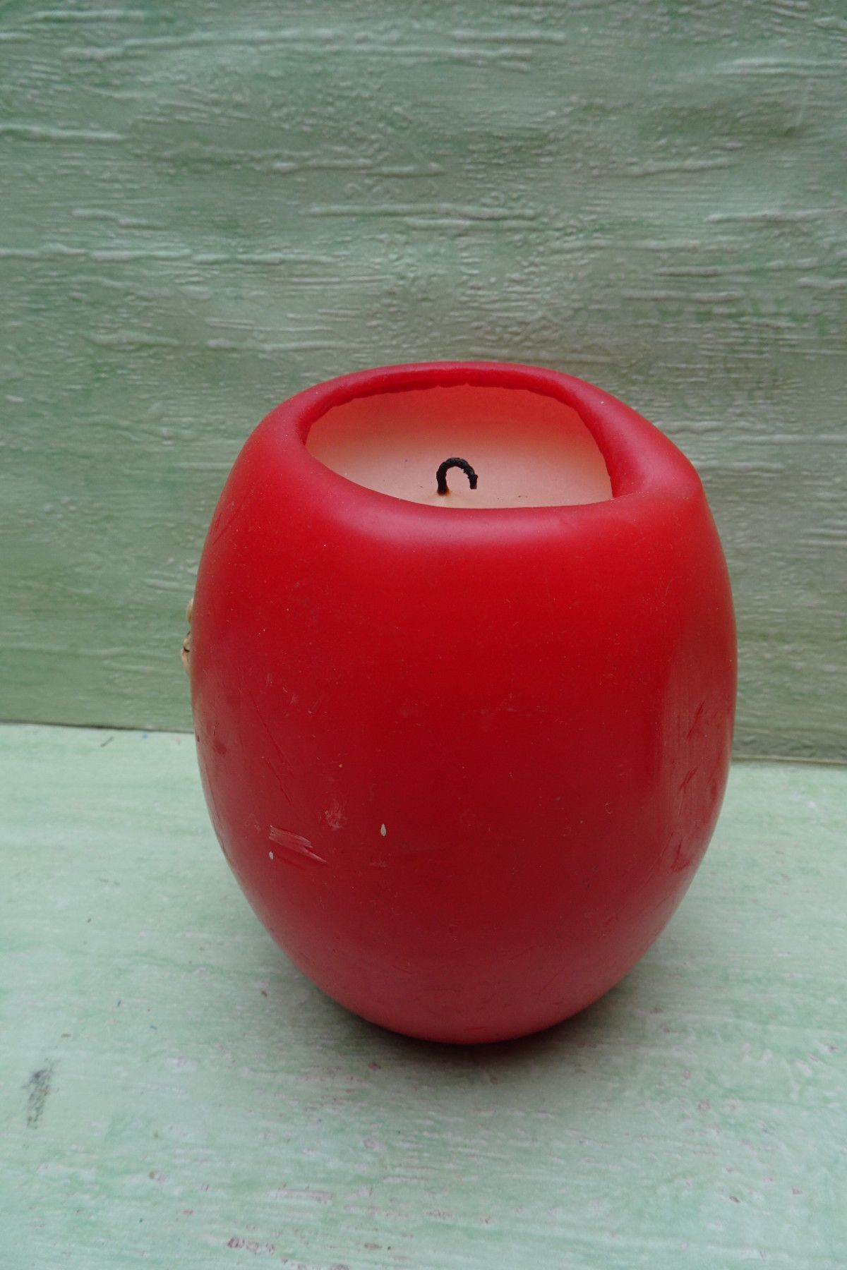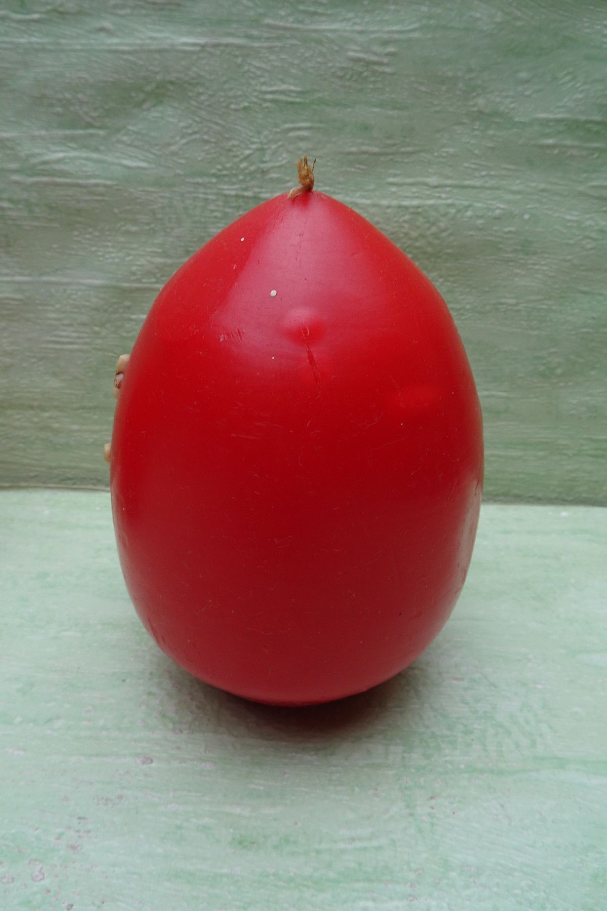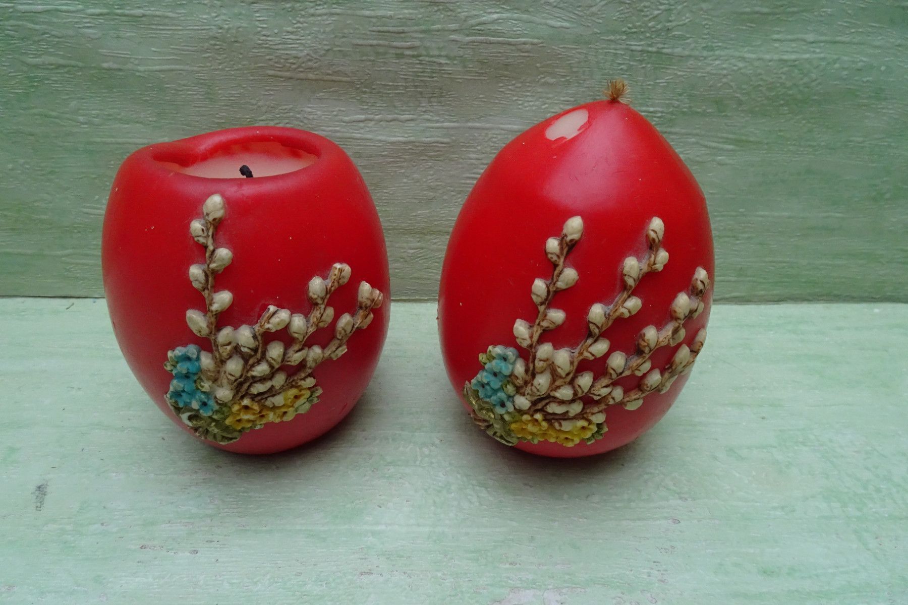 alte Osterei Kerze rot mit Wachsmotiv Weidenkätzchen