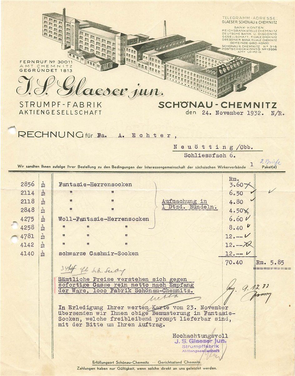 Alte Rechnungen, I.S. Glaser jum., Schönau-Chemitz" 24.11.1932