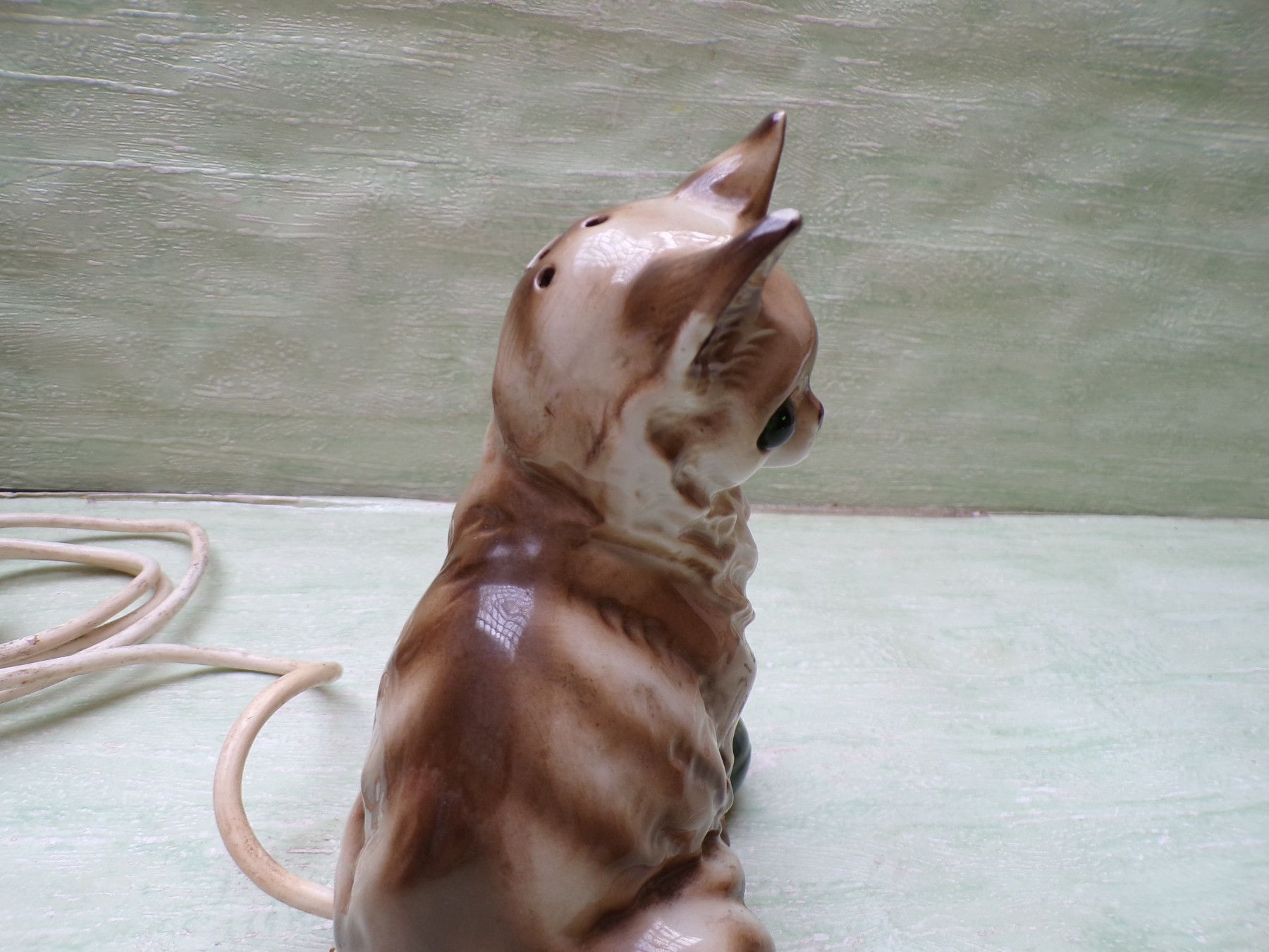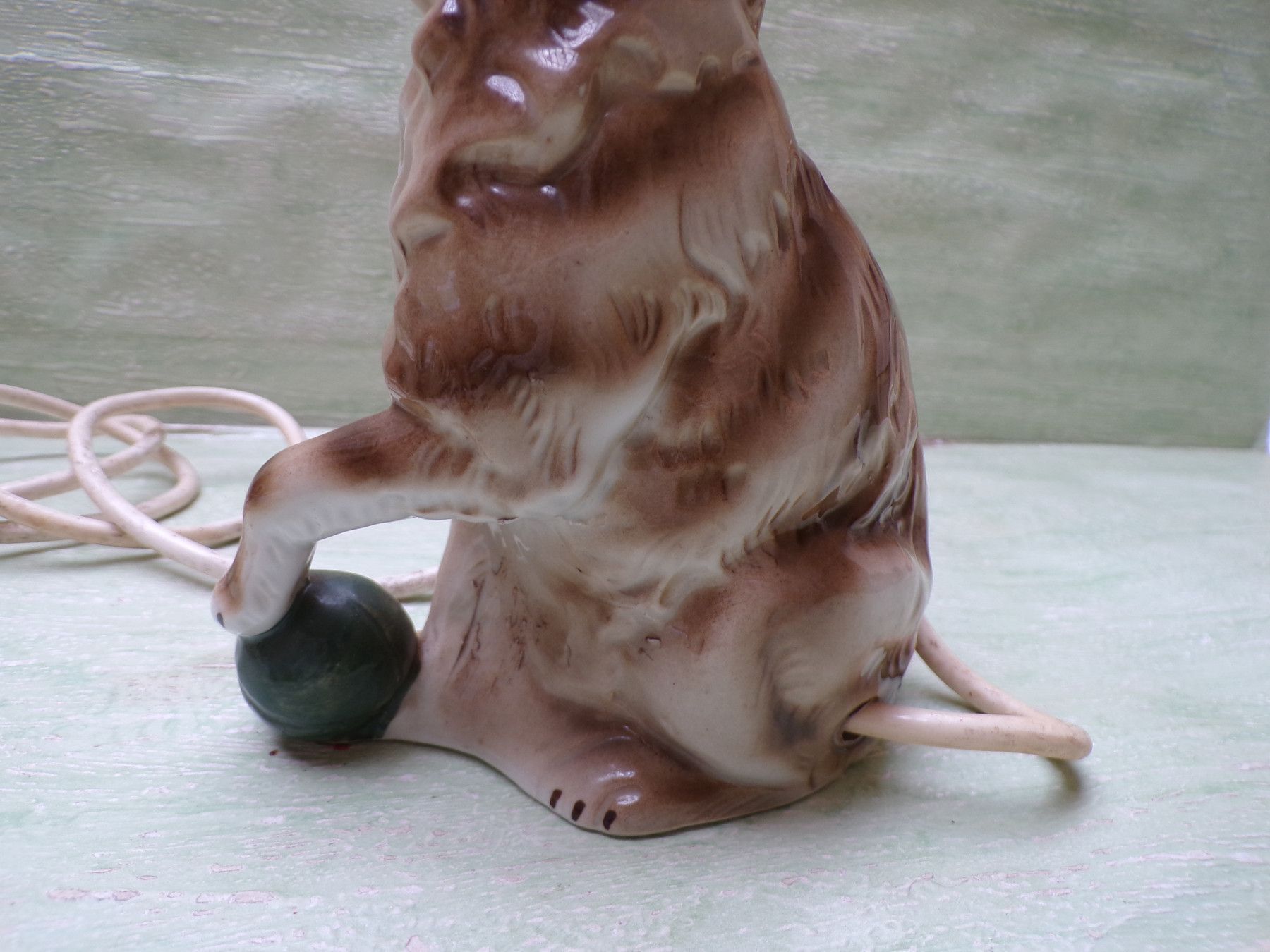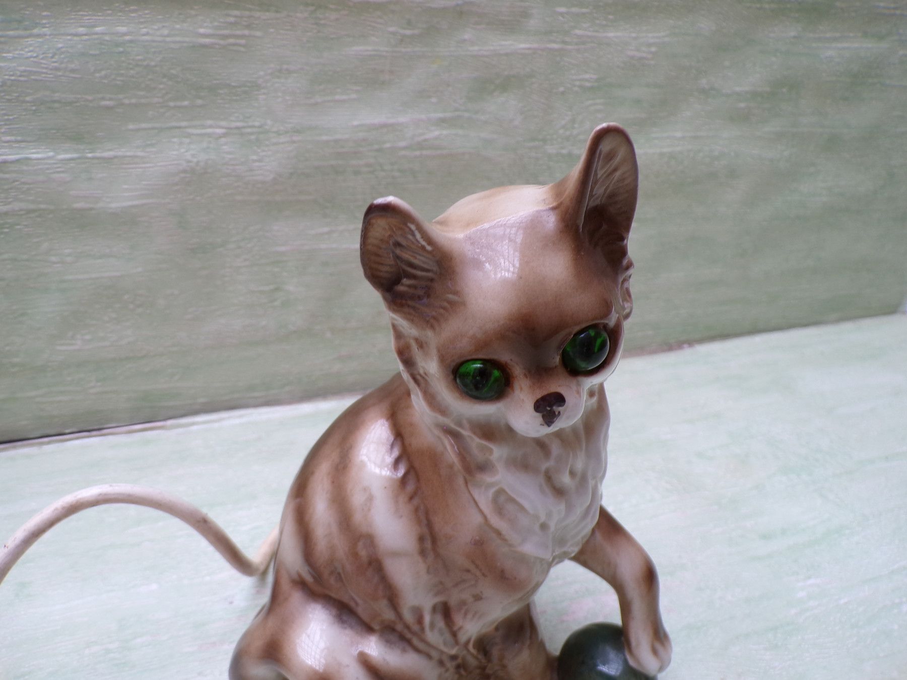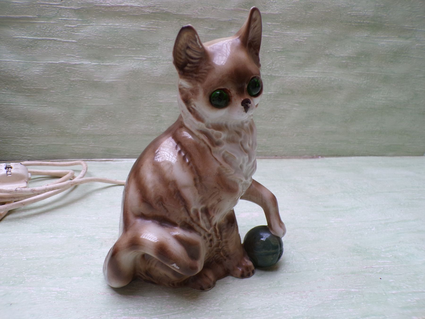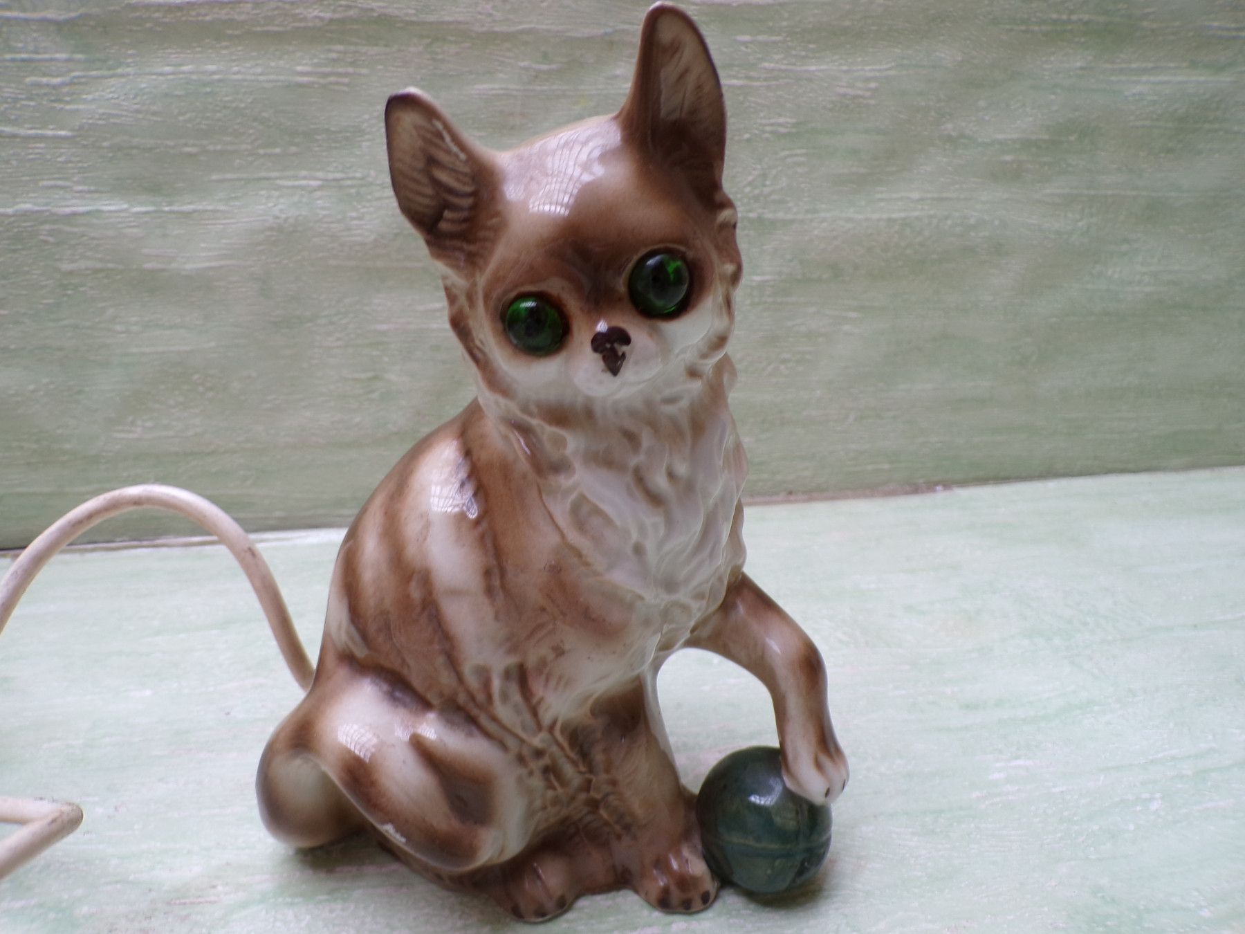alter Rauchverzehrer Porzellan Katze grüne Augen Ball & alte Elektrik
