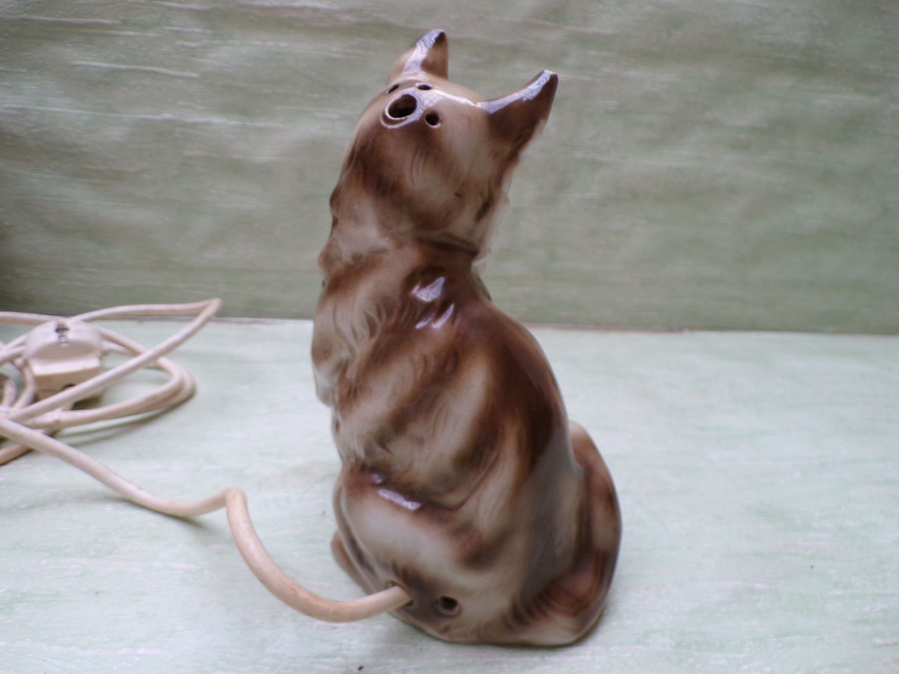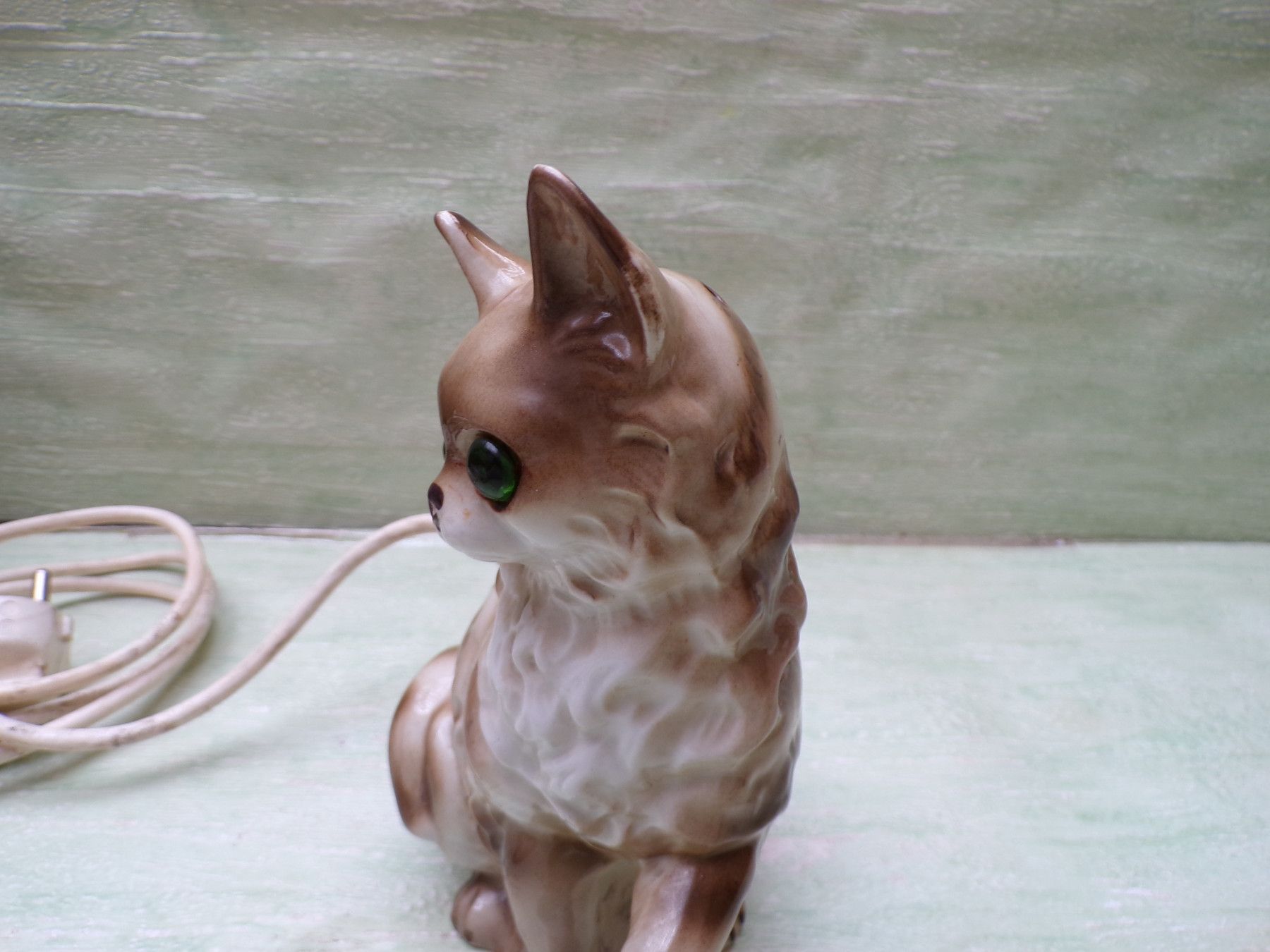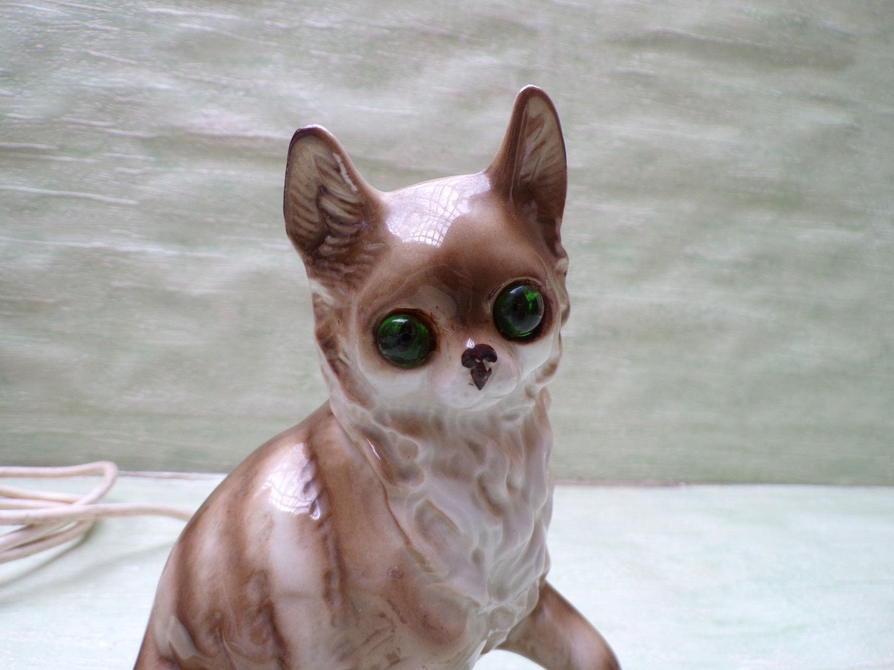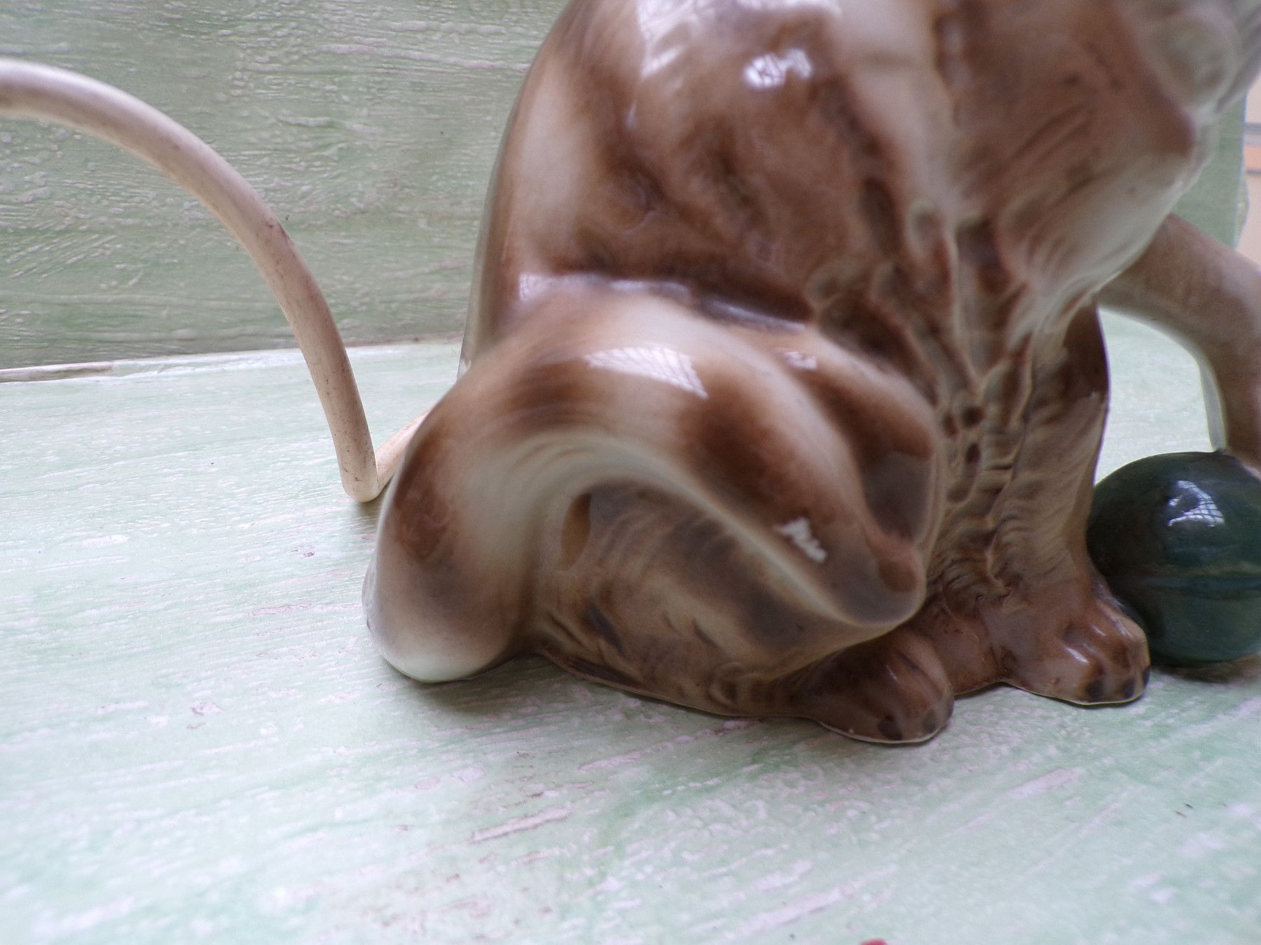 alter Rauchverzehrer Porzellan Katze grüne Augen Ball & alte Elektrik