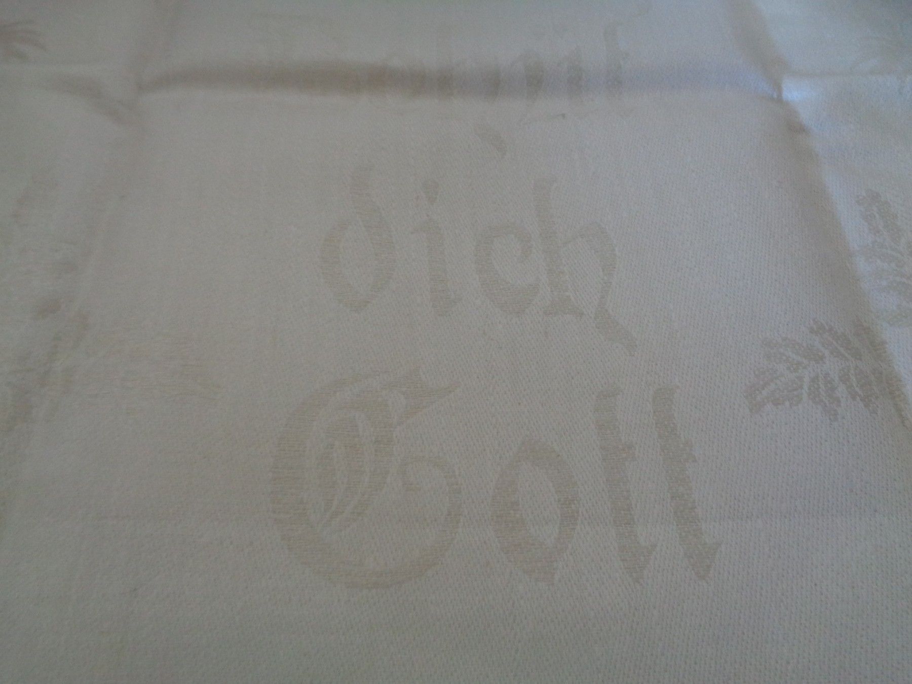 altes Küchenhandtuch/ Trockentuch mit eingewebten Muster-Trompeter + Spruch