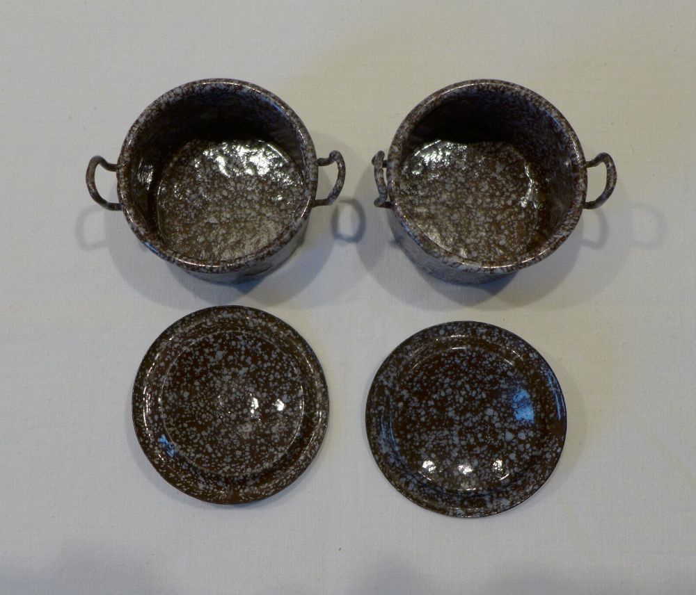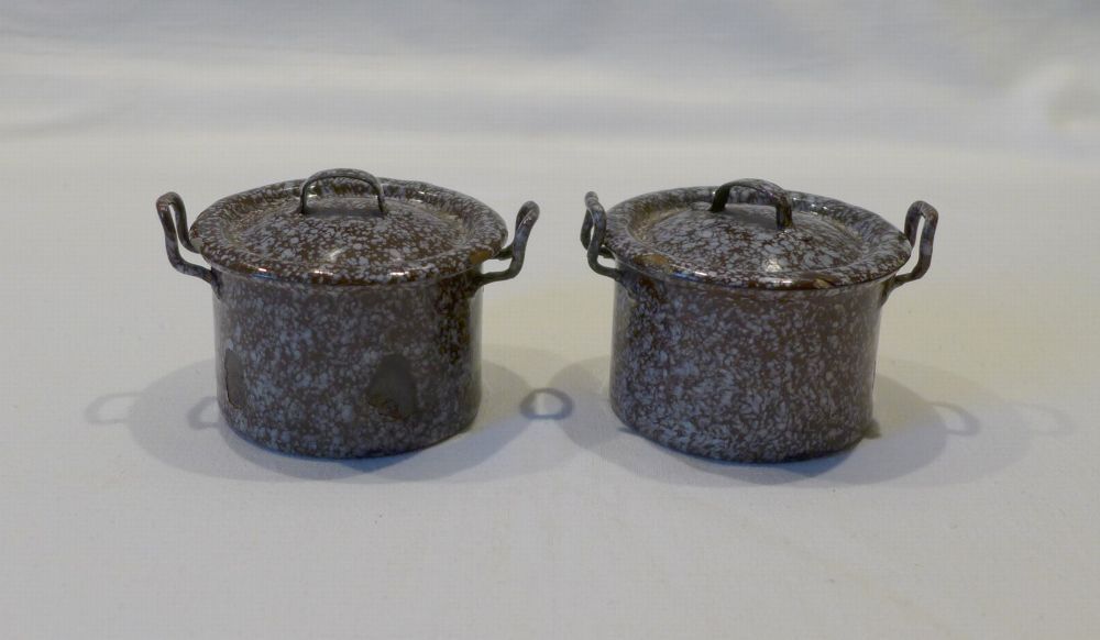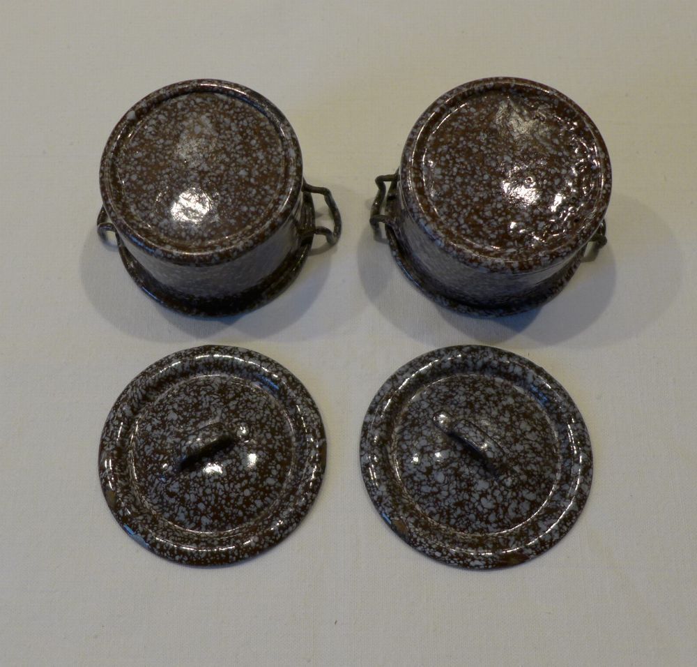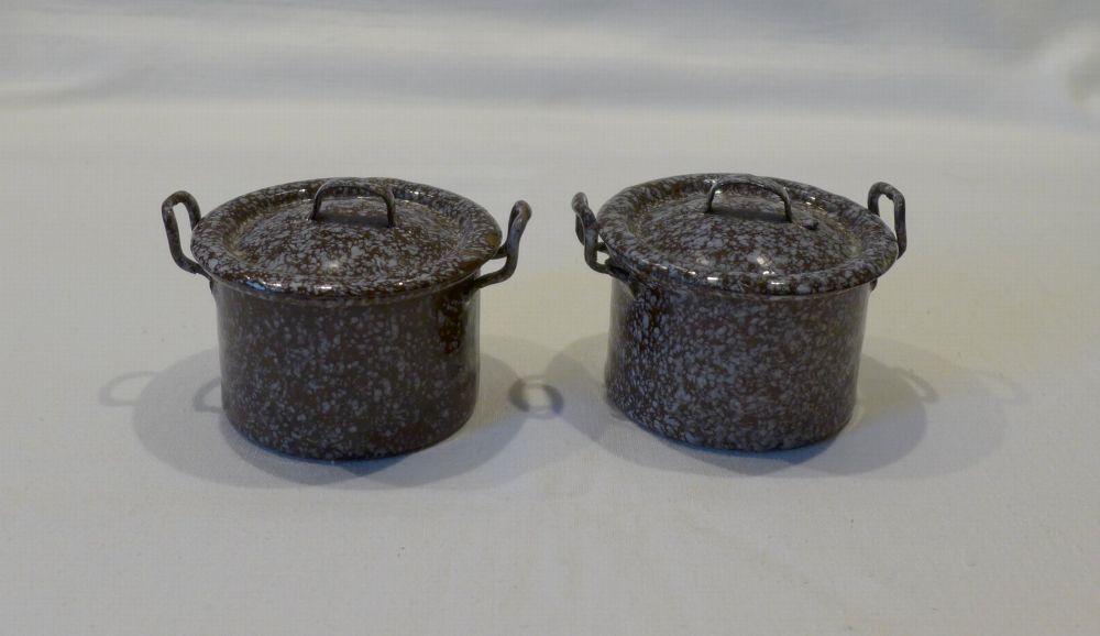 altes Metall Blech Emaille Puppenstube Küche 2 Stück Topf mit Deckel braun weiß