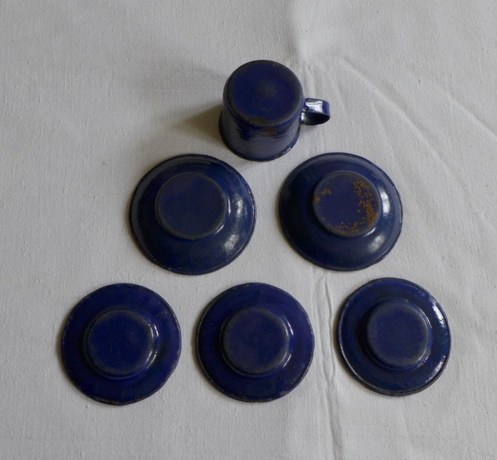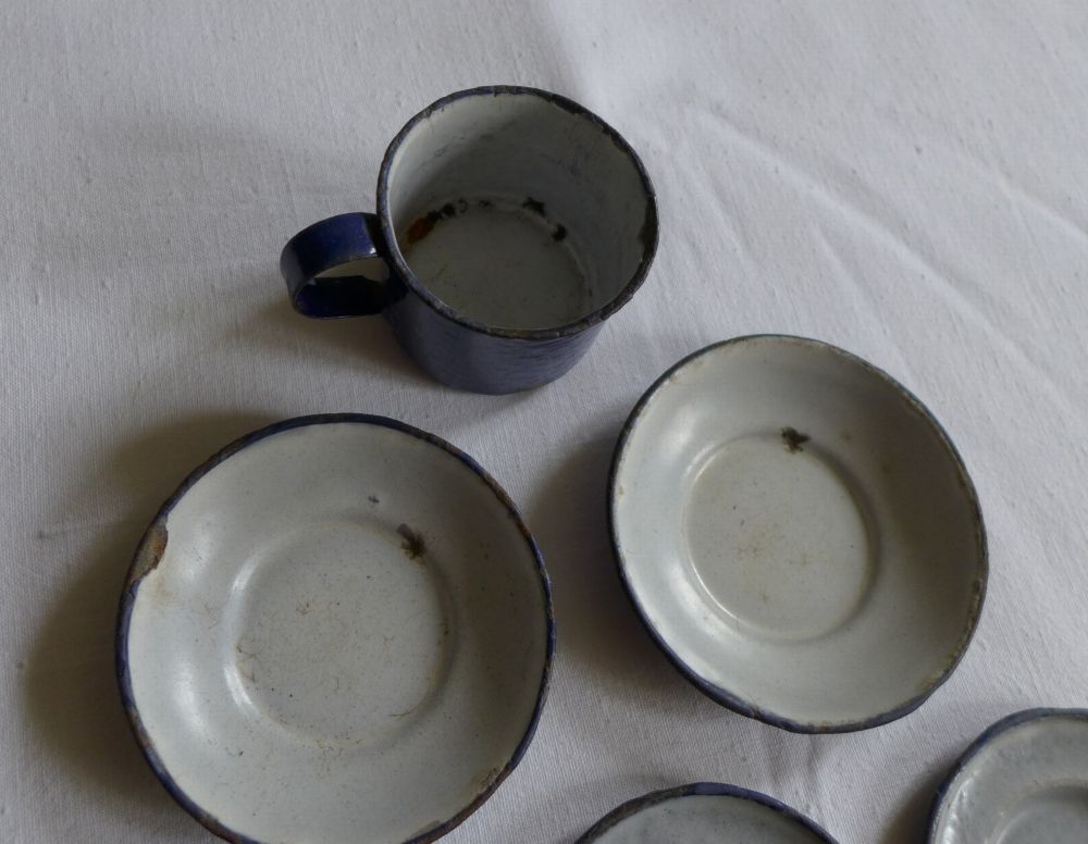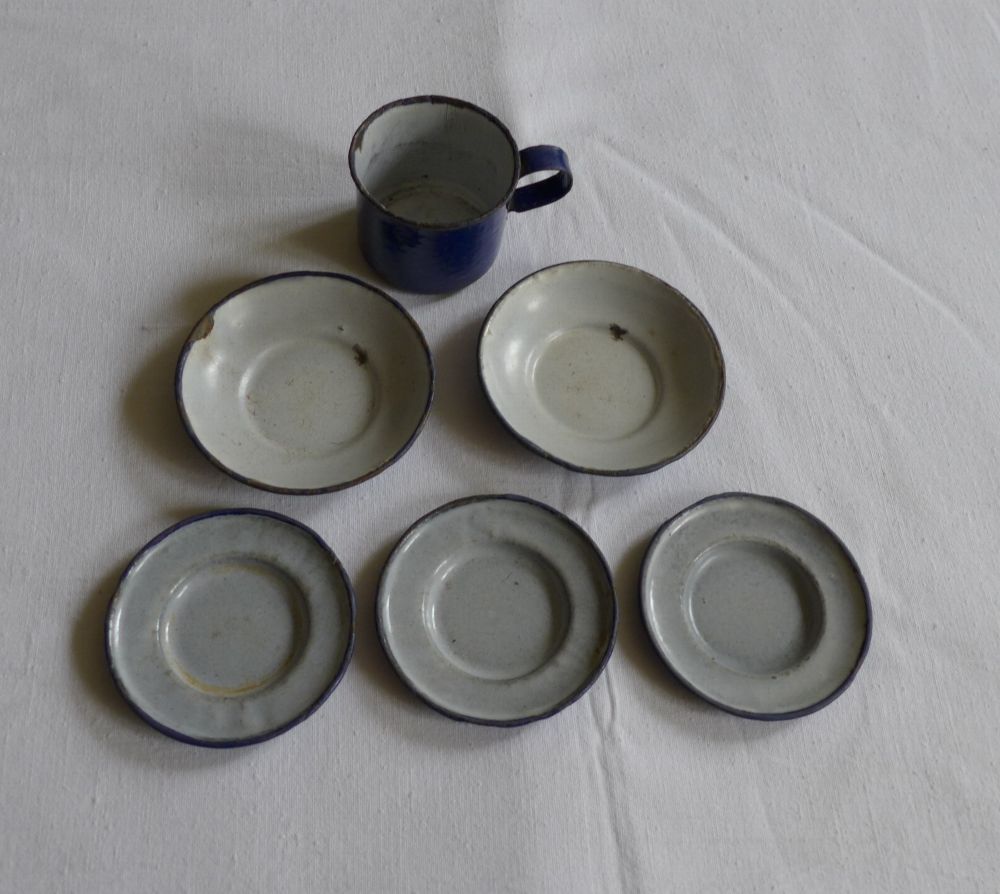 altes Set Metall Blech Emaile Puppenstube Küche Topf Tasse Teller blau weiß