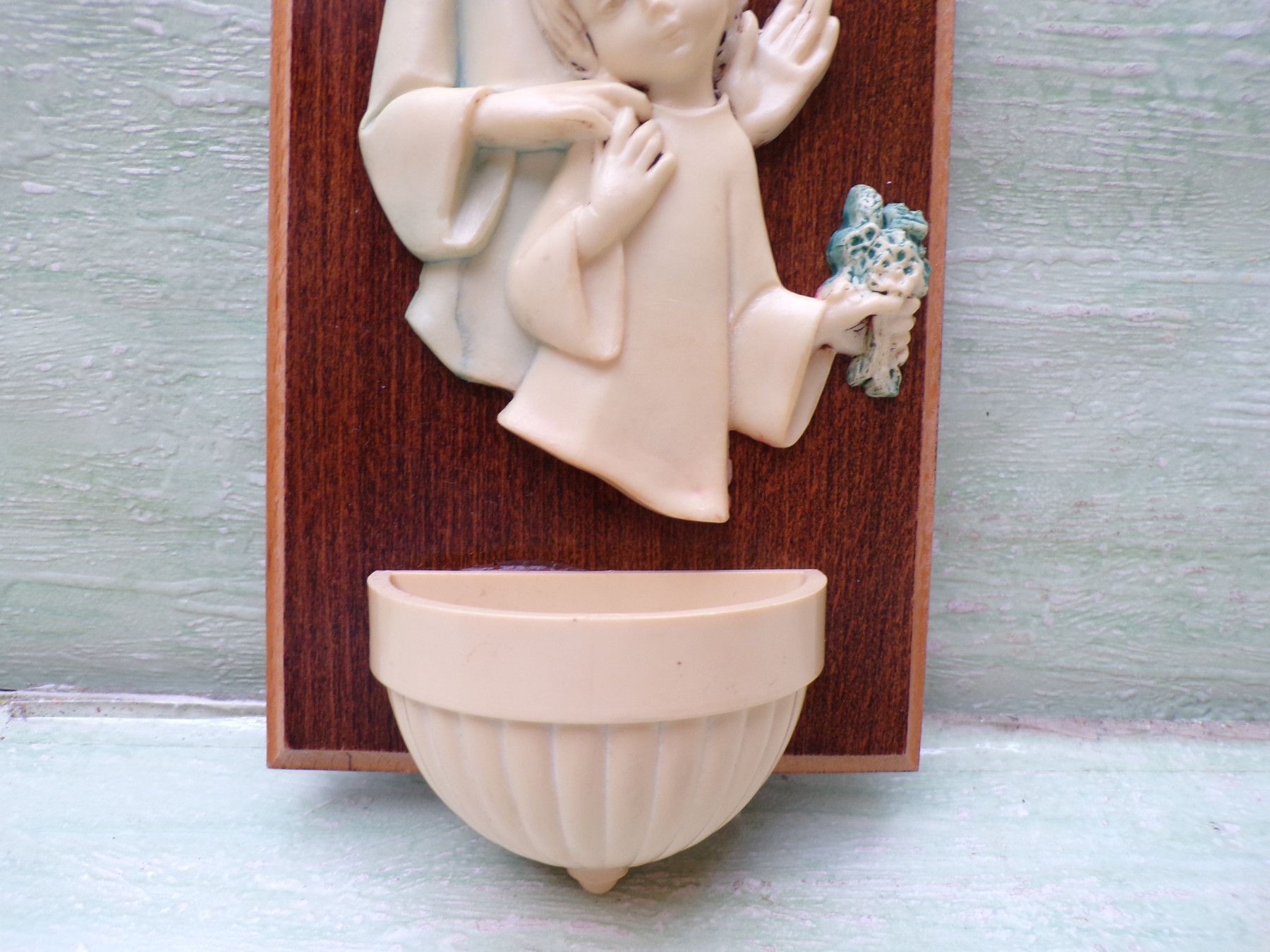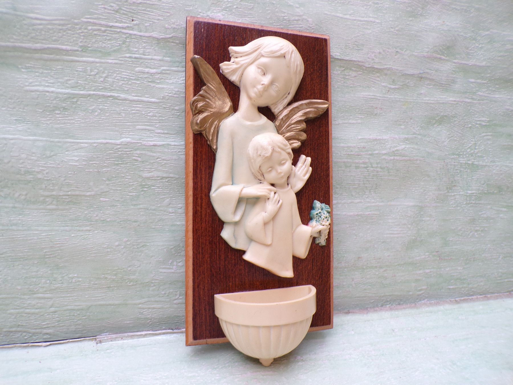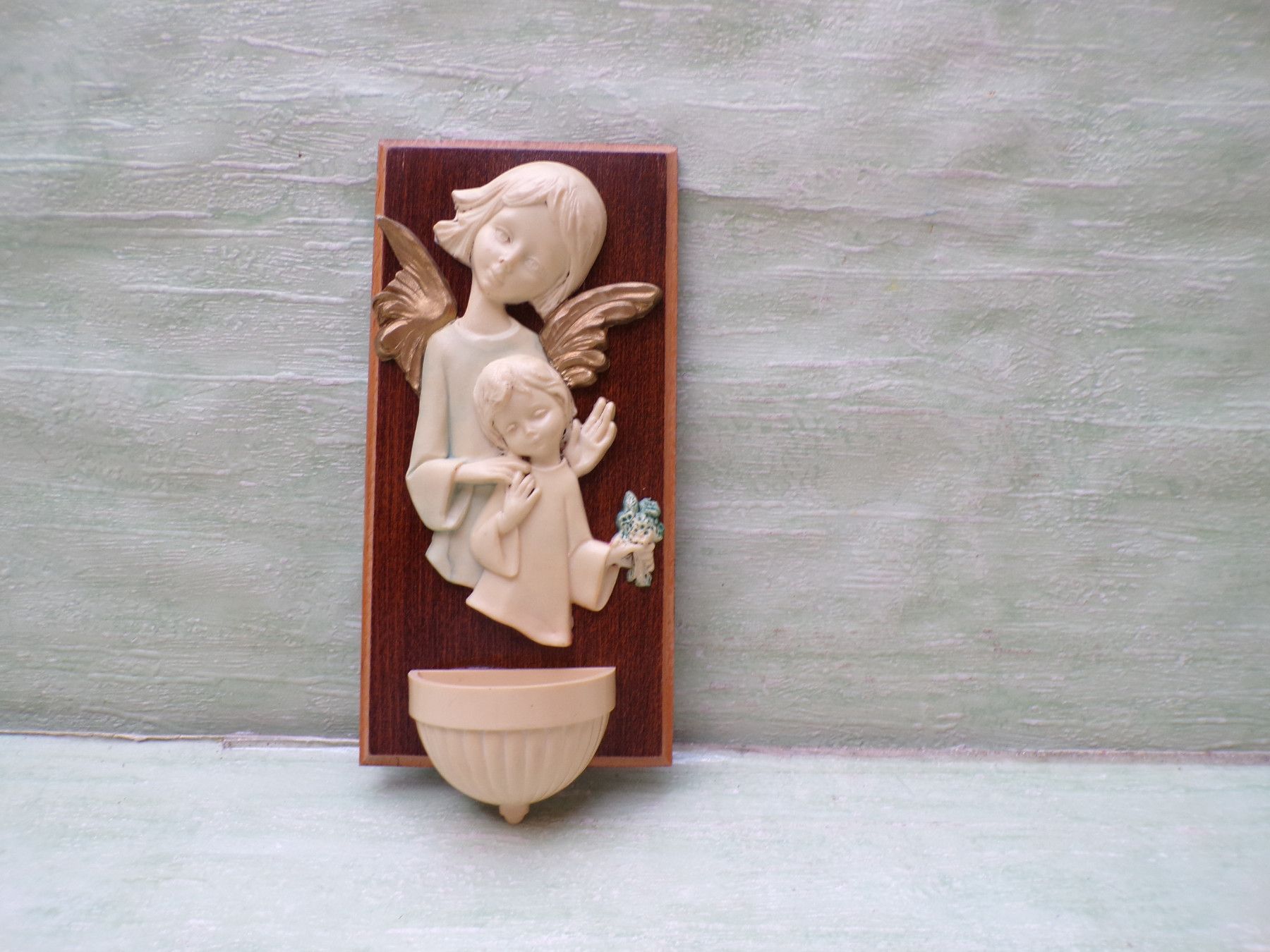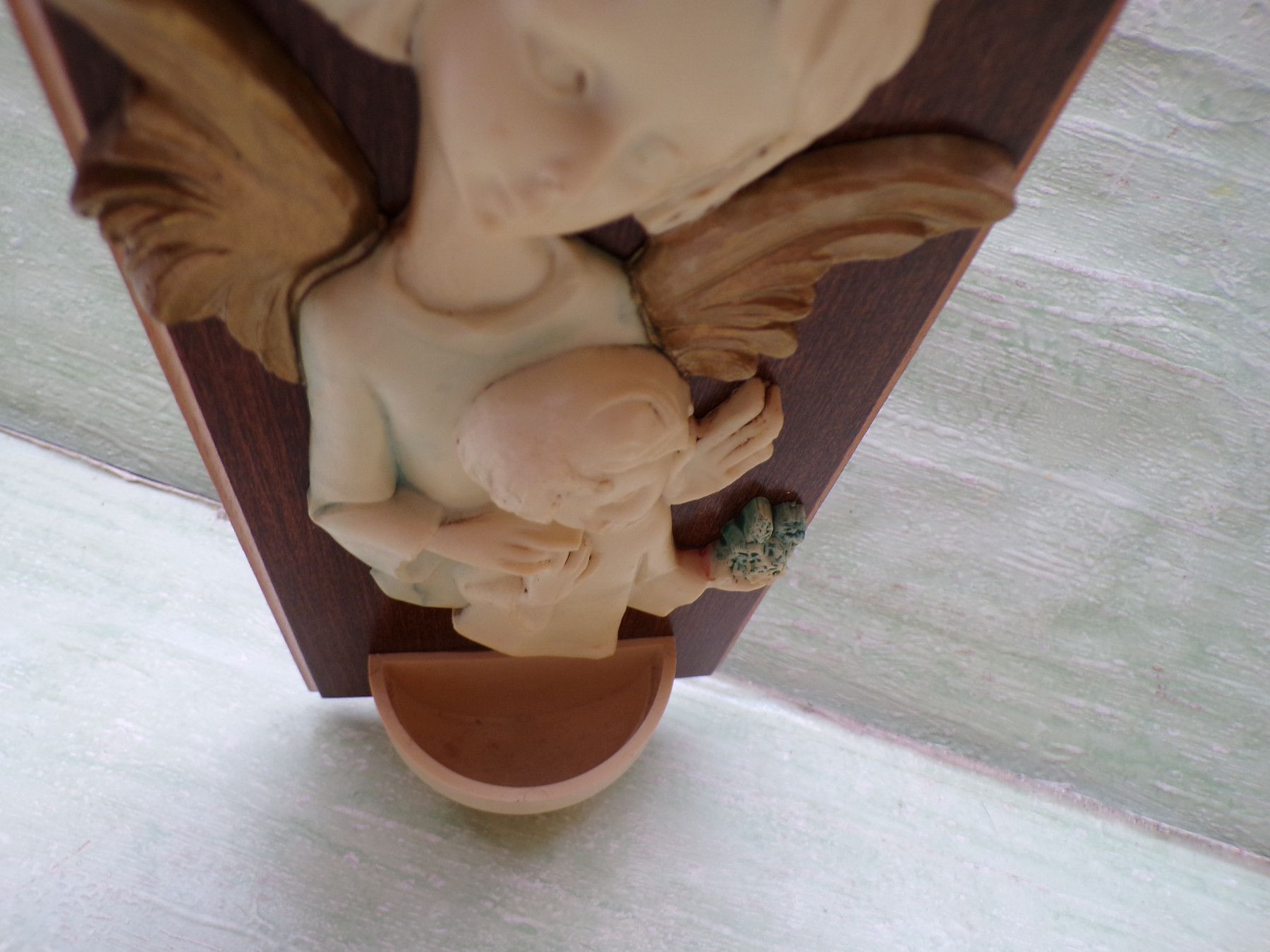 altes Weihwasserbecken Wandbild Engel Kind Bakelit Holz 23x11cm RAR