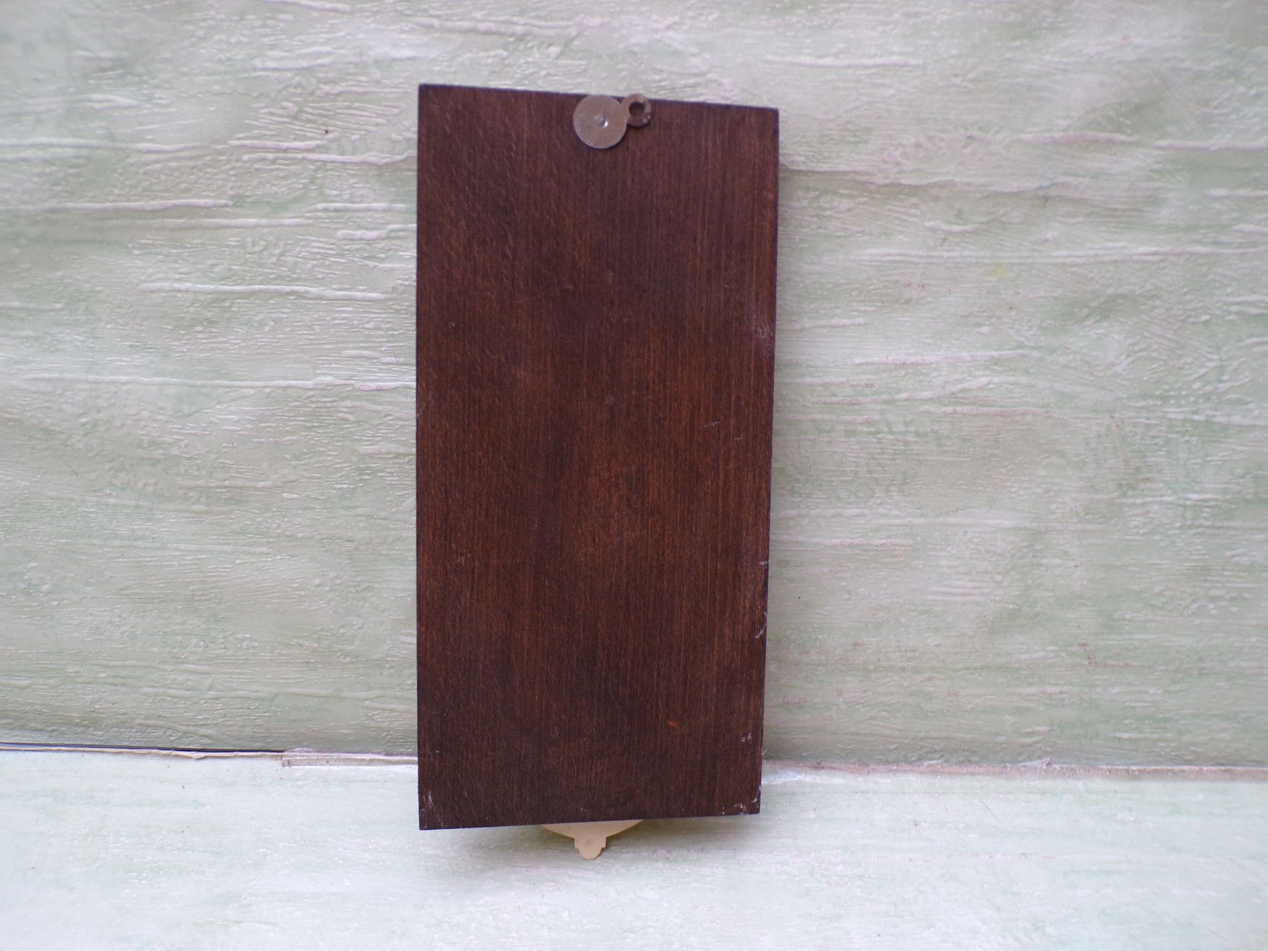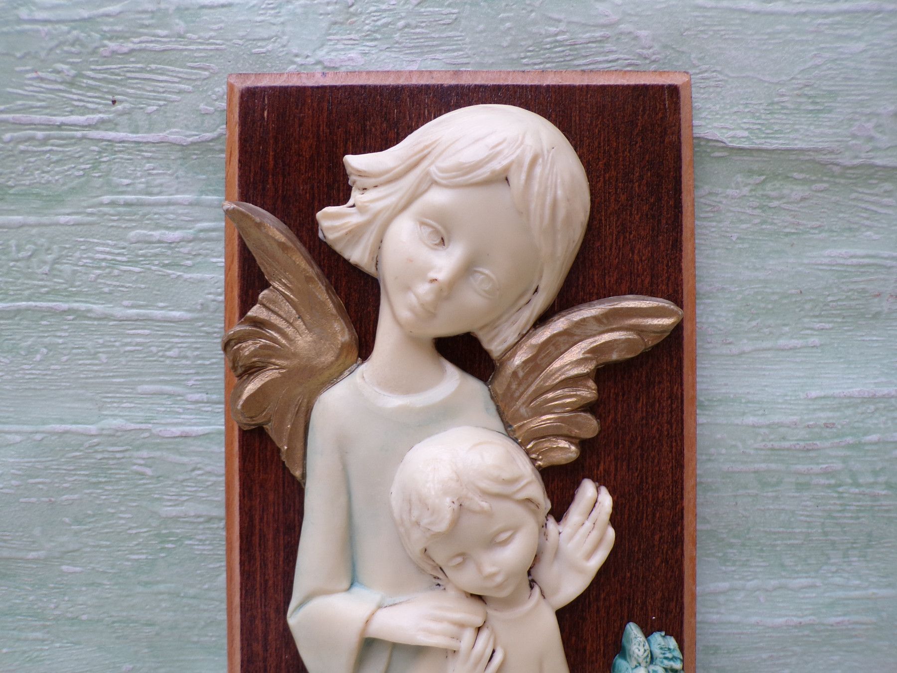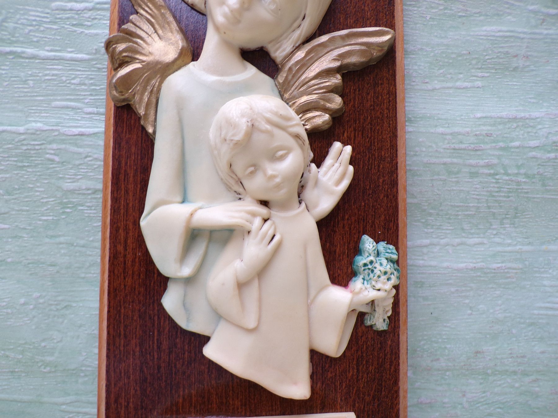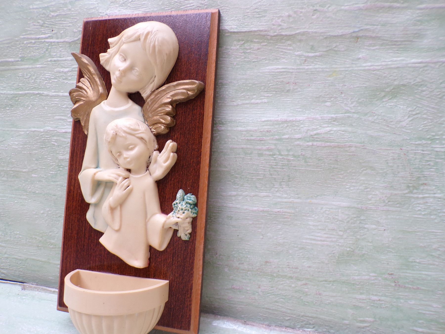 altes Weihwasserbecken Wandbild Engel Kind Bakelit Holz 23x11cm RAR