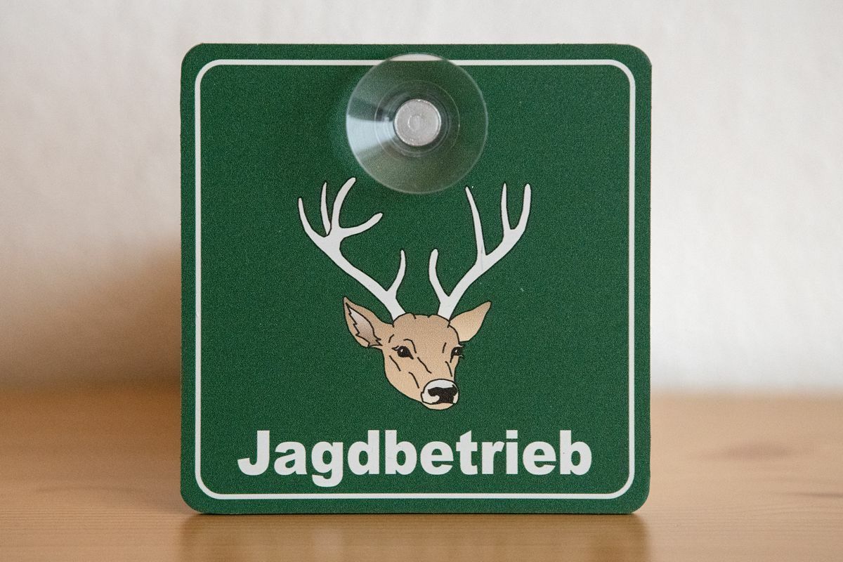 Aludibond-schild mit Saugnapf: Jagdbetrieb 10x10cm, Jagdschild fürs Auto